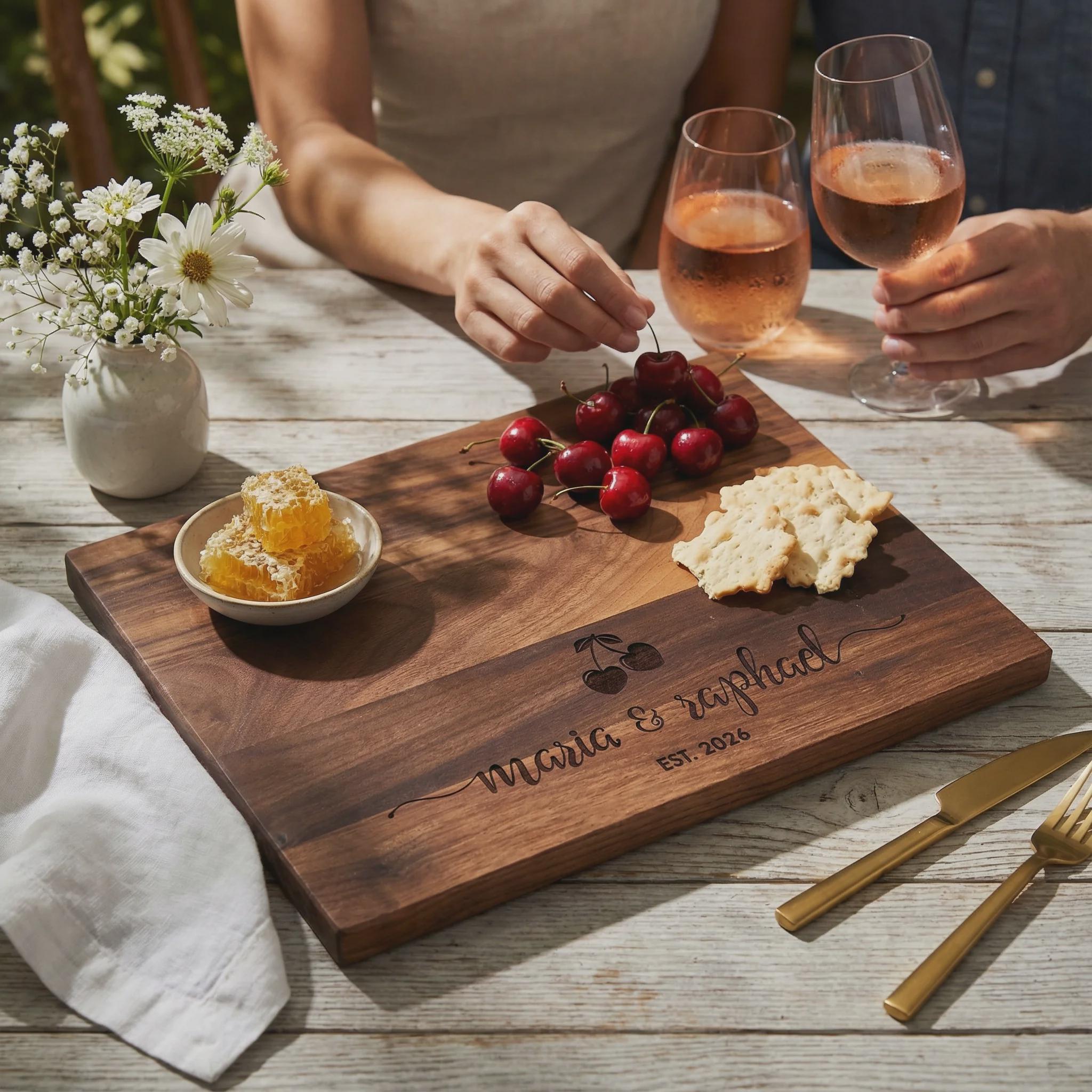 Celebrate your special milestone with this elegant handcrafted walnut charcuterie board, featuring a charming laser-engraved cherry fruit motif and your custom "Established 2026" date. This rich, dark wood serving tray provides the perfect backdrop for romantic wine and cheese nights, making it a timeless anniversary keepsake or unique wedding present for your favorite couple. Durable and food-safe, it’s a functional piece of art that brings a personalized, gourmet touch to any home kitchen or summer garden party.