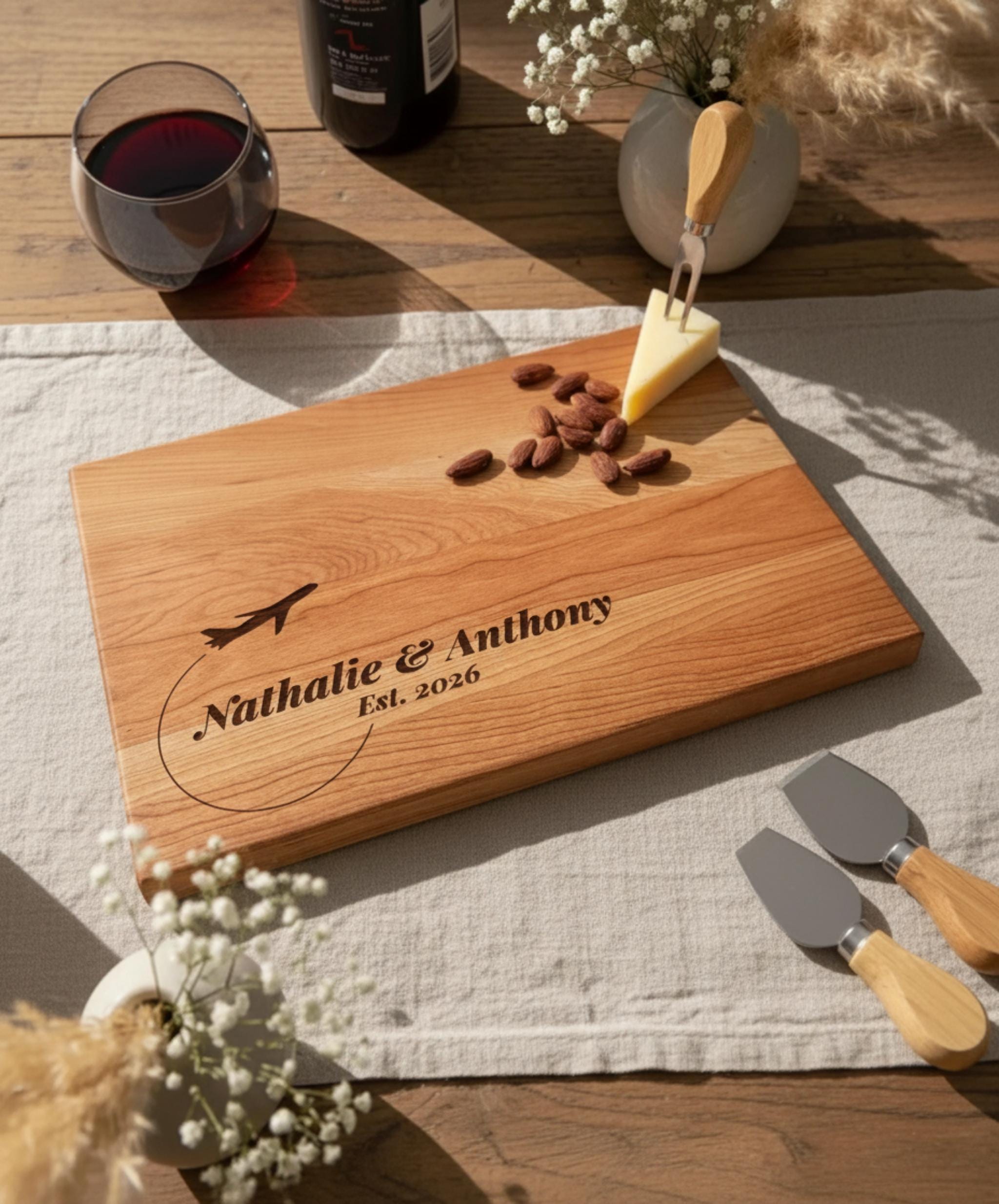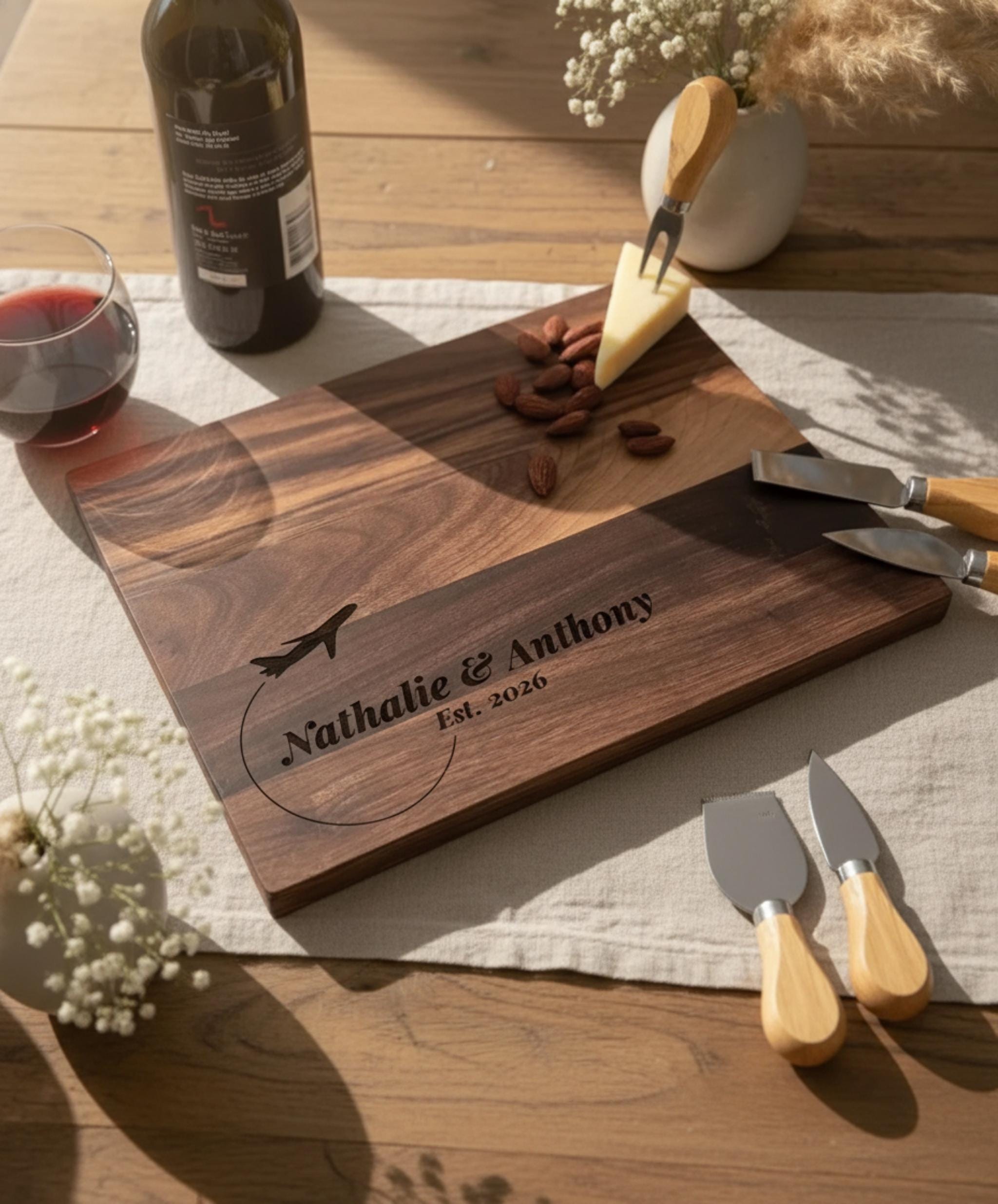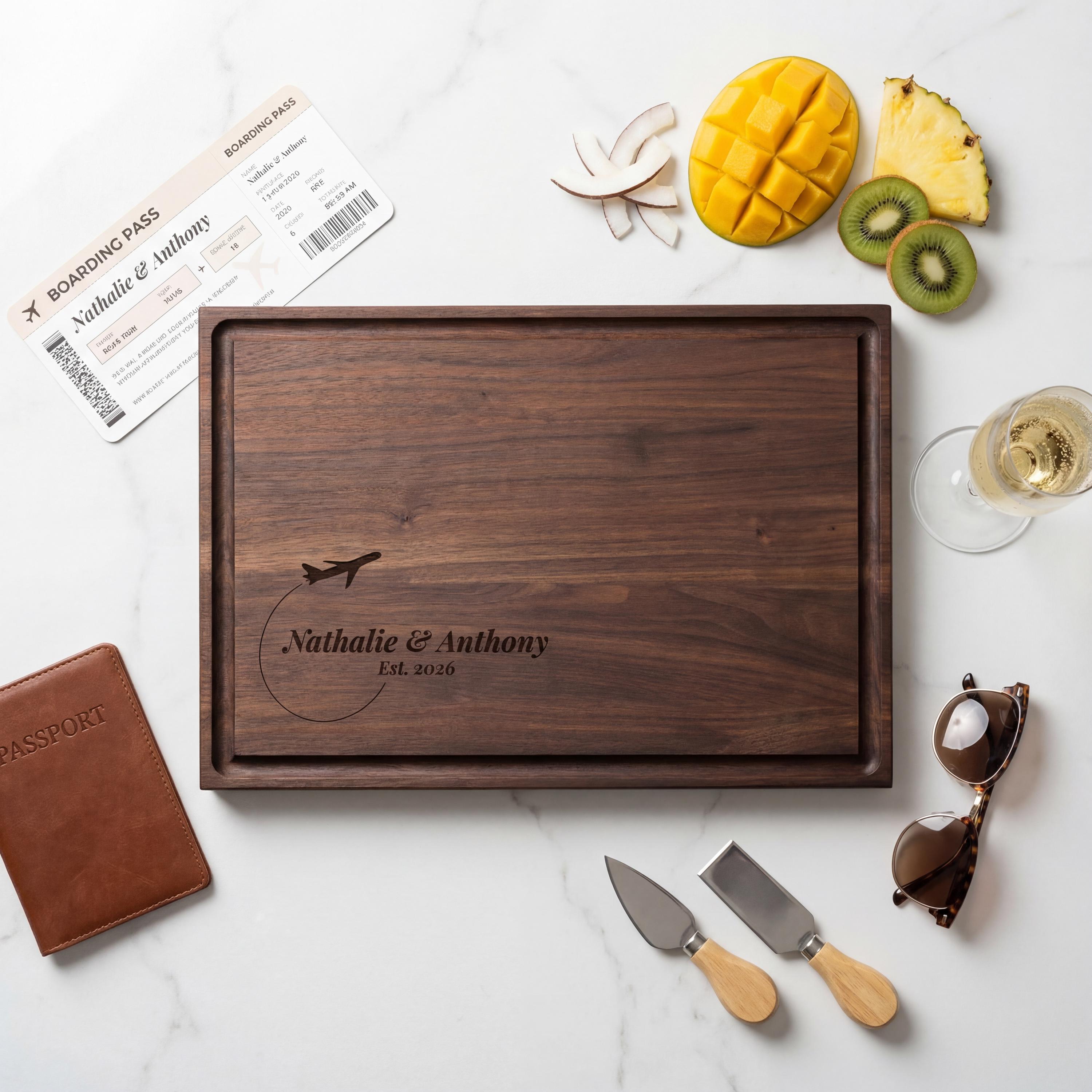 Personalized Charcuterie Board – Travel Lover Couple: Custom Cutting Board | Destination Wedding, Airplane, Flying, Pilot, Explorer Gift