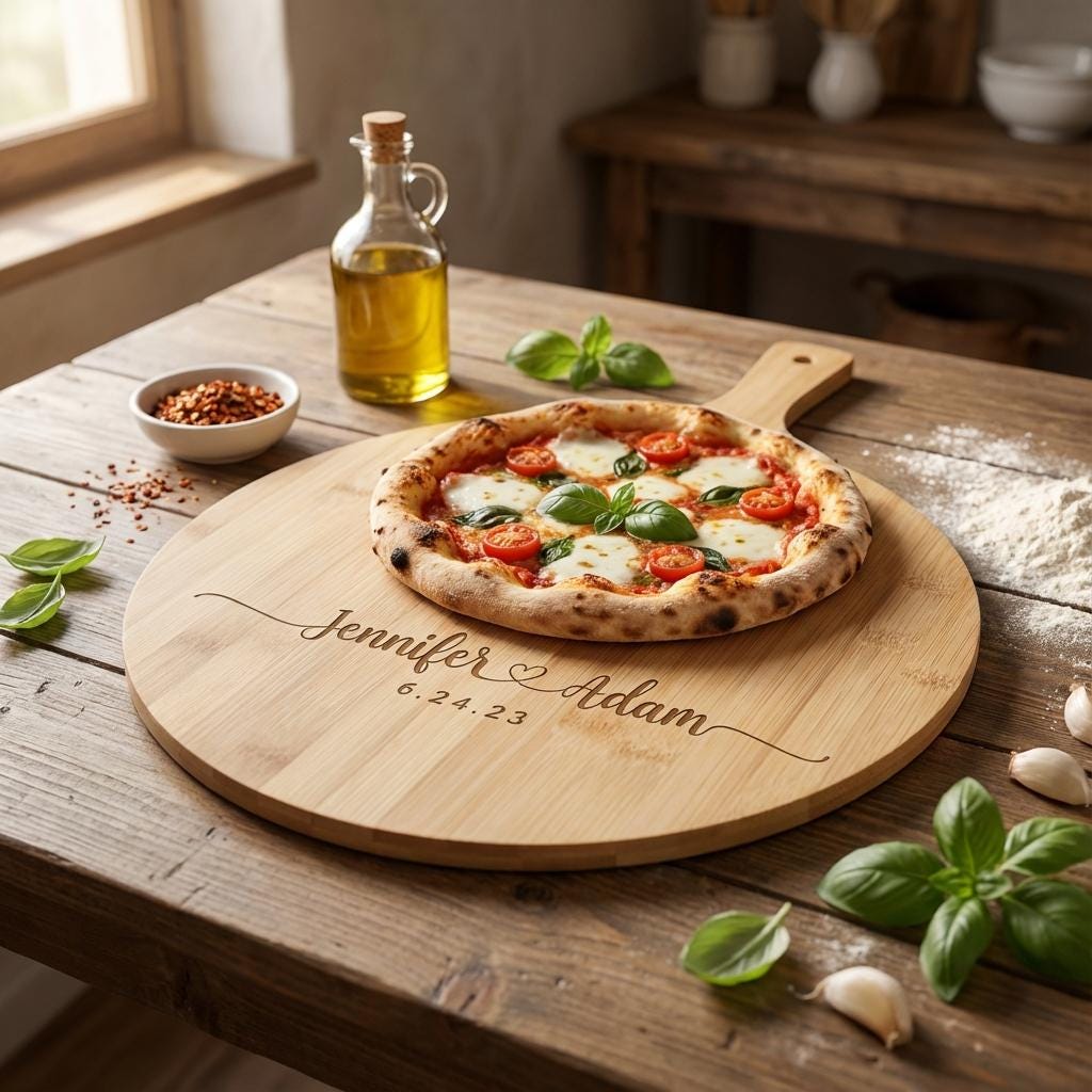 Personalized Bamboo Pizza Board, Custom Engraved with Names & Date, Wedding Engagement Housewarming Gift, Kitchen Decor
