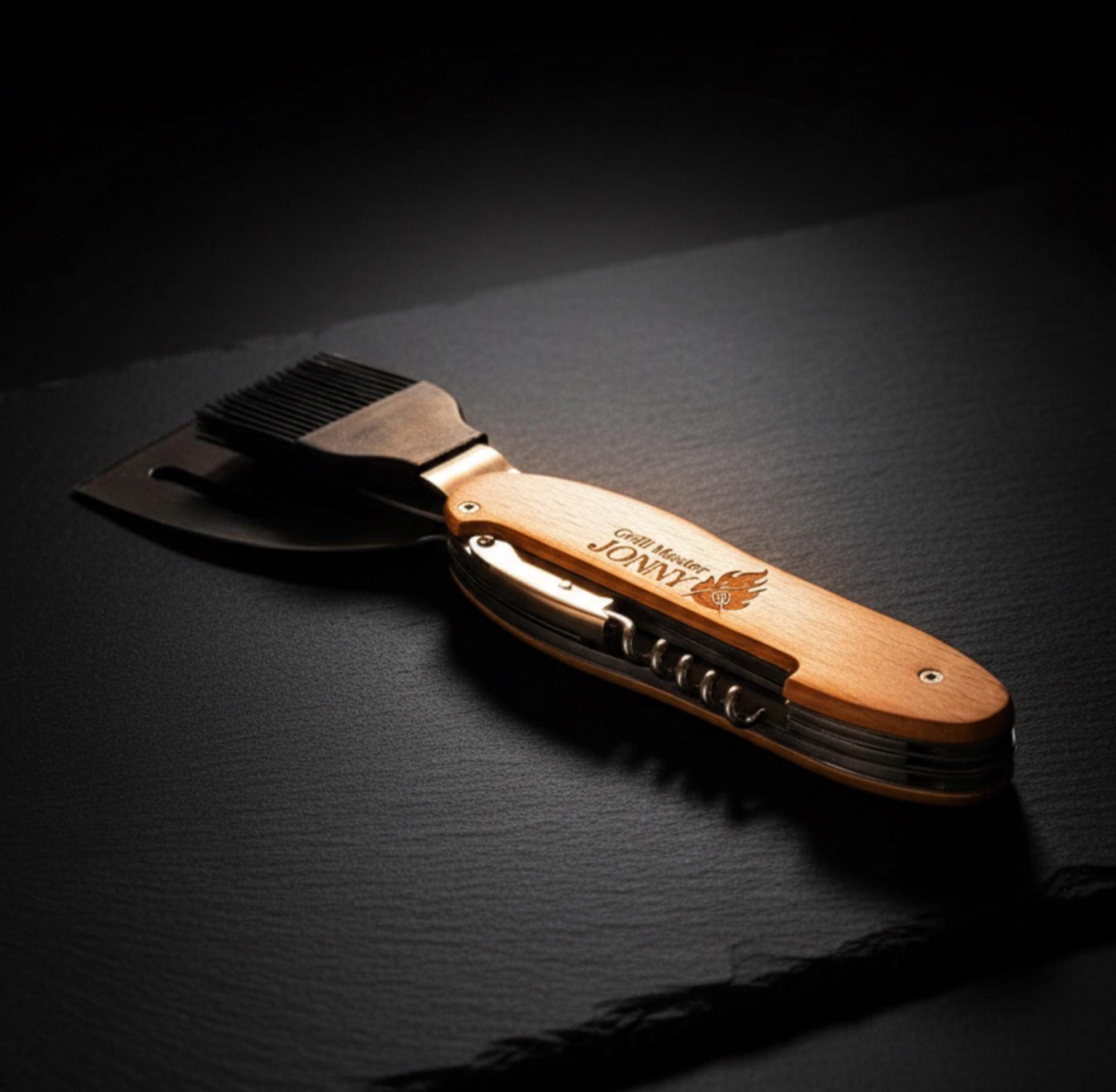 Features a multi-purpose tool including a spatula, fork, basting brush, corkscrew, and bottle opener, all folded into an ergonomic handle