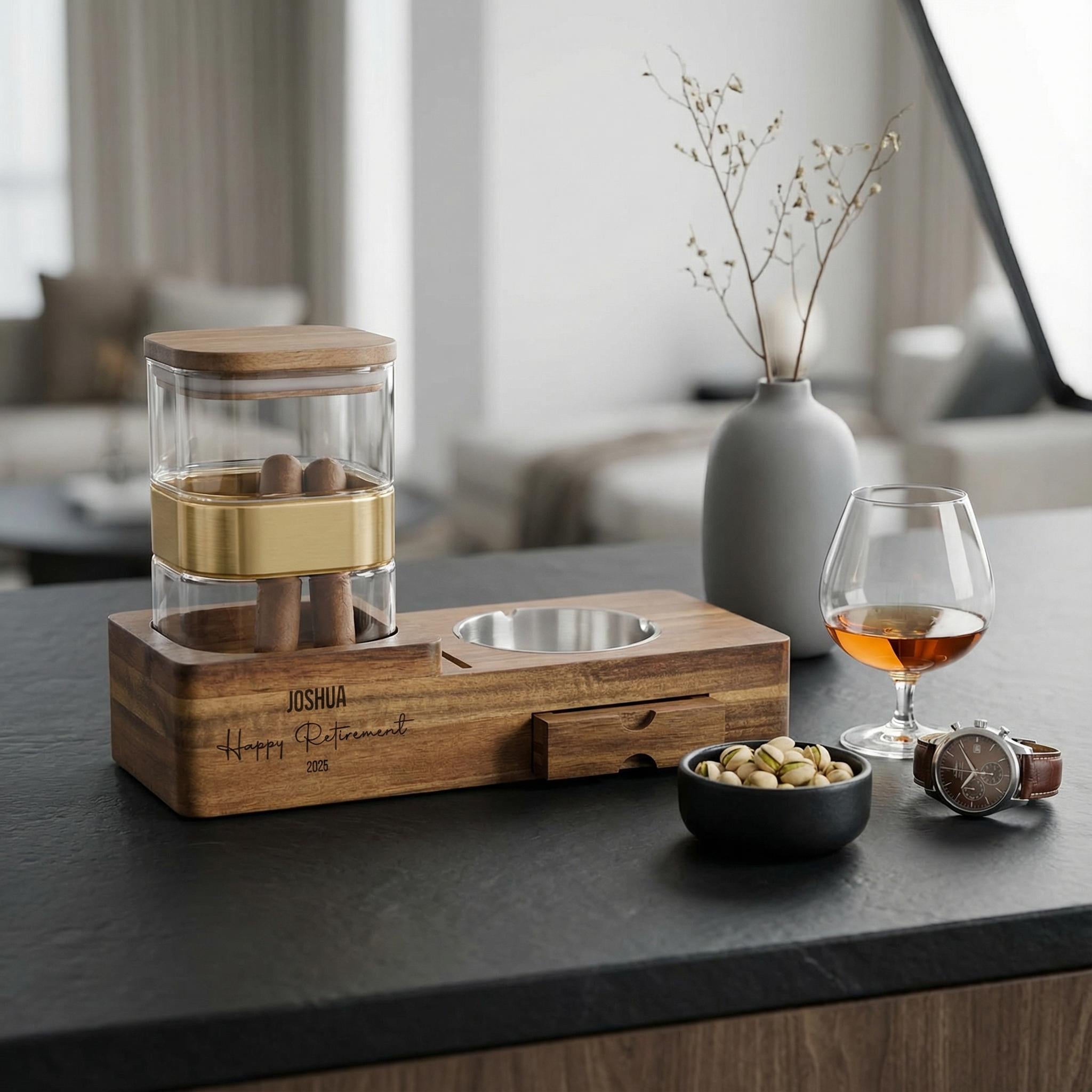 Elevate his smoking ritual with this luxury personalized acacia wood cigar station, a sophisticated centerpiece for any office or den. This comprehensive set features a high-capacity humidor jar with a matching wood lid for tobacco freshness, a removable stainless steel ashtray insert, and a sleek integrated drawer for lighters or cutters. Expertly laser-engraved with names and special dates, it serves as a meaningful retirement keepsake or milestone anniversary surprise for the connoisseur in your life. Crafted from rich, sustainable wood and finished with elegant gold accents, this all-in-one smoking organizer balances high-end functionality with a timeless aesthetic that any husband or colleague will cherish.