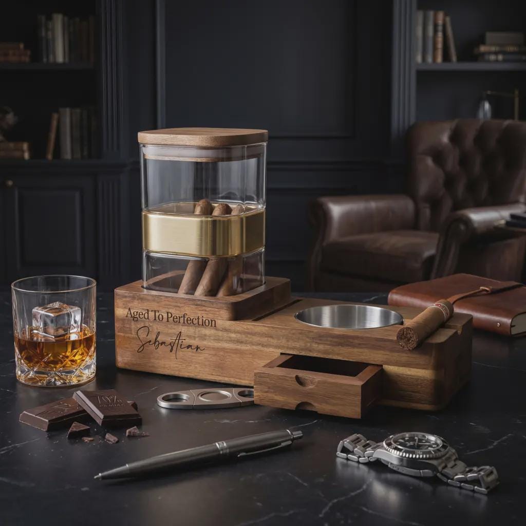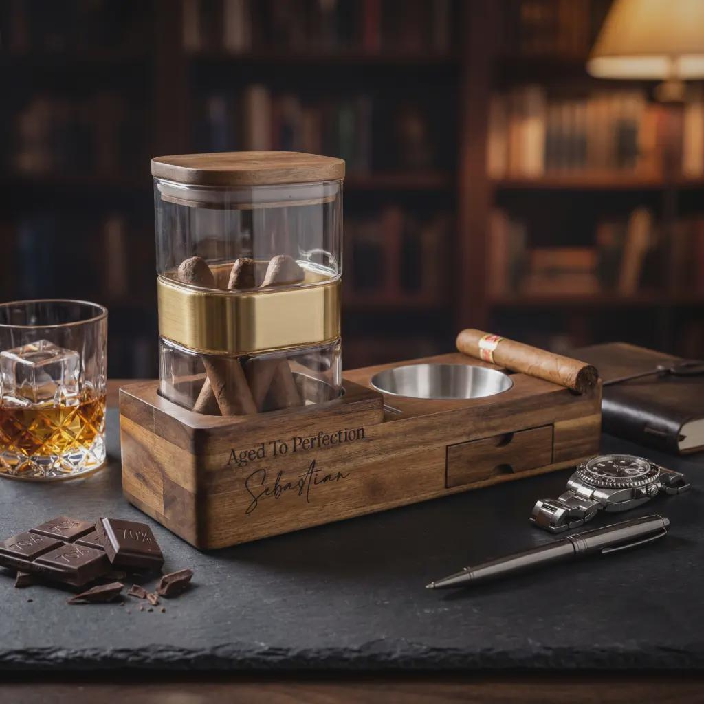 Celebrate timeless style and refined taste with this Personalized Cigar Ashtray and Humidor Set, custom engraved with a name and meaningful message such as Aged to Perfection. Crafted from premium wood and glass, this elegant smoking accessory set is designed for cigar enthusiasts who appreciate quality and personalization. Ideal as a gift for a husband, father, or colleague, it makes a distinguished present for birthdays, retirements, anniversaries, or special milestones.