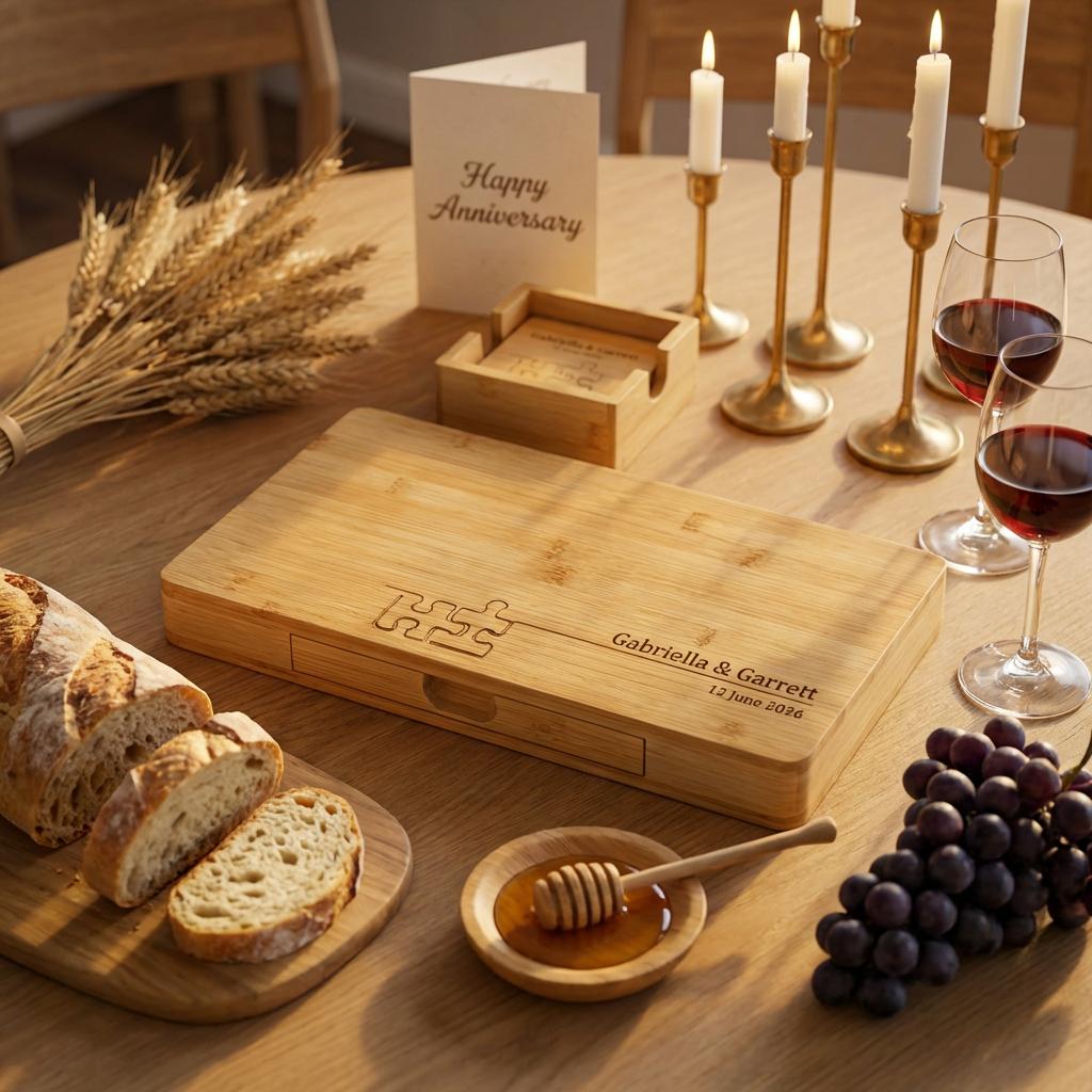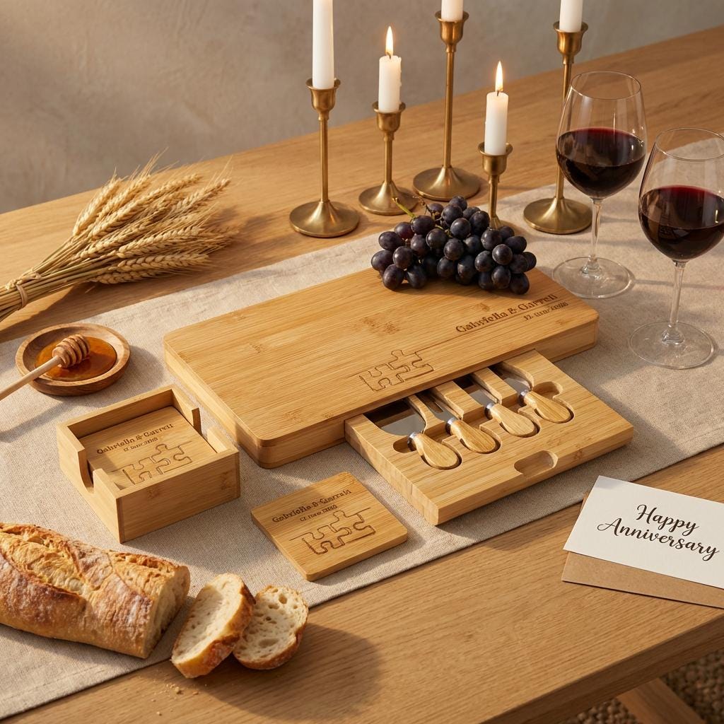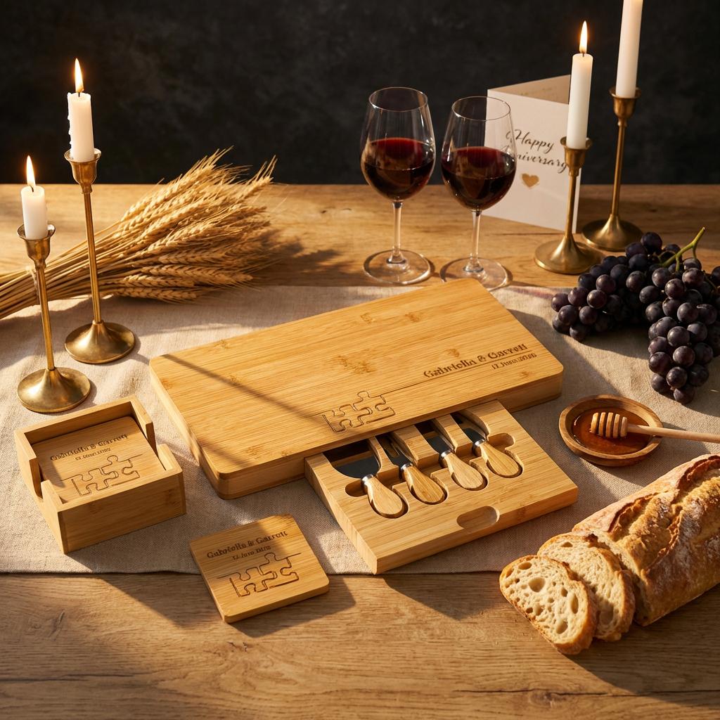 Show them they are the "perfect fit" for each other with this symbolic bamboo cheese board set. Featuring an interlocking puzzle piece design that represents connection and unity, this functional serving station comes with a hidden knife drawer and matching coasters. Engraved with the couple's names and their special date, it is a romantic and sustainable way to celebrate a union. Whether used for intimate date nights or hosting friends, this set makes a memorable engagement surprise or a sentimental 5th-anniversary keepsake.