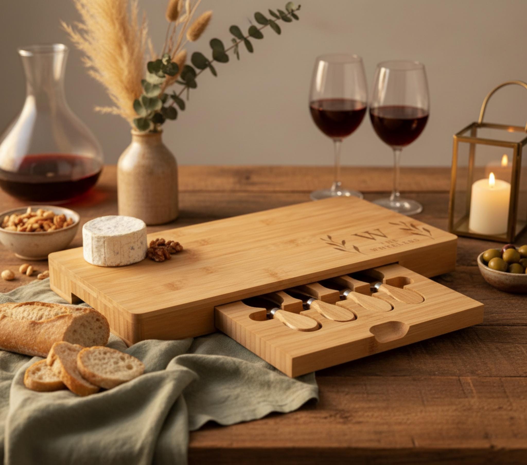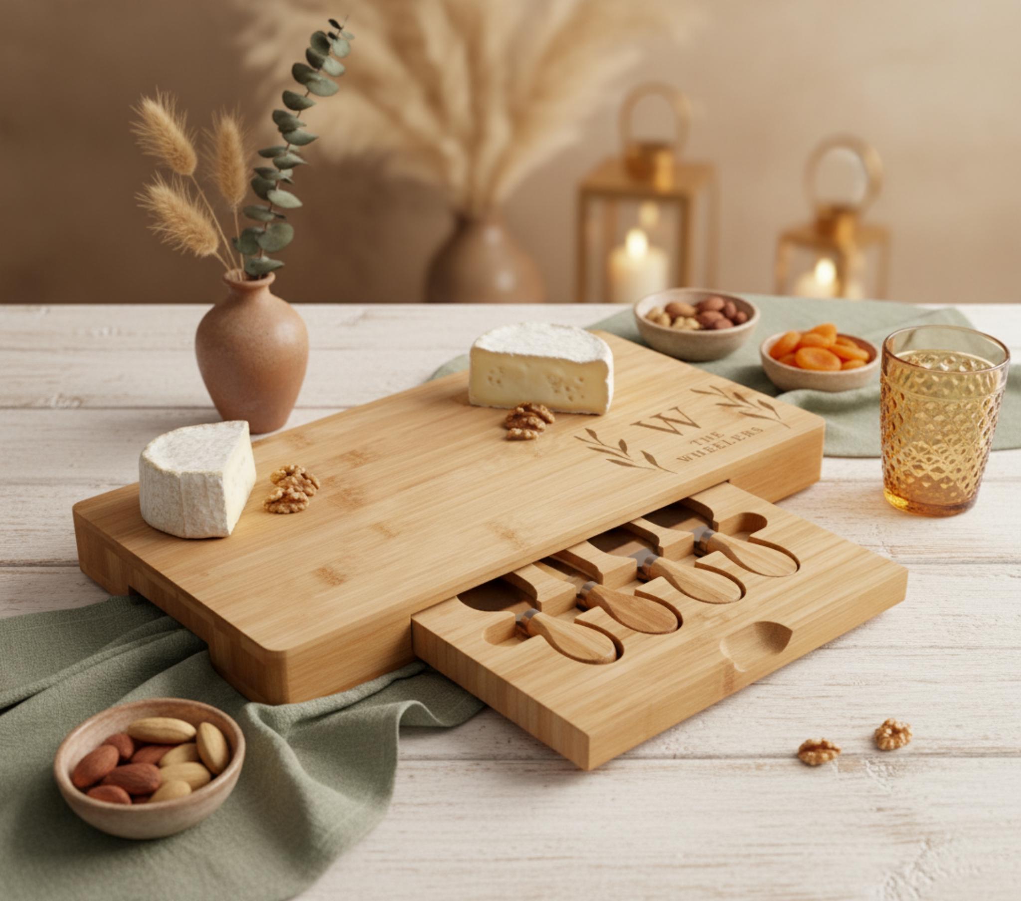 Personalized Bamboo Charcuterie Board Set: Engraved Cheese Board, Coasters