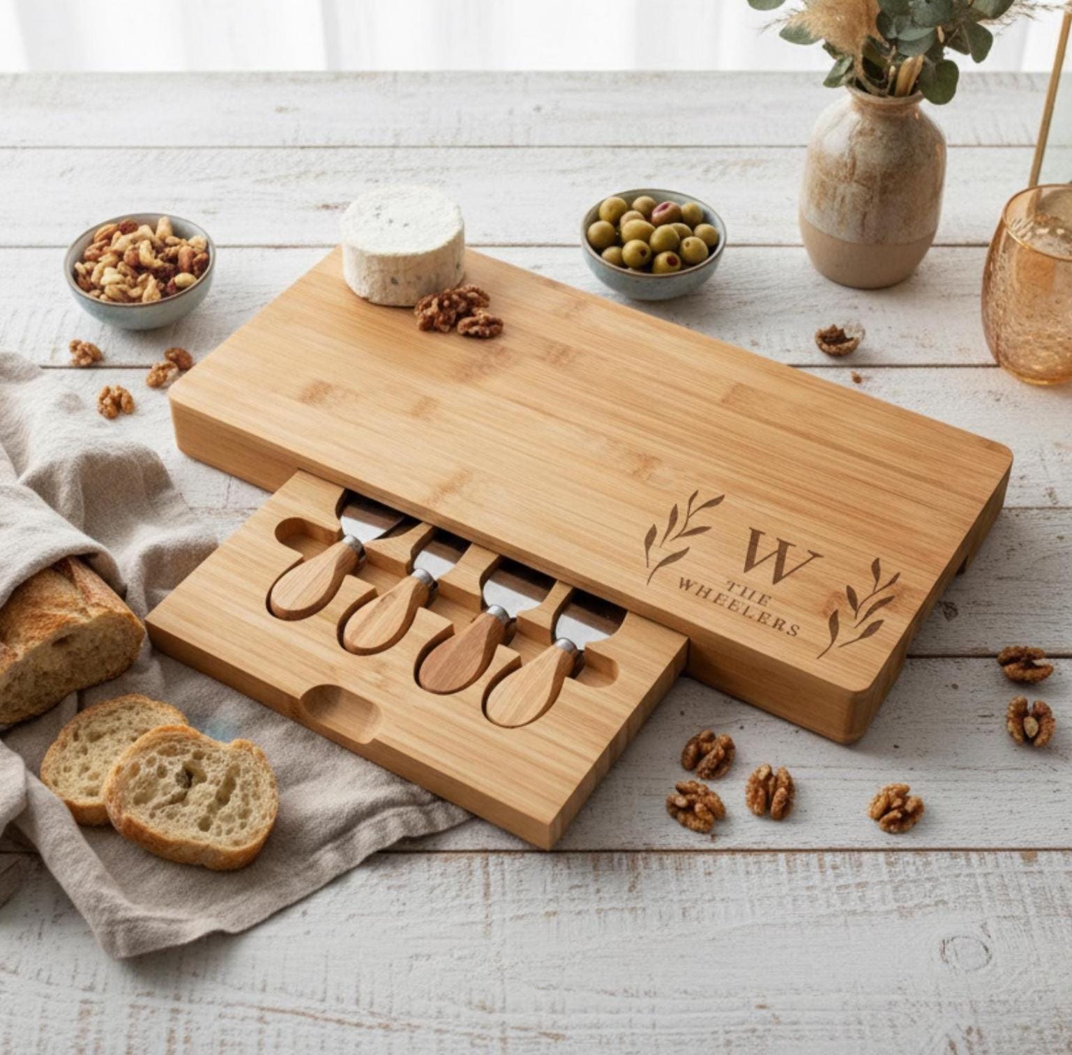 These personalized charcuterie boards are a perfect fusion of creativity and practicality, designed to elevate every celebration. Unleash your creativity and celebrate life’s special moments with our custom-engraved cheese board set. Crafted from eco-friendly materials, this personalized board serves as the perfect centerpiece for weddings, bridal showers, engagements, housewarmings, and everyday entertaining.