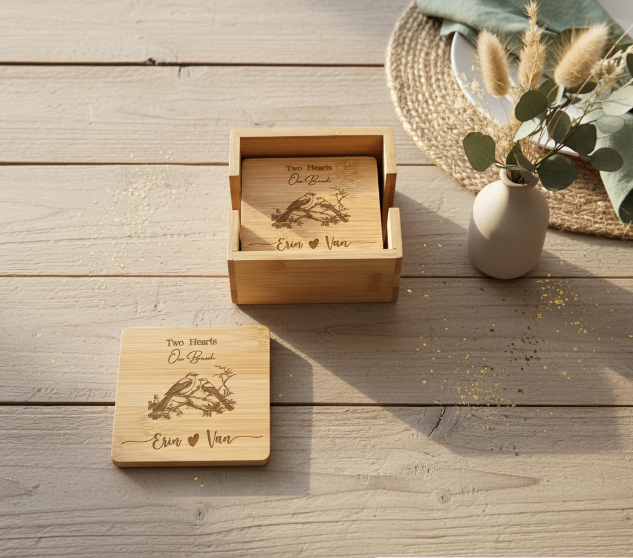 Pair the personalized board with the matching coaster set for a complete, sophisticated presentation.