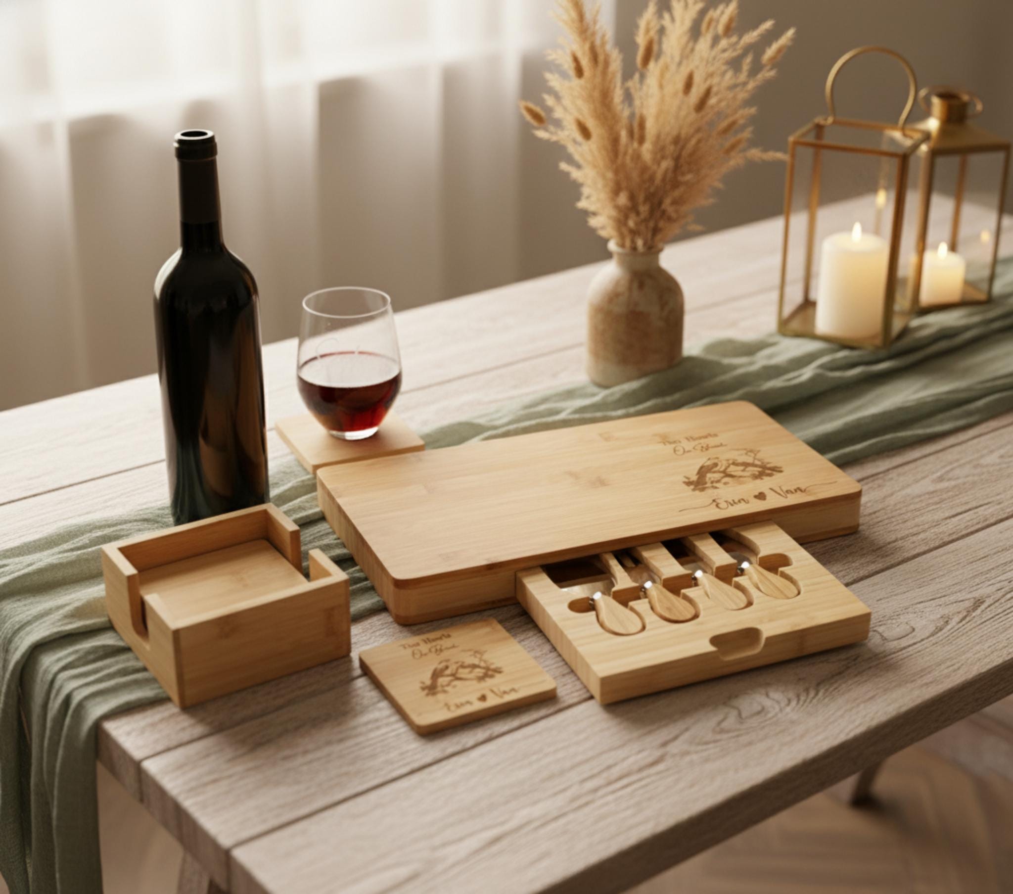 These personalized charcuterie boards are a perfect fusion of creativity and practicality, designed to elevate every celebration. Unleash your creativity and celebrate life’s special moments with our custom-engraved cheese board set. Crafted from eco-friendly materials, this personalized board serves as the perfect centerpiece for weddings, bridal showers, engagements, housewarmings, and everyday entertaining.
