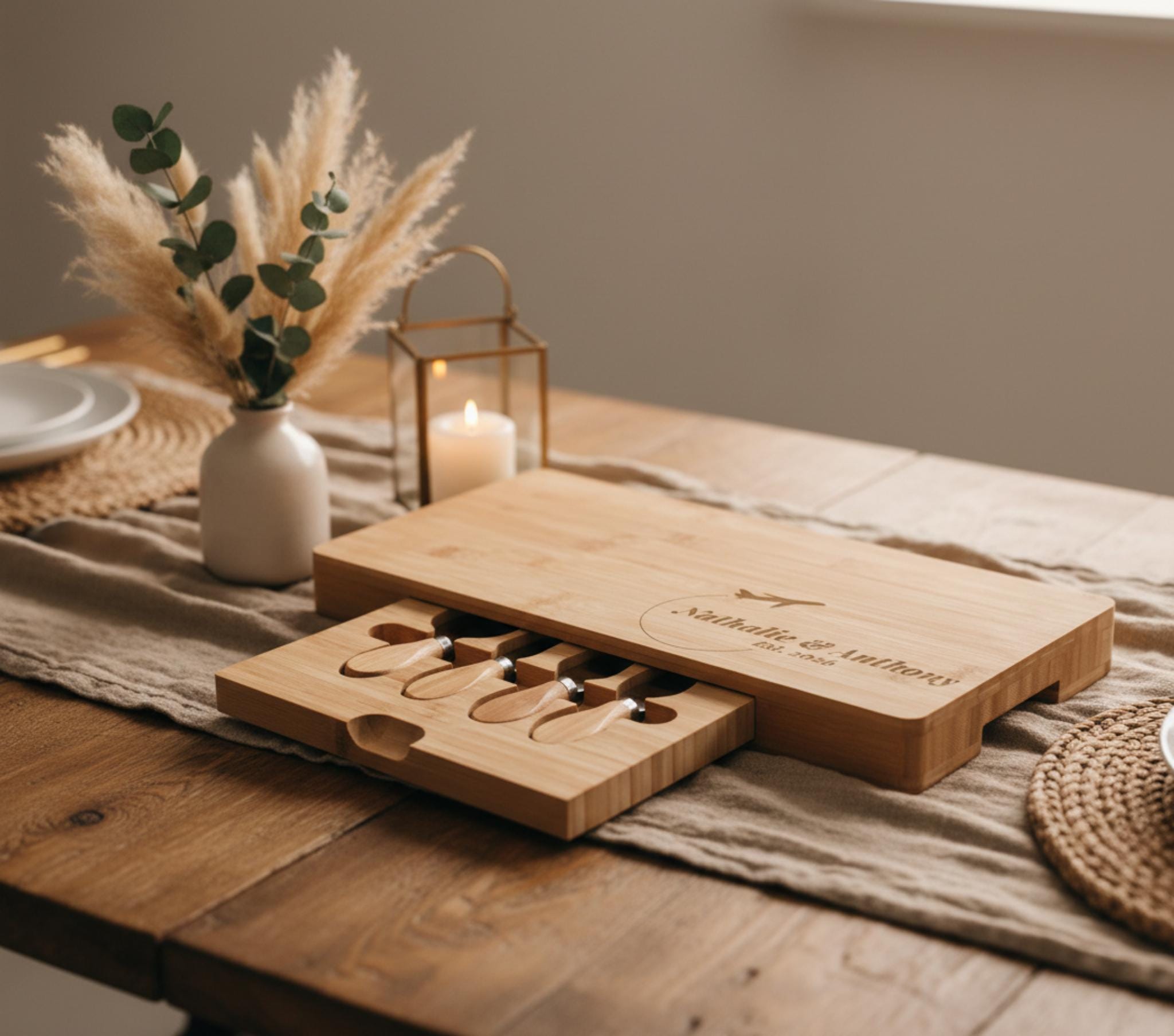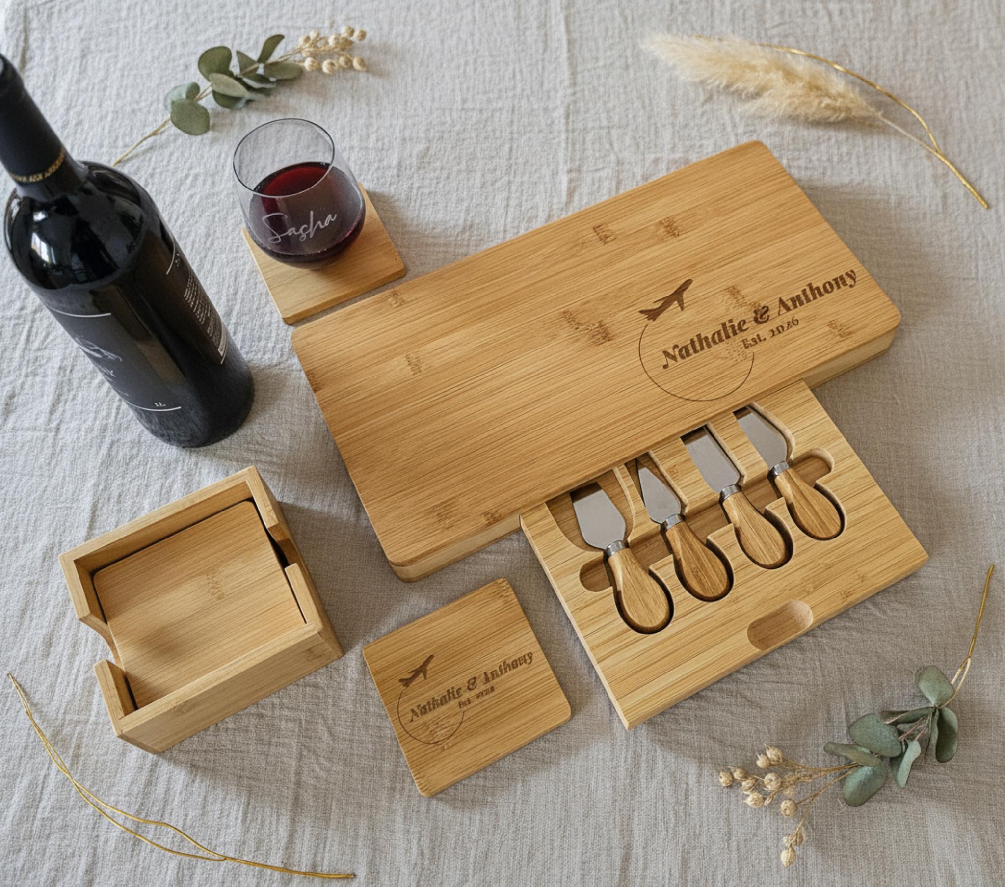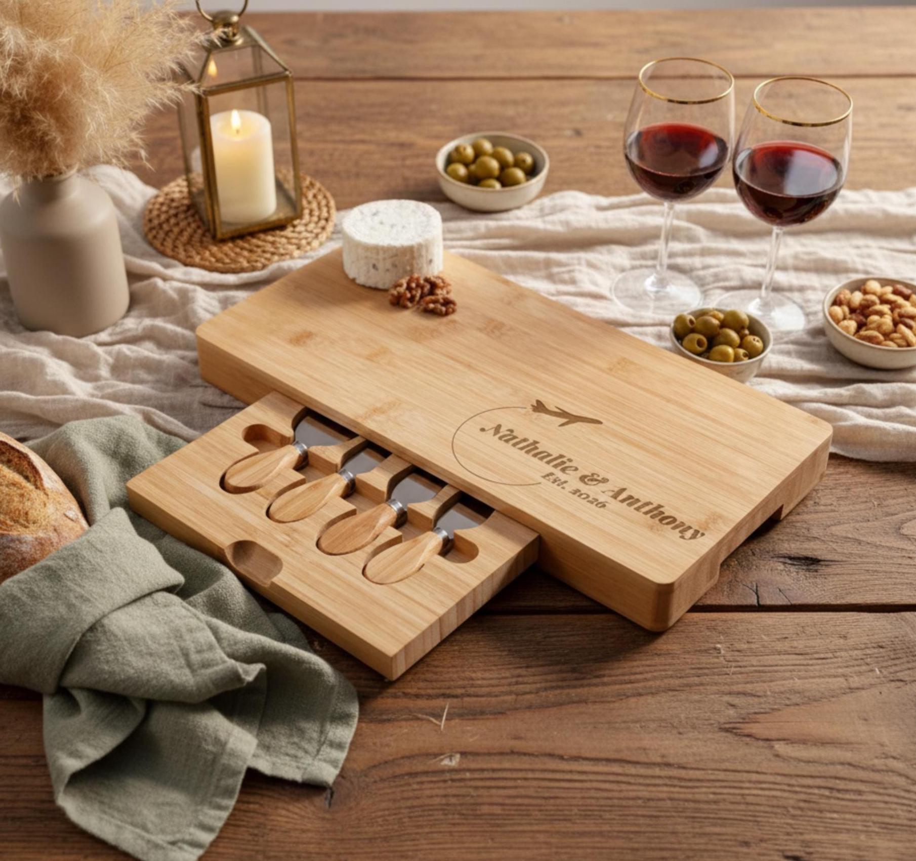 These personalized charcuterie boards are a perfect fusion of creativity and practicality, designed to elevate every celebration. Unleash your creativity and celebrate life’s special moments with our custom-engraved cheese board set. Crafted from eco-friendly materials, this personalized board serves as the perfect centerpiece for weddings, bridal showers, engagements, housewarmings, and everyday entertaining.
