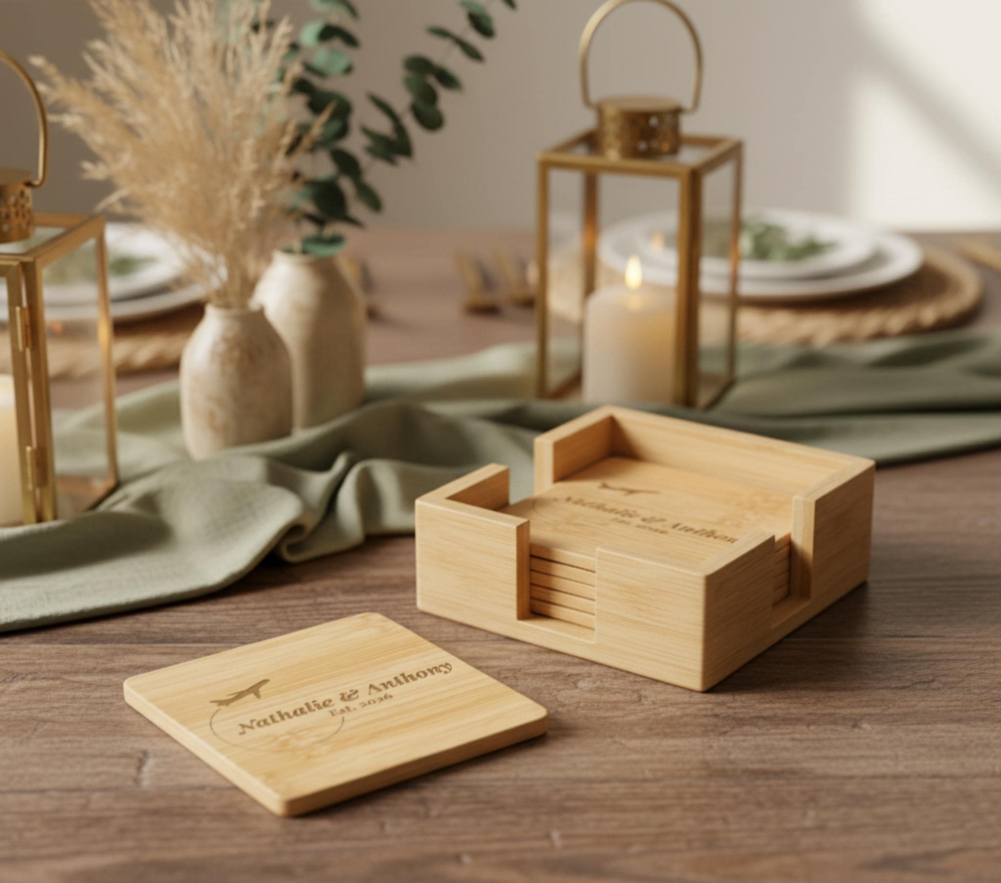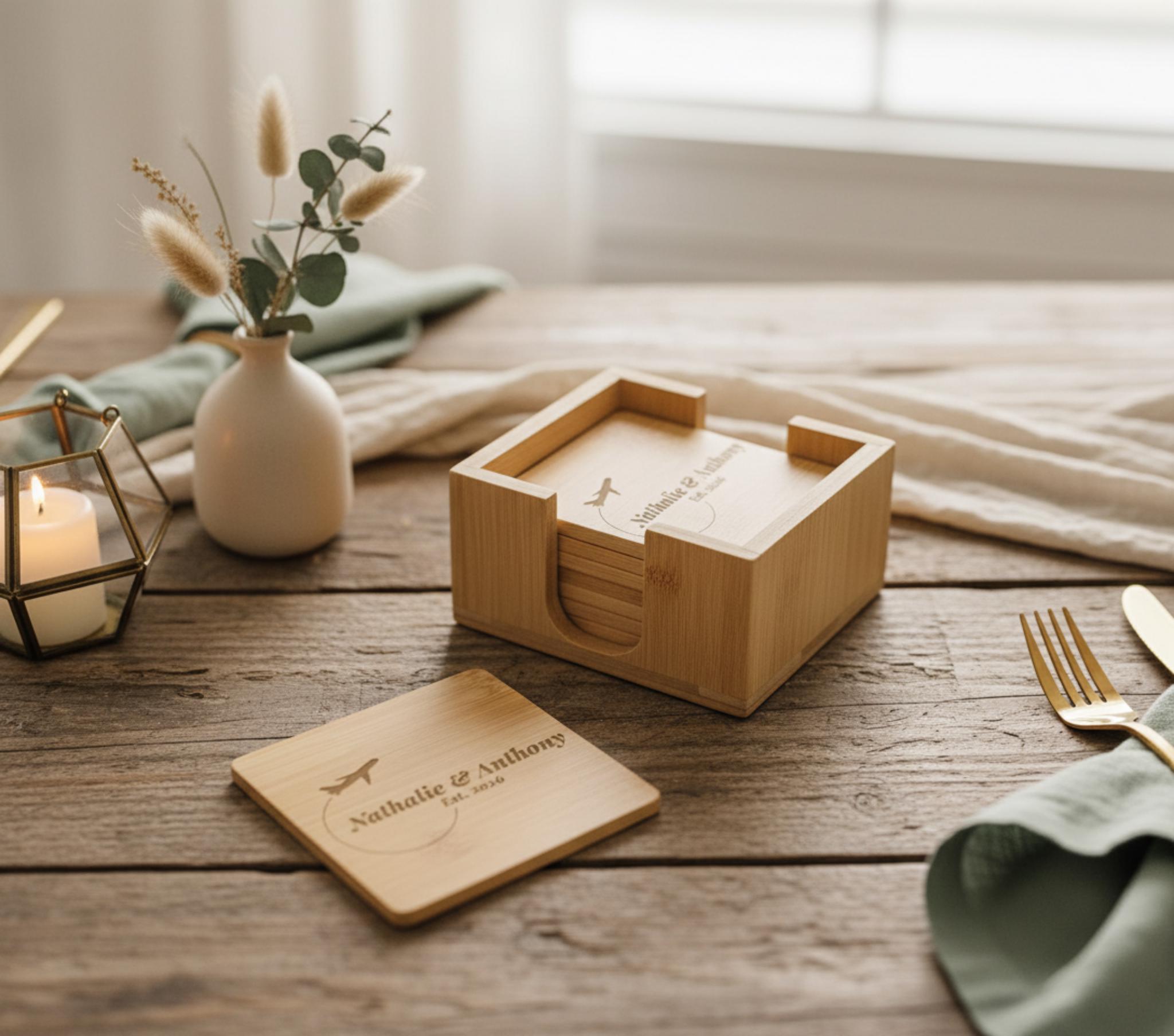 Pair the personalized board with the matching coaster set for a complete, sophisticated presentation.