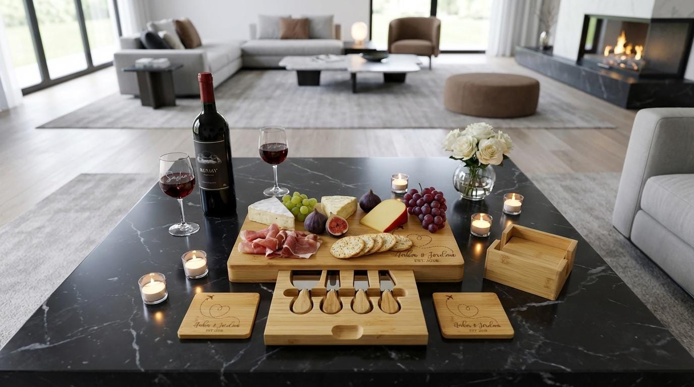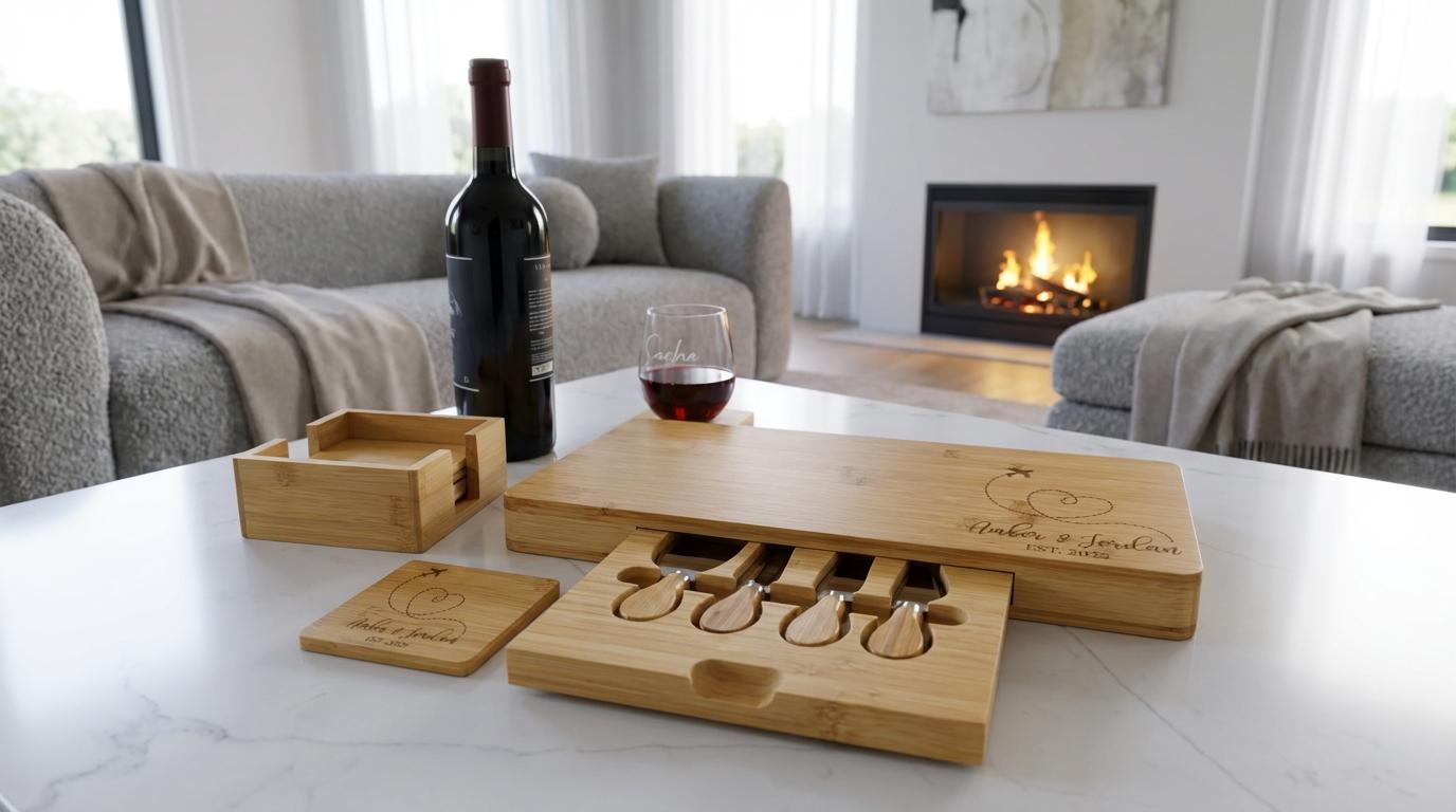 Pair the personalized board with the matching coaster set for a complete, sophisticated presentation.