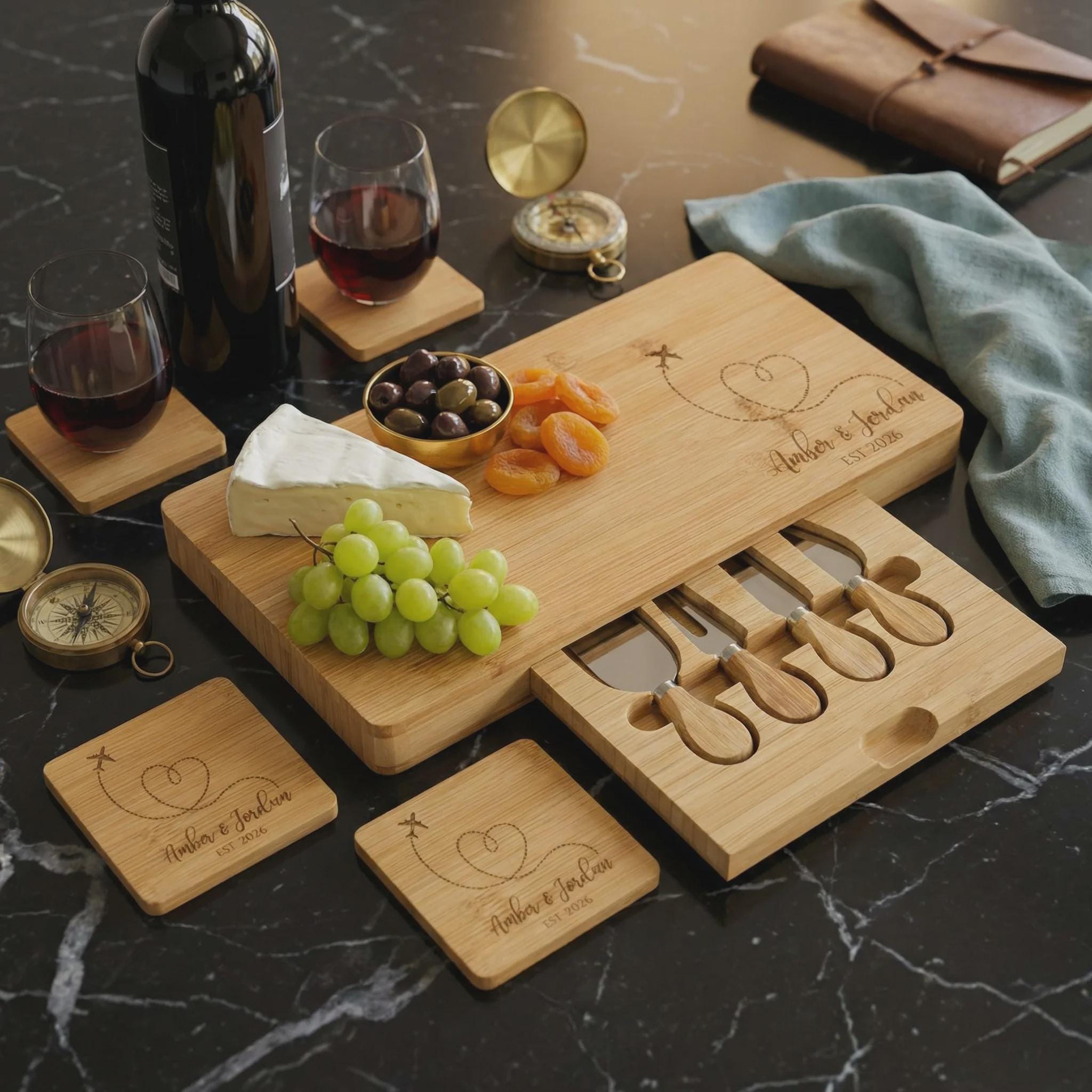 Commemorate their greatest adventure yet with this travel-themed bamboo charcuterie board set. Featuring a whimsical airplane heart trail design, this sustainable serving platter is the perfect keepsake for the couple with wanderlust. The set includes a hidden slide-out drawer with four stainless steel cheese knives and features matching coasters to complete the look. Personalized with their names and established date, it makes a unique centerpiece for a destination wedding, a honeymoon memento, or a "Bon Voyage" party.