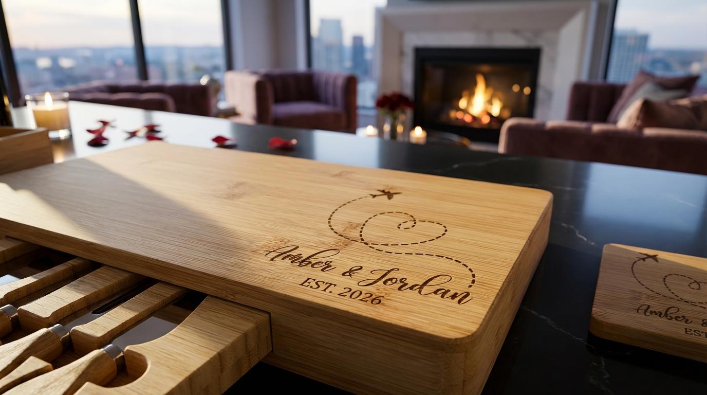 Personalized Bamboo Charcuterie Board Set – Destination Wedding: Custom Engraved Cheese Board, World Explorer, Couple Gift
