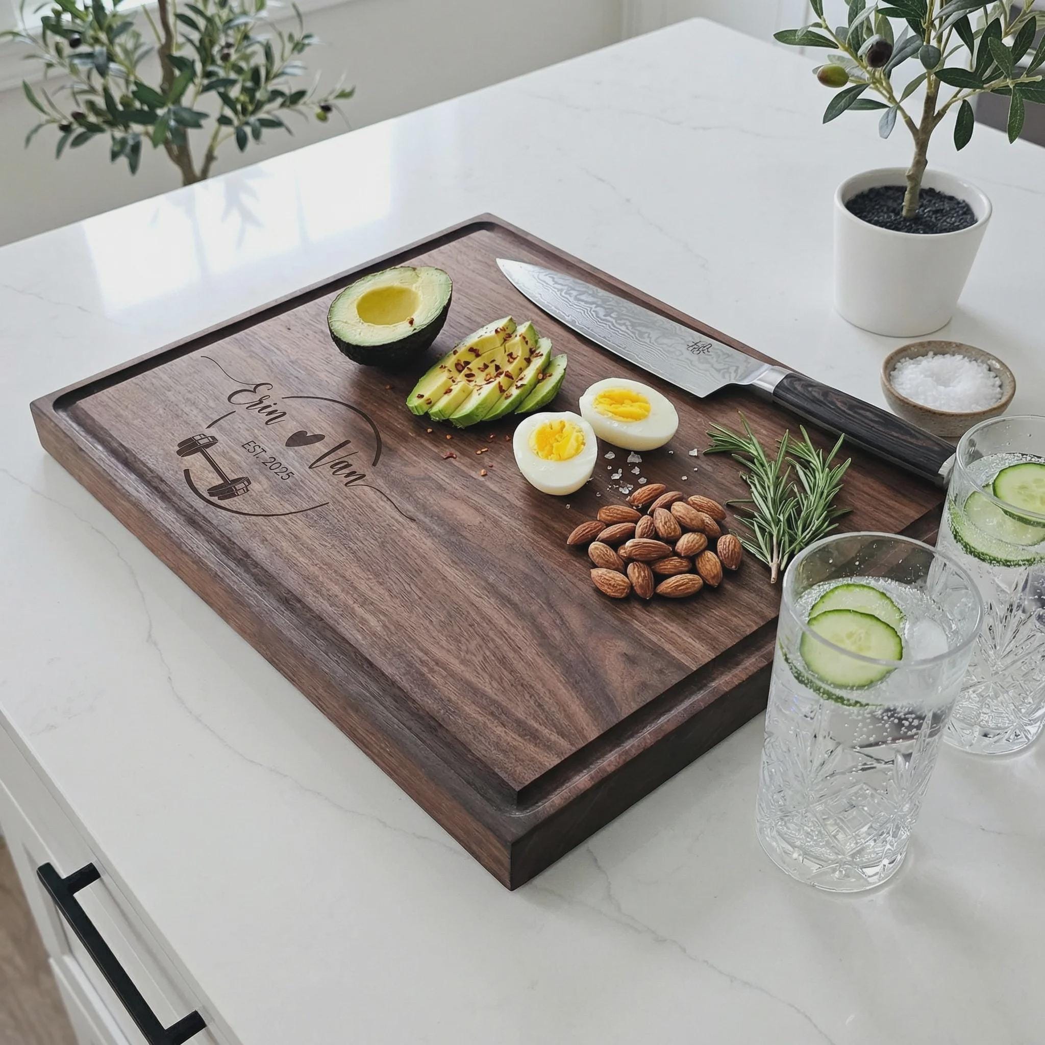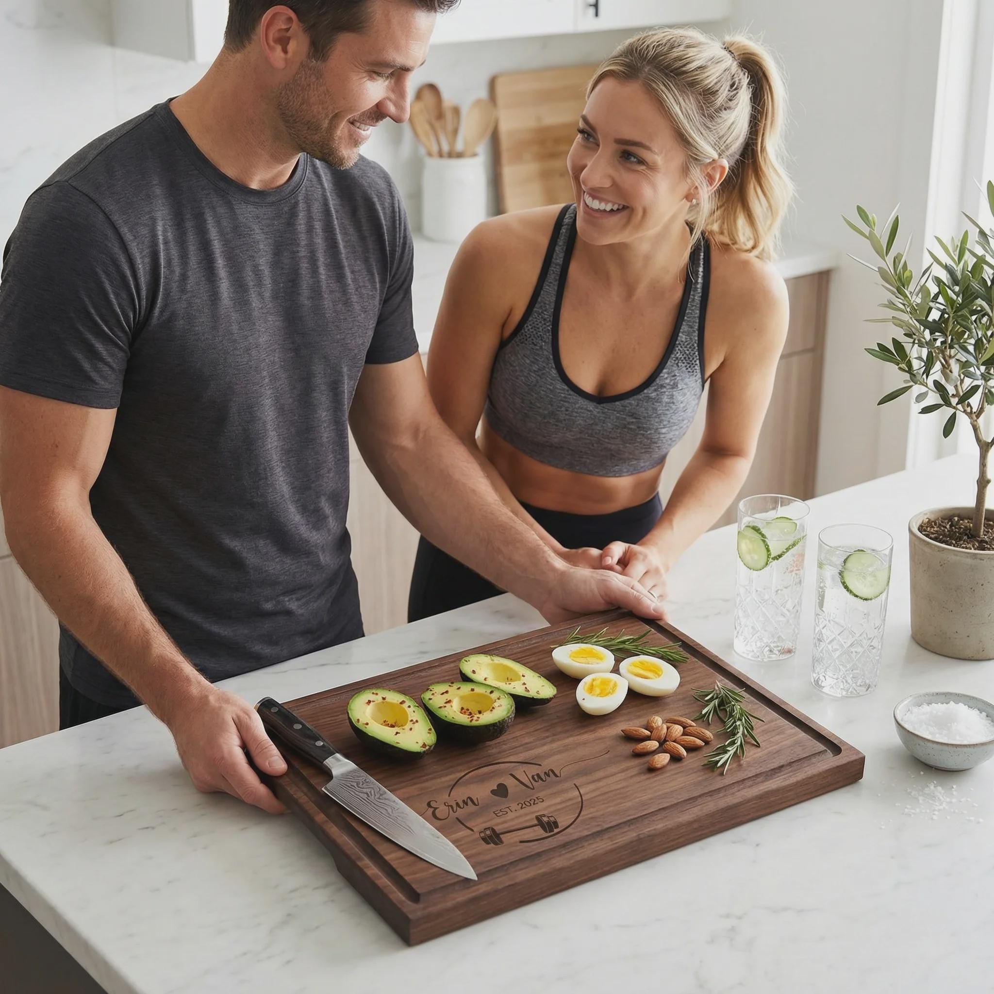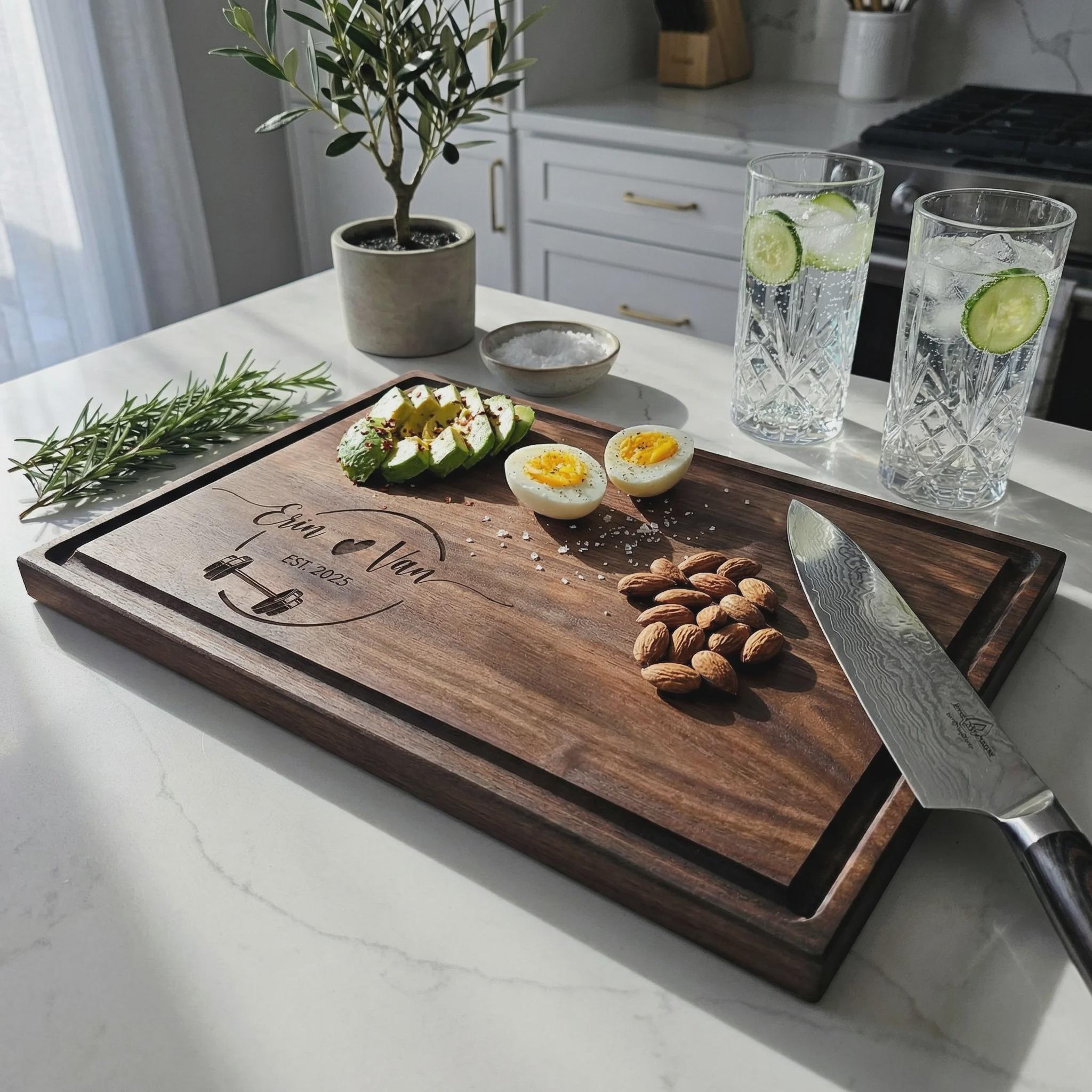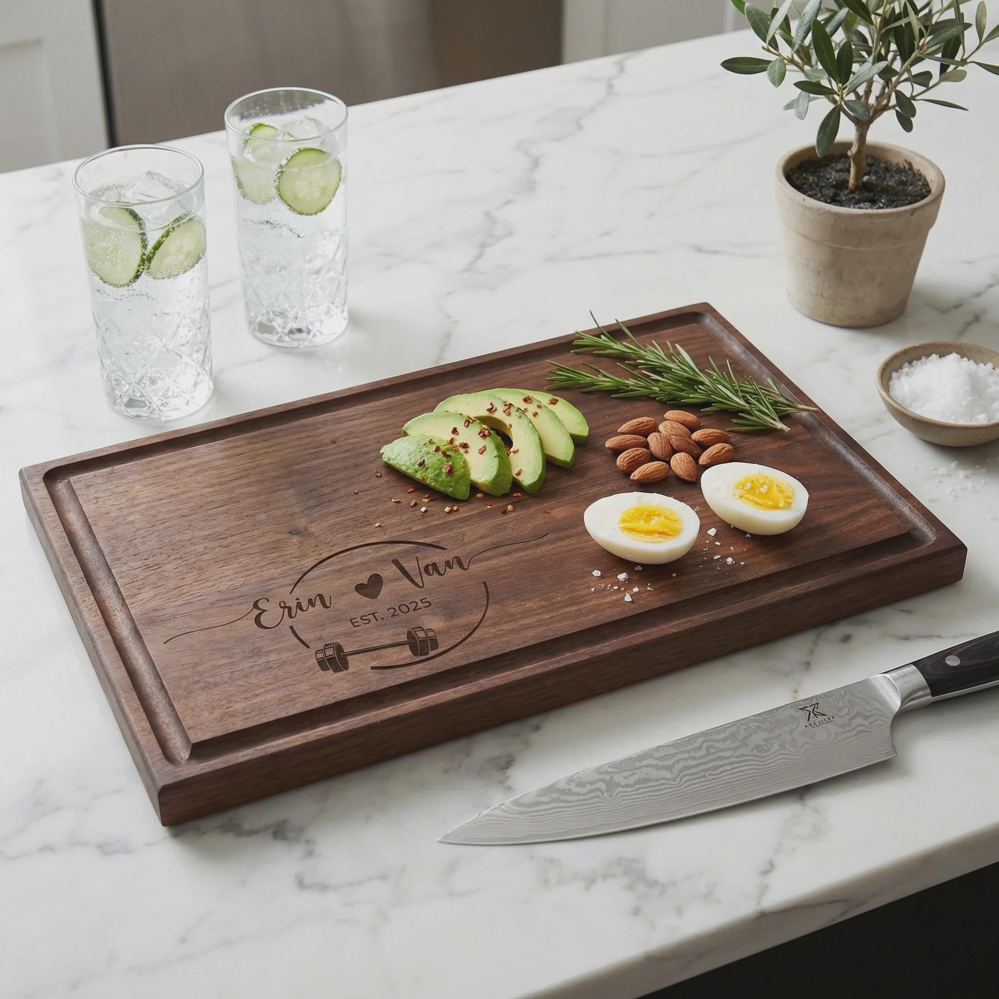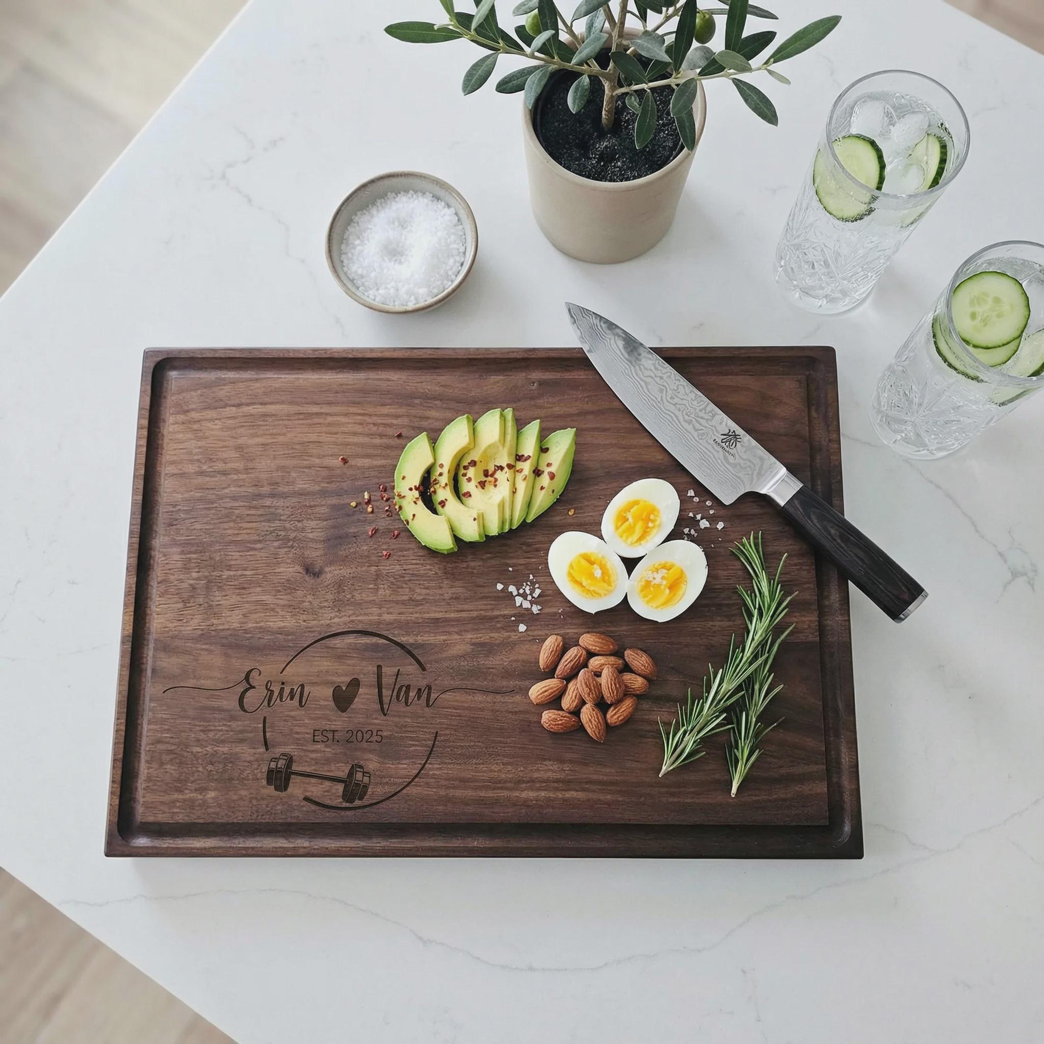 Fuel the gains and the romance with this custom-engraved wood cutting board, designed for the couple that lifts together. Featuring a bold barbell motif personalized with their names and an established date, this sturdy chopping block is the ultimate tool for Sunday meal prep or post-workout protein snacking. Crafted with a practical juice groove to make clean-up easy, it makes a robust gift for personal trainers, bodybuilders, or your favorite "swolemates" who believe healthy food is the best fuel.