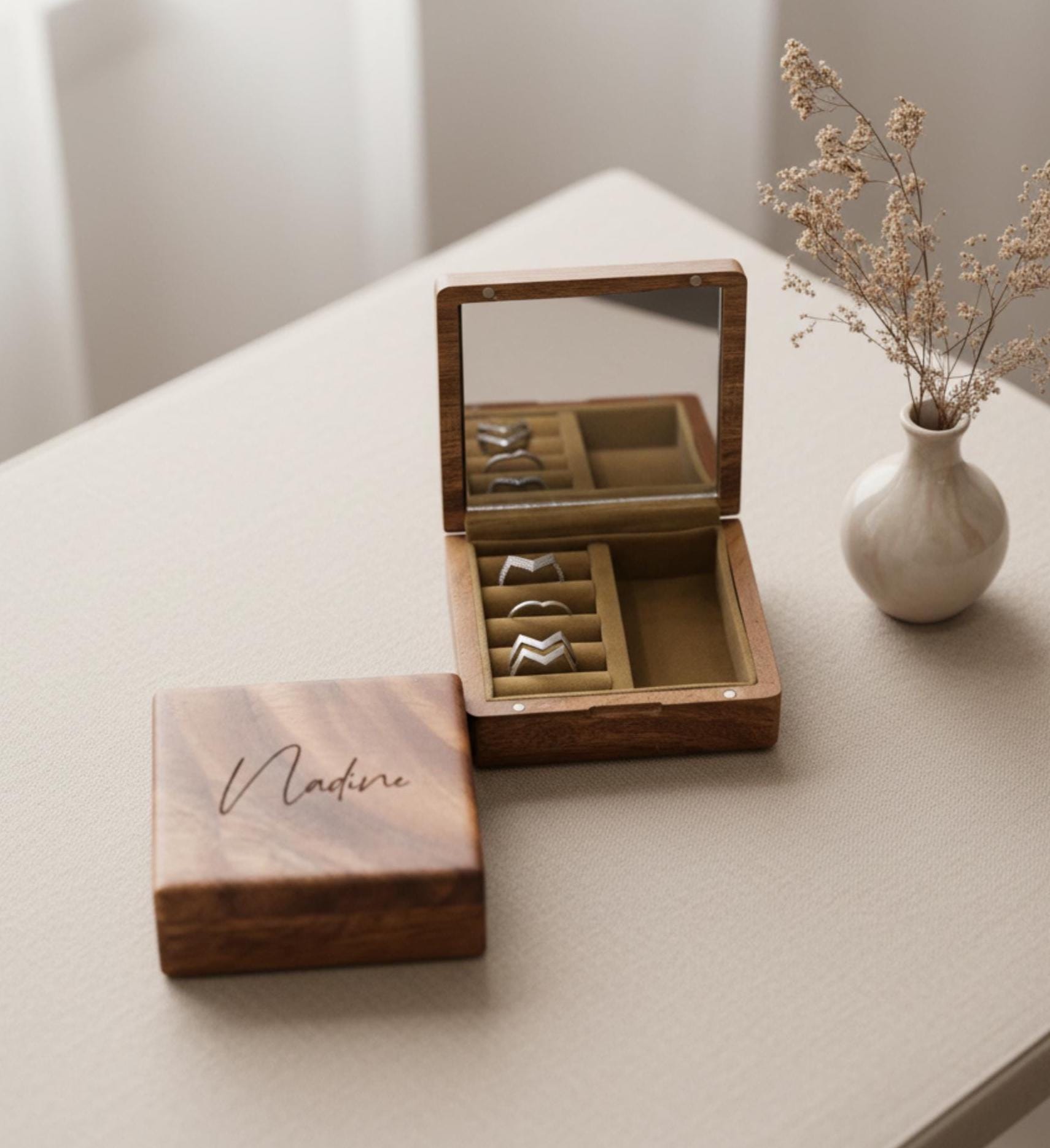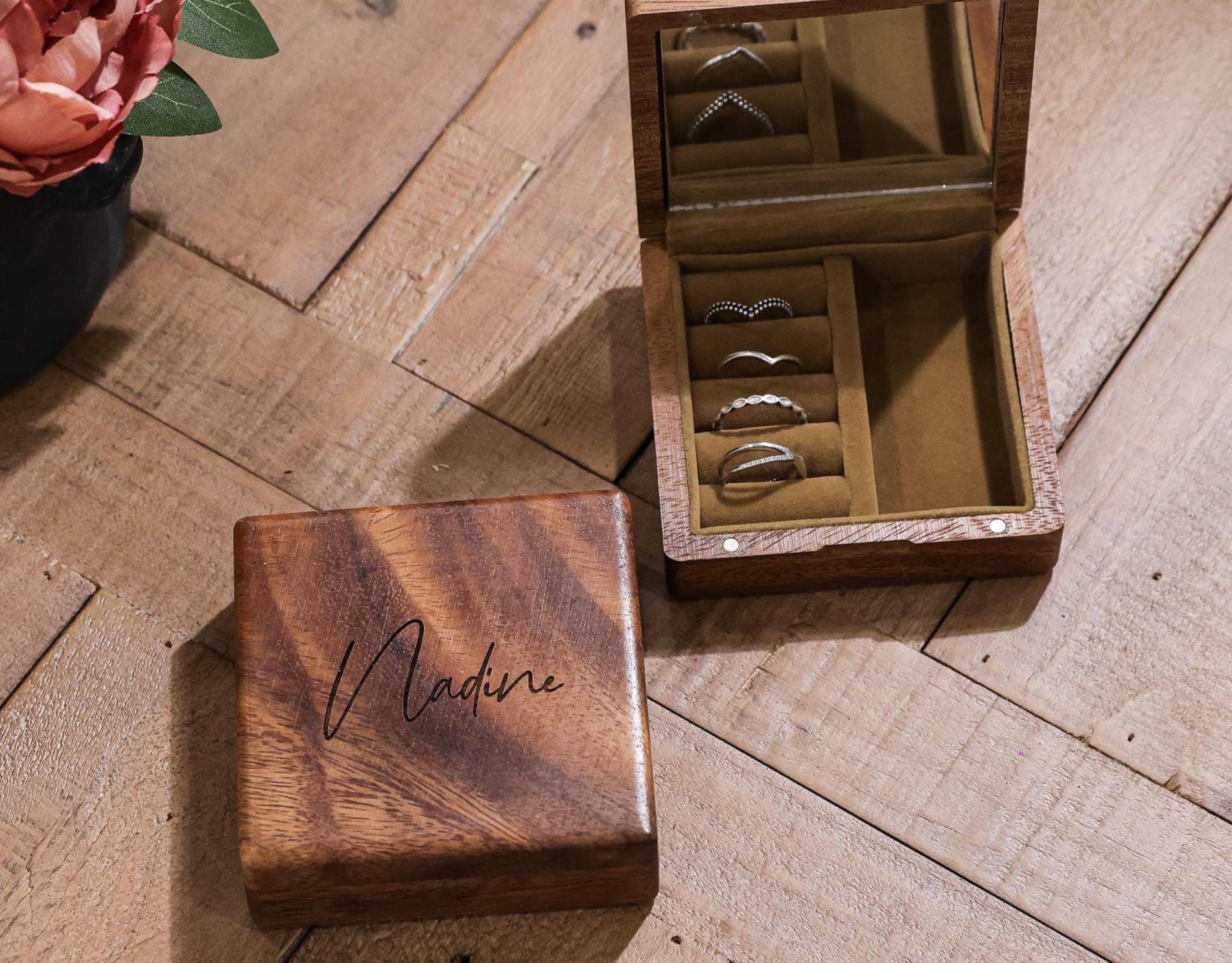 These personalized jewelry boxes make the perfect blend of elegance and sentiment, making them an ideal gift for bridesmaids, weddings, Christmas, Wives, Mother's Day, or any special occasion. Crafted from solid natural wood, each jewelry box is unique, with its own beautiful grain pattern that adds a touch of timeless beauty.