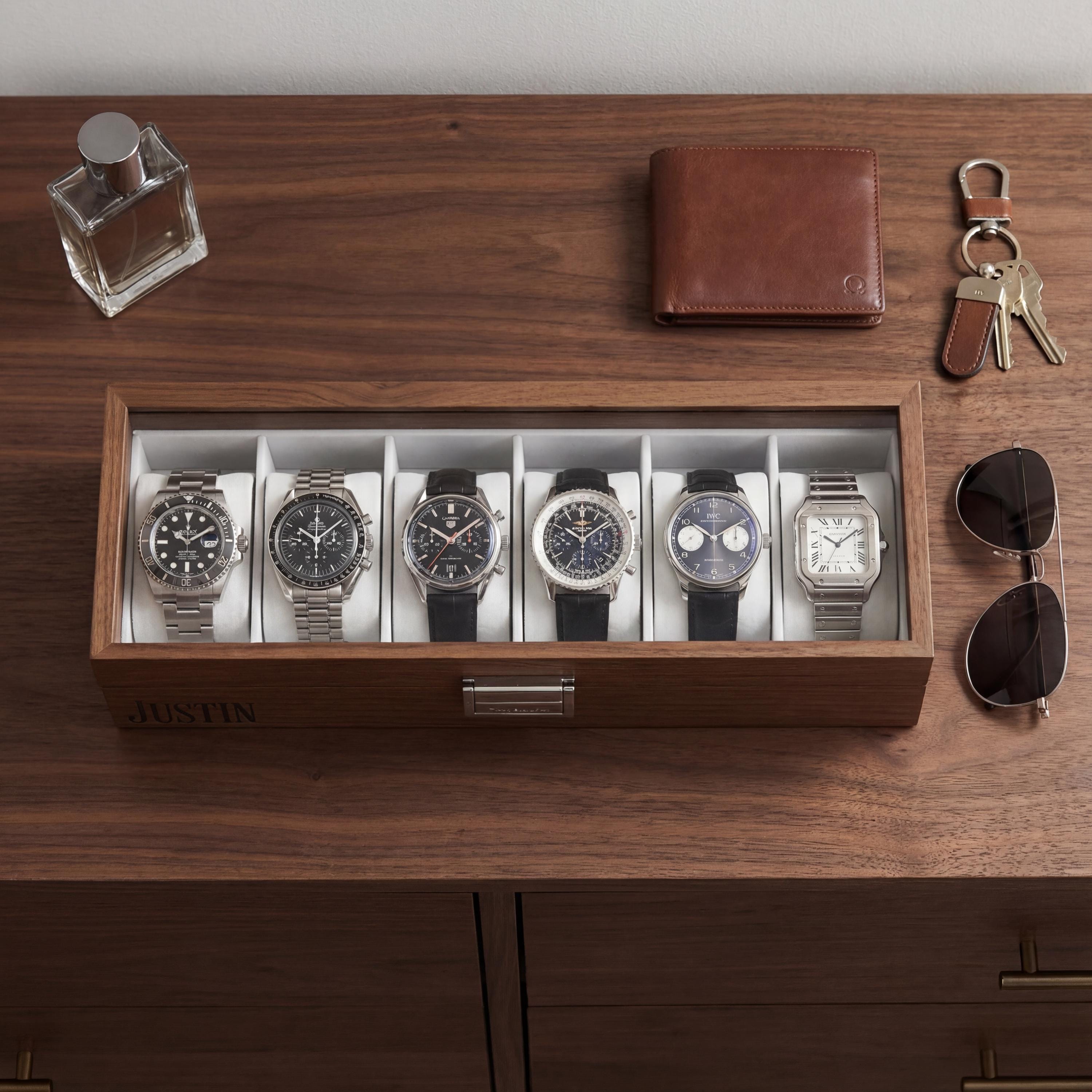 Veneered walnut construction with a clear glass lid that keeps your watches visible and dust-free.