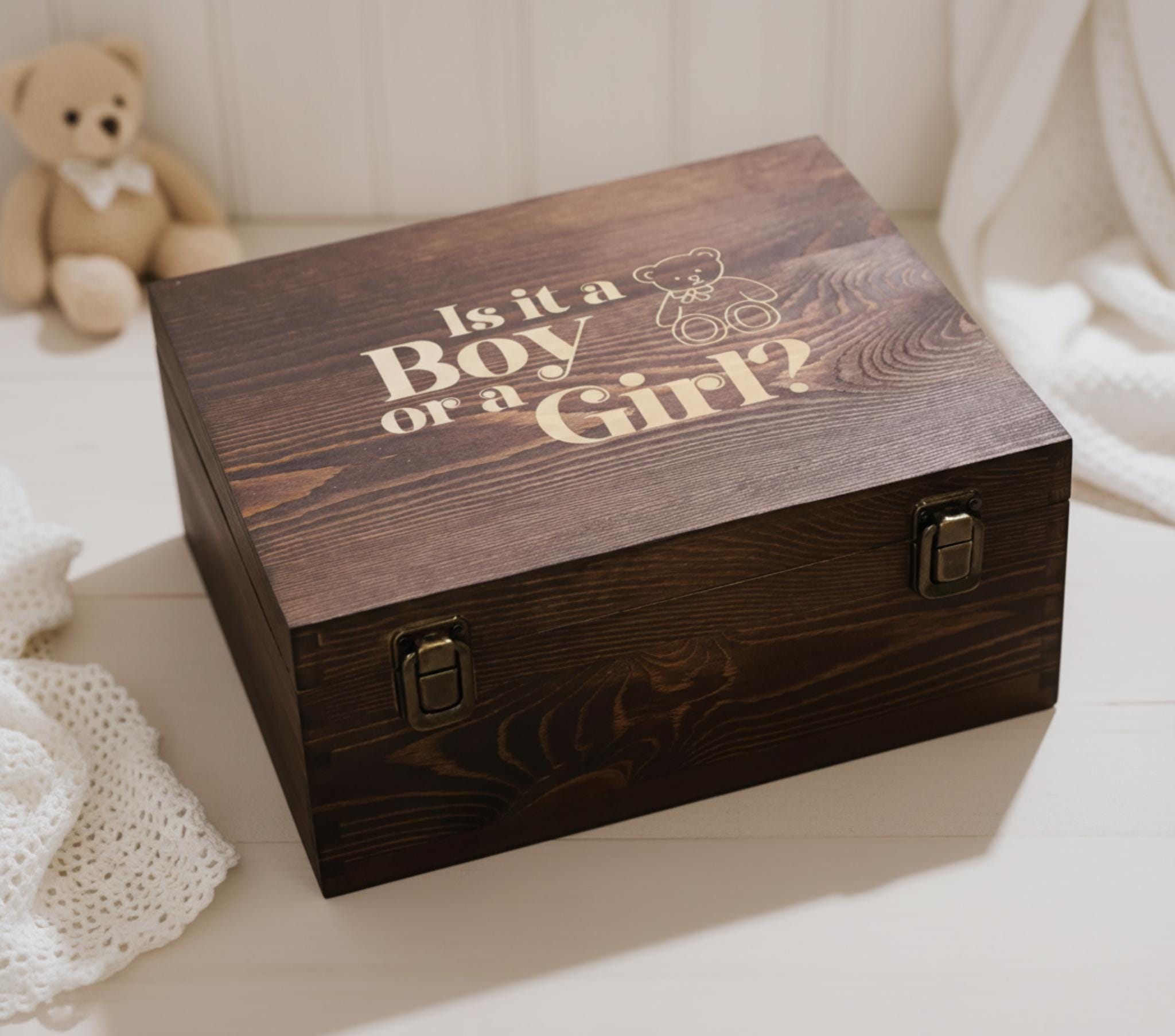 Personalized Wooden Gender Reveal Memory Box – Engraved Rustic Keepsake for Baby Girl or Boy