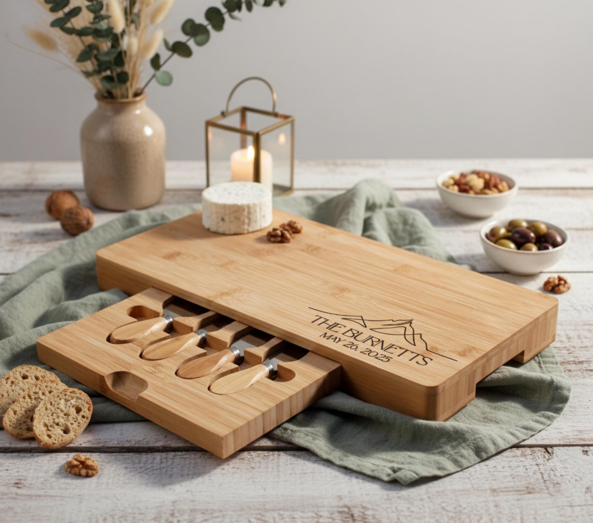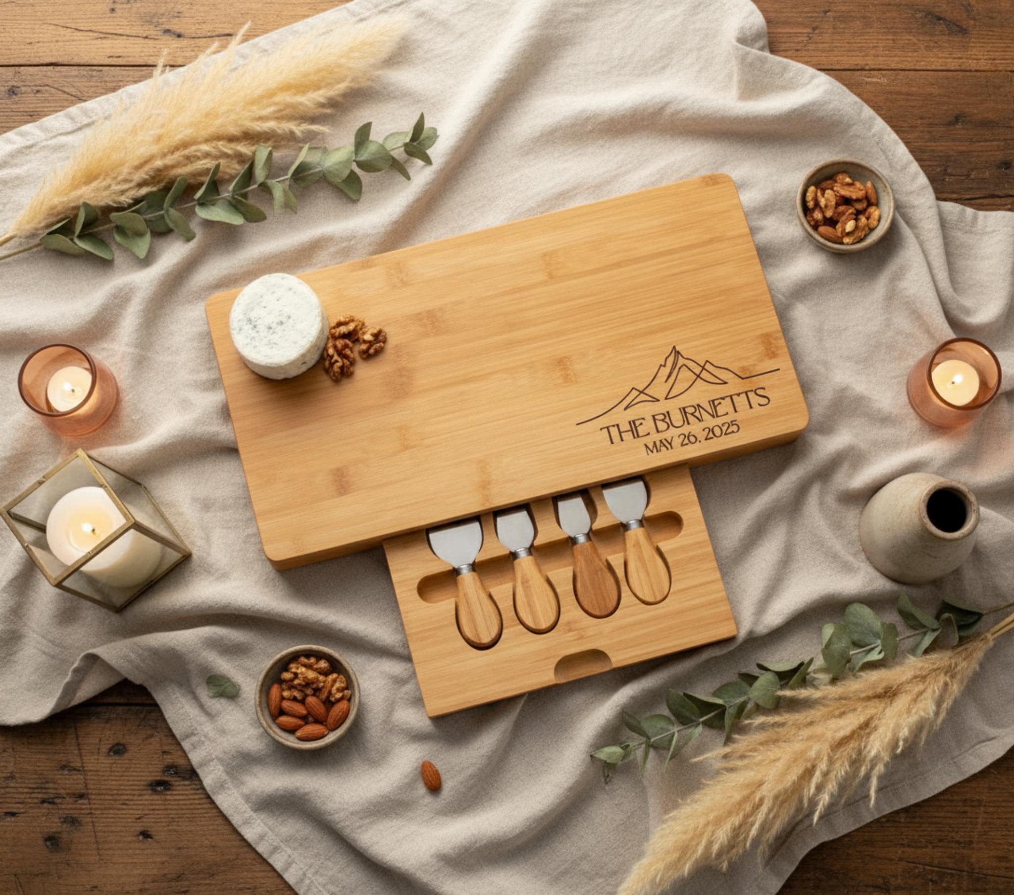 Personalized Mountain Bamboo Charcuterie Board with Cheese Knife Set