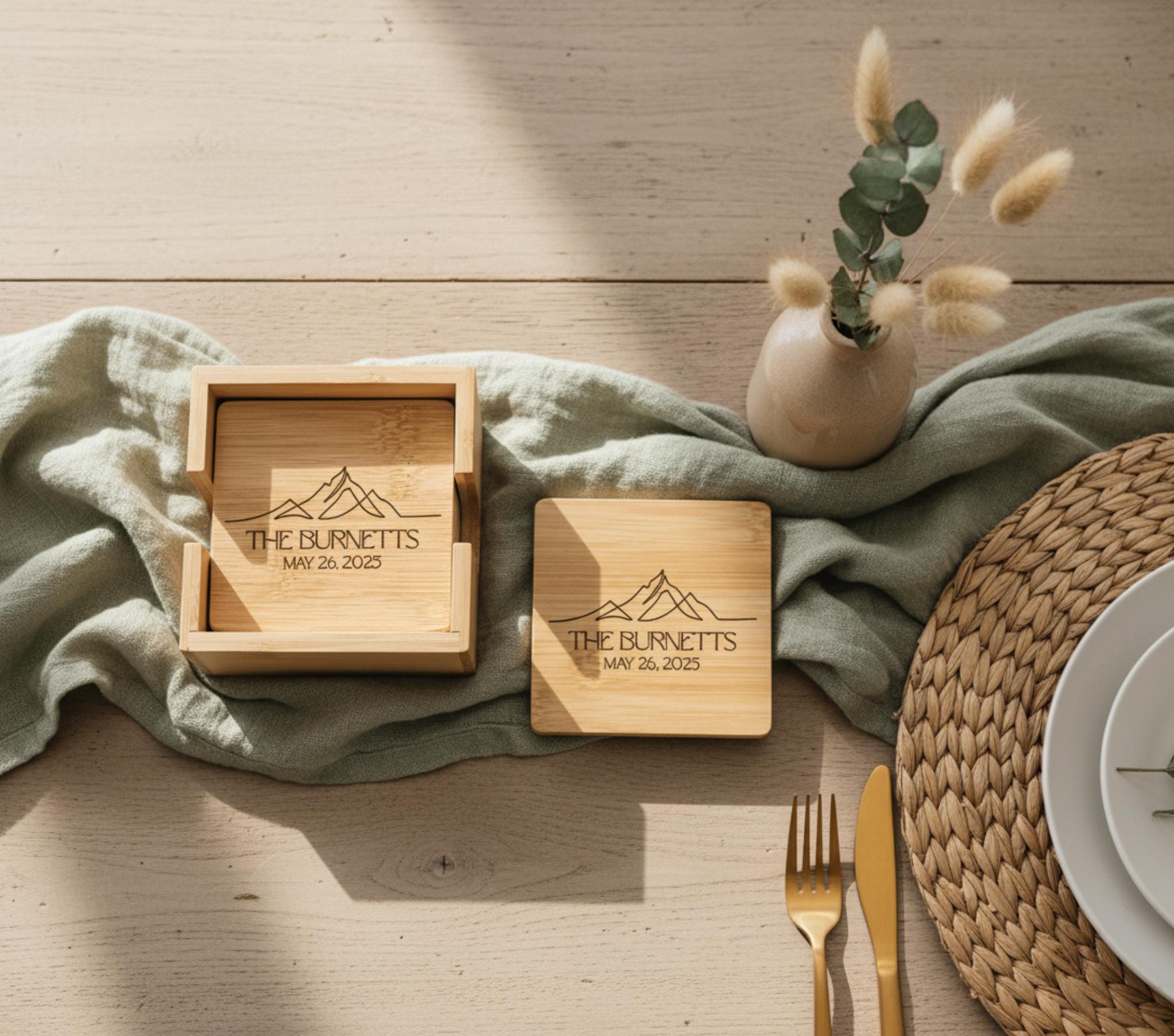 Pair the personalized board with the matching coaster set for a complete, sophisticated presentation.