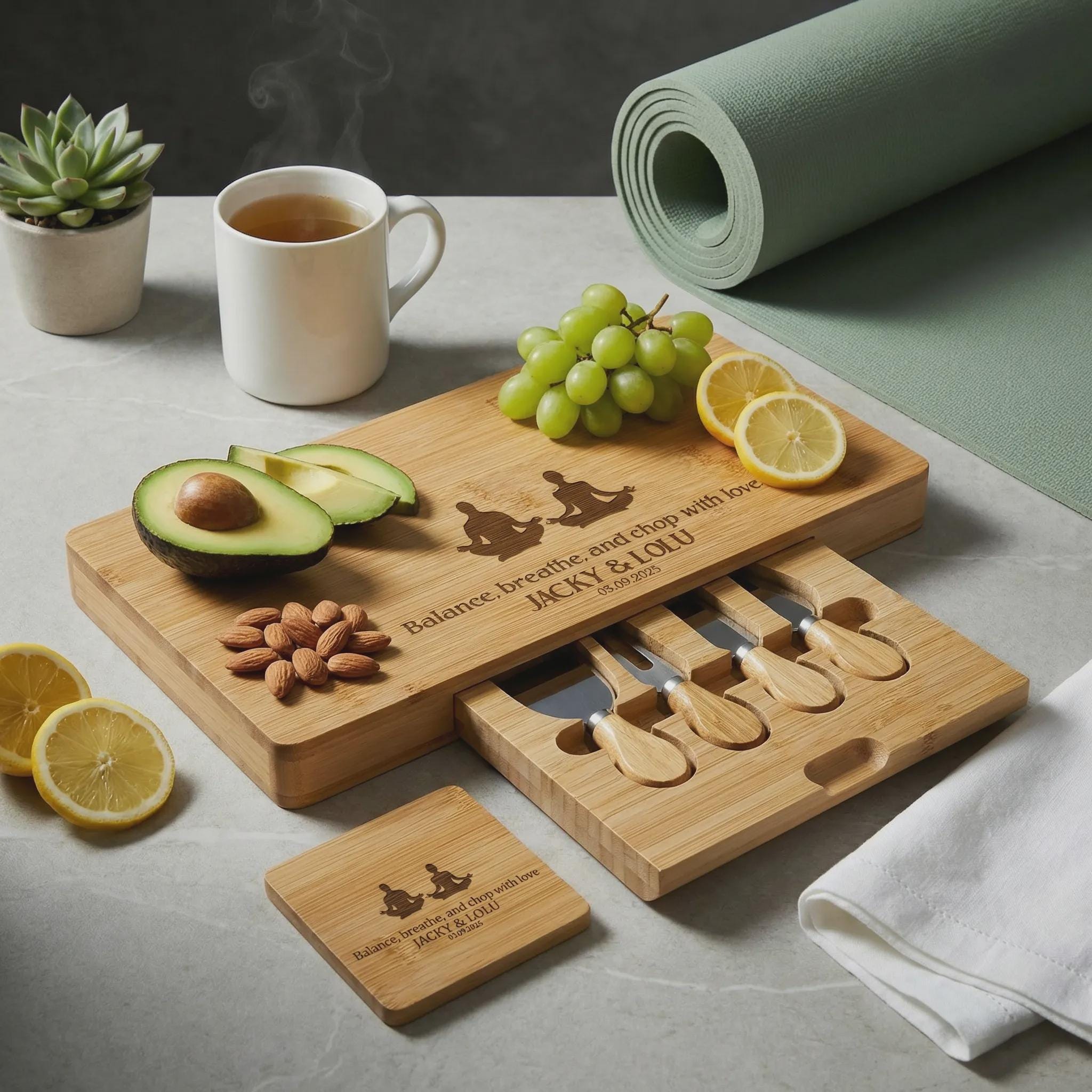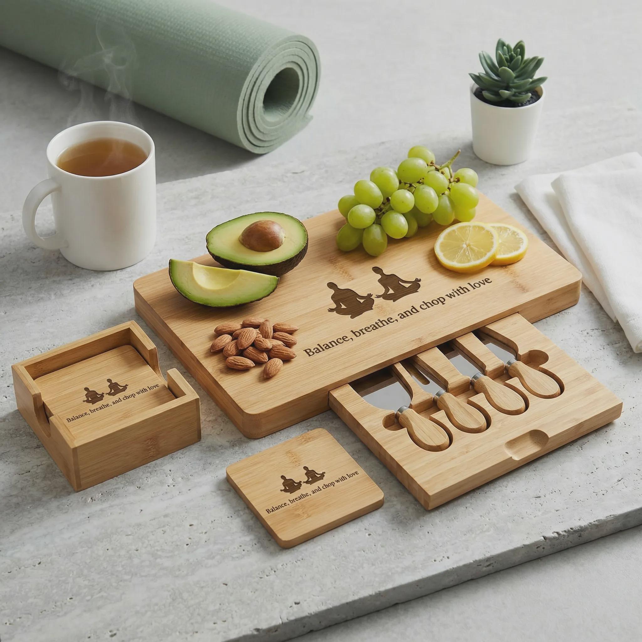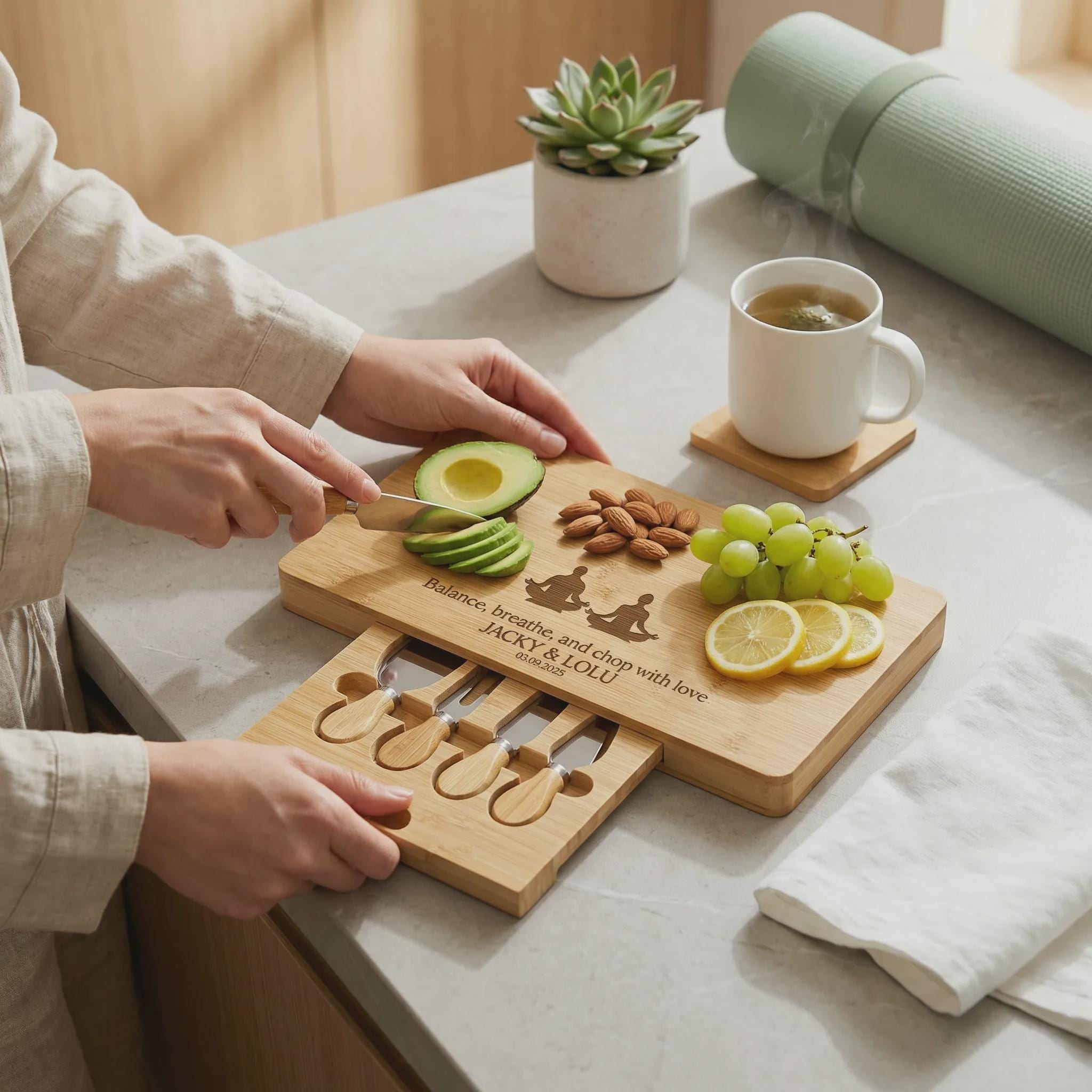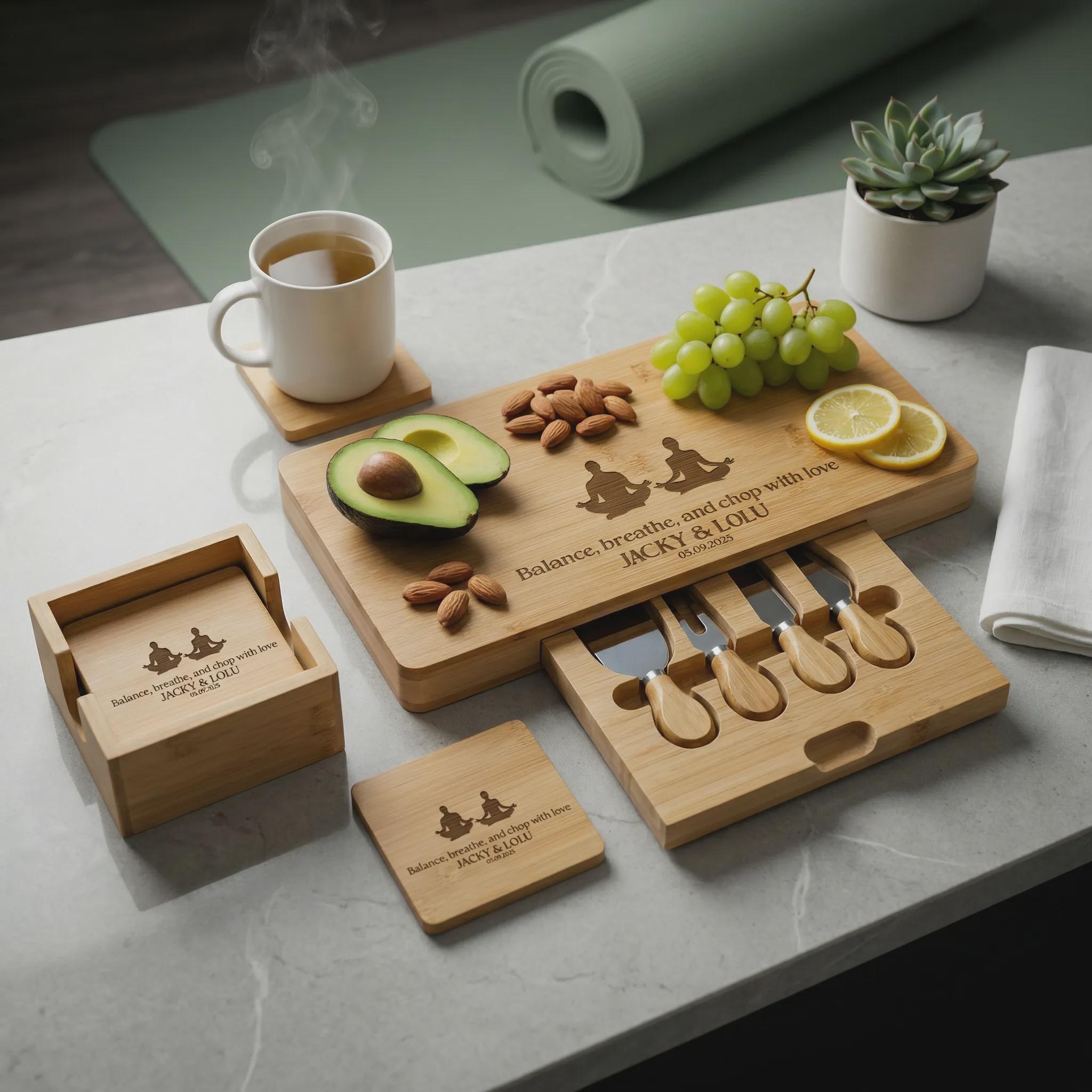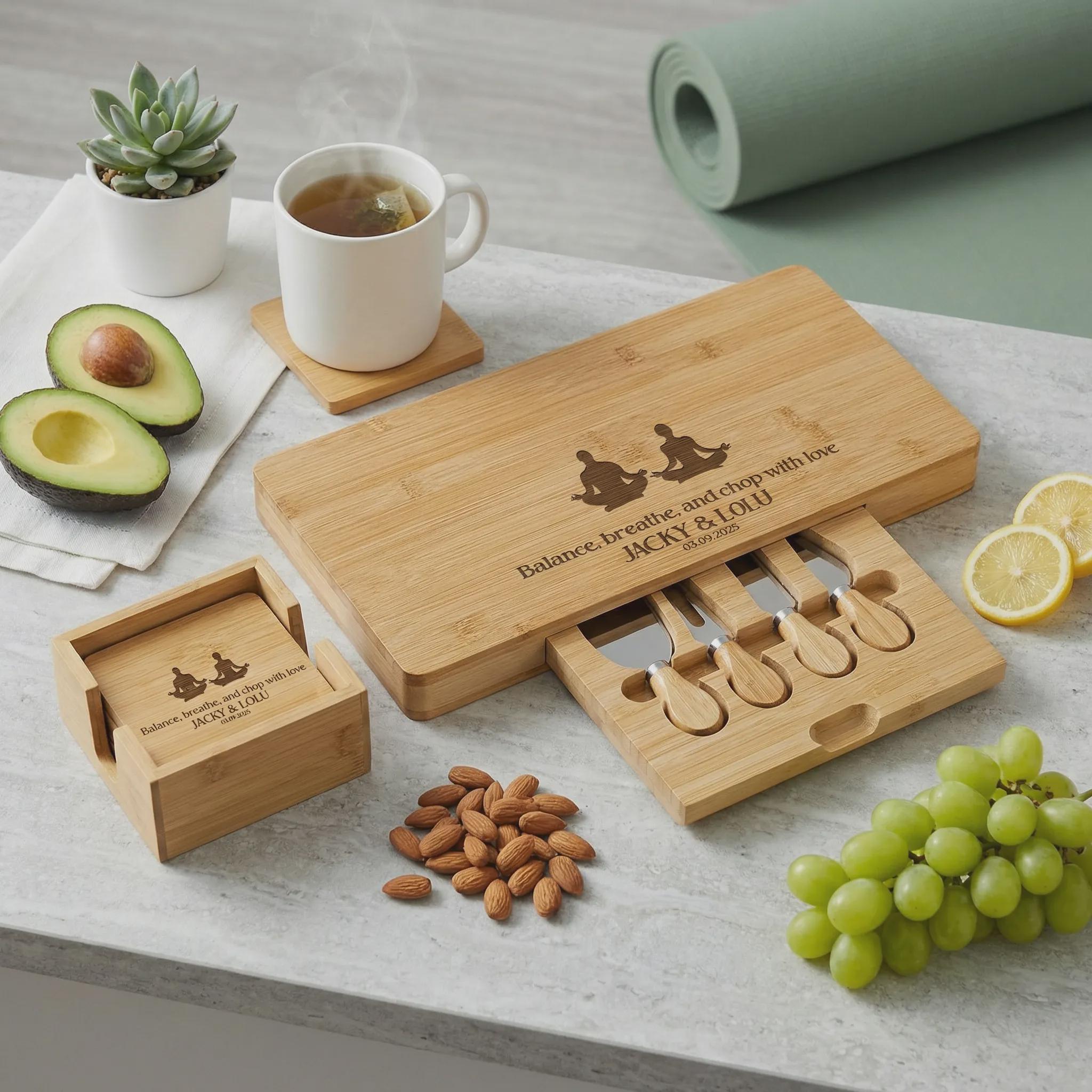 Personalized Yoga Charcuterie Board: Engraved Bamboo Cheese Platter Set