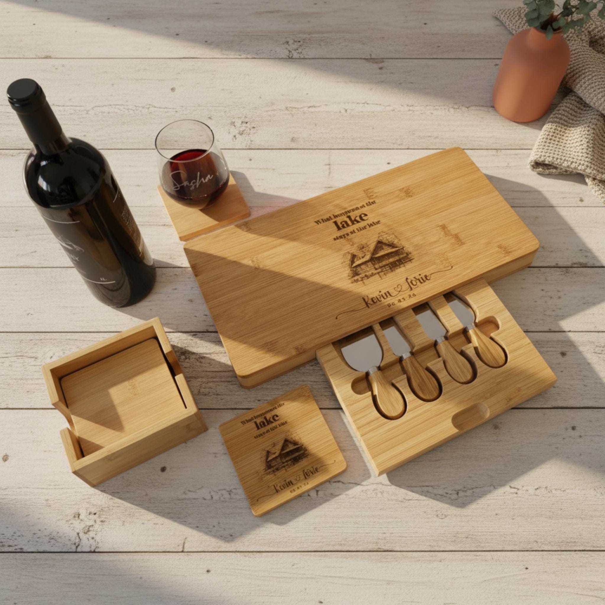 Pair the personalized board with the matching coaster set for a complete, sophisticated presentation.