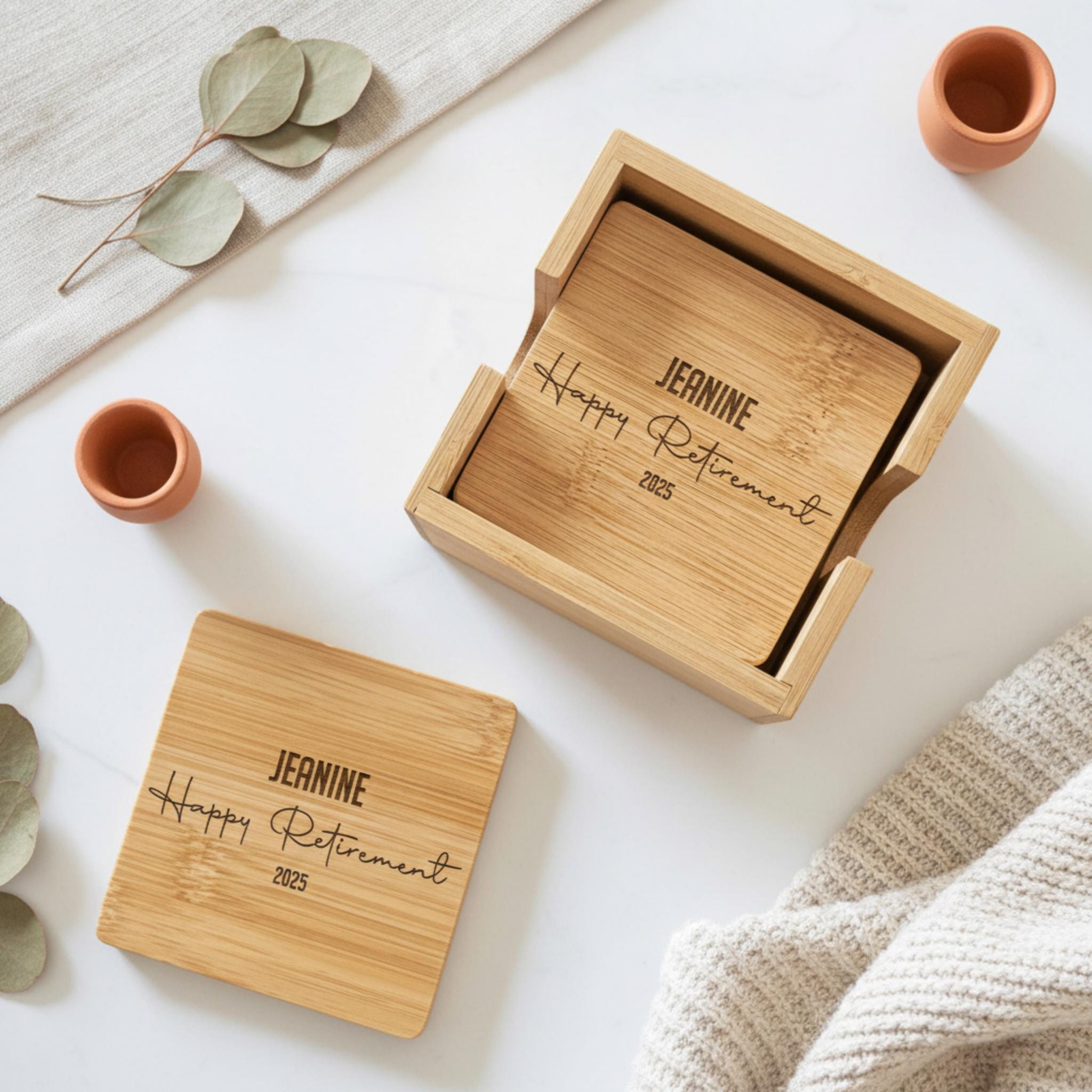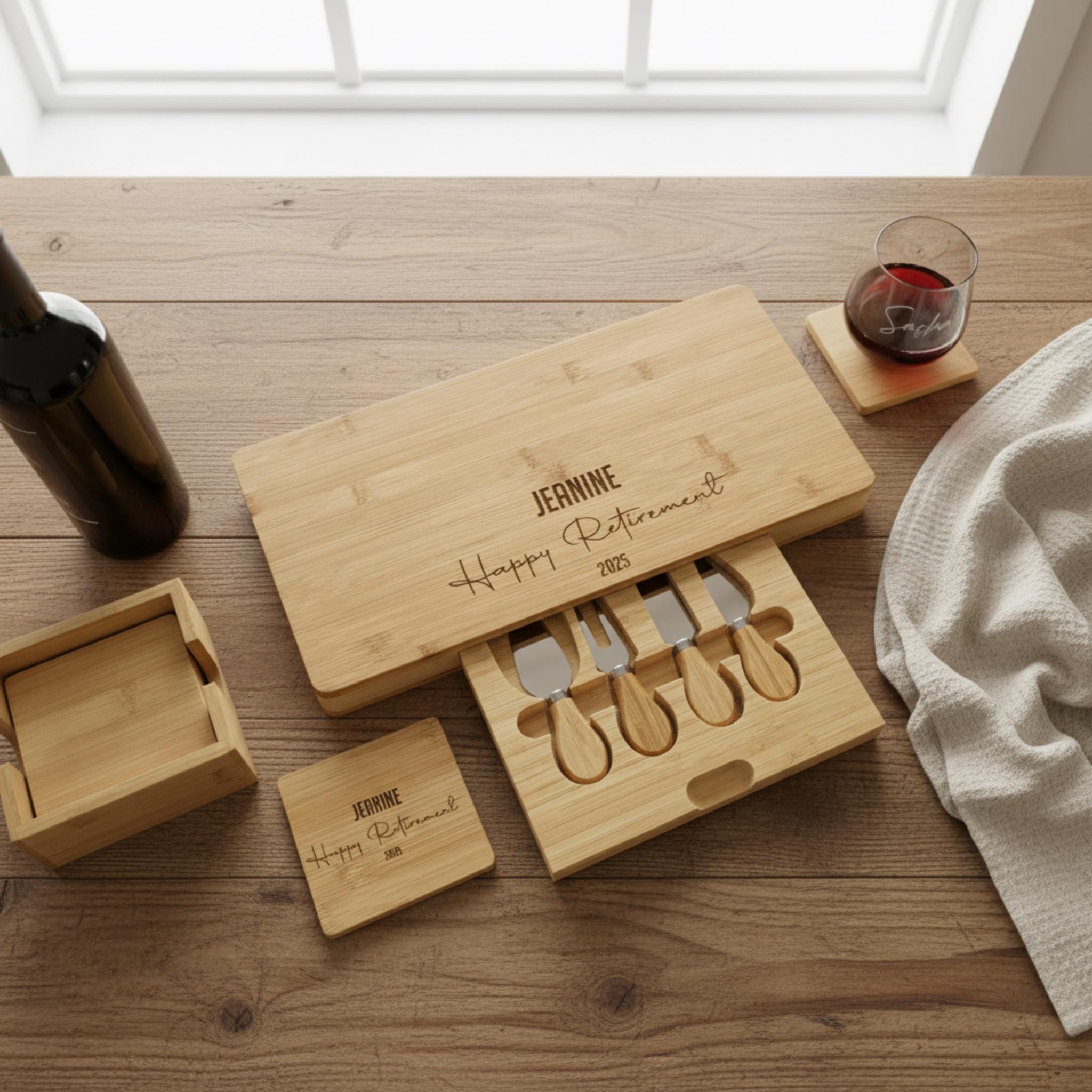 Pair the personalized board with the matching coaster set for a complete, sophisticated presentation.