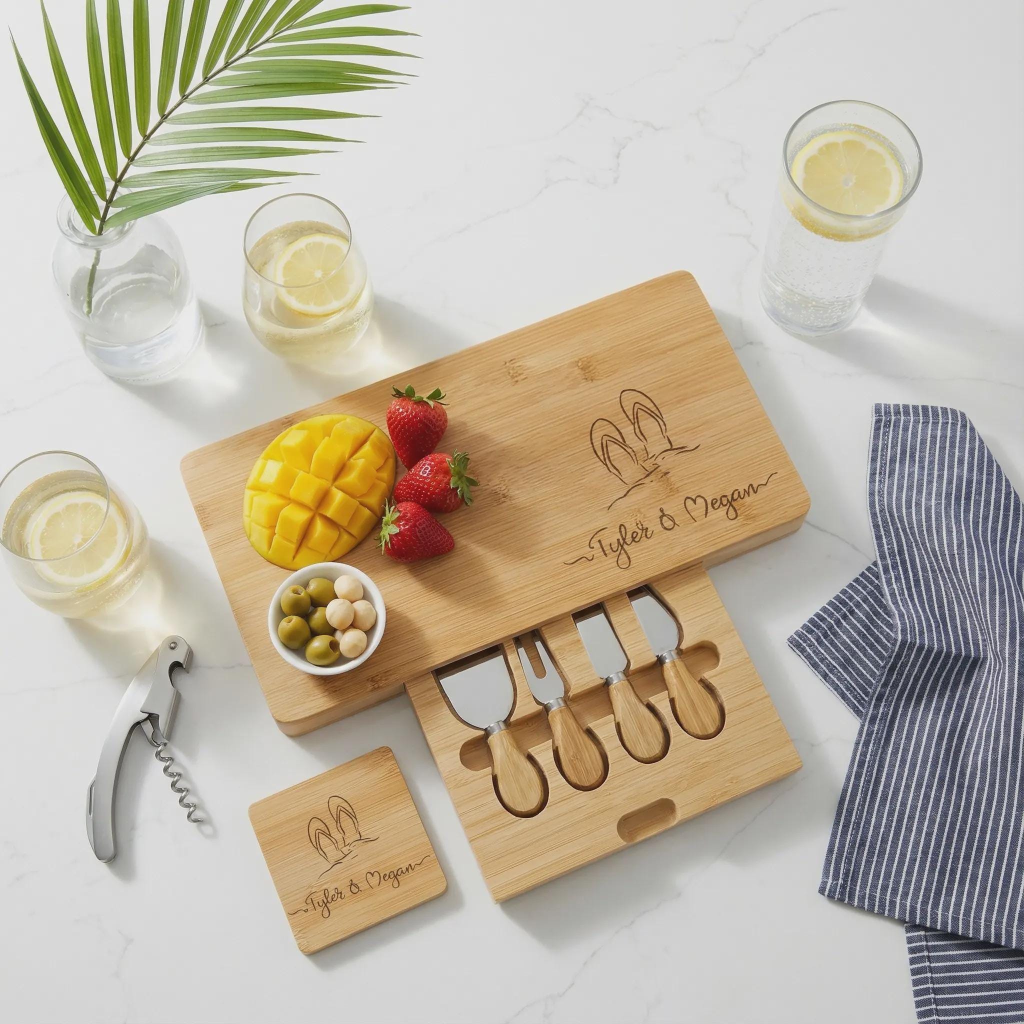 Bring the relaxed vibes of the seaside to their dining table with this fun, custom-engraved bamboo cheese board set. Featuring a playful "Flip Flops in the Sand" design, this serving station is the ultimate accessory for summer entertaining or patio parties. The set includes a hidden slide-out drawer with stainless steel cheese knives and matching coasters for a complete look. Personalized with the couple's names, it makes a perfect housewarming gift for a new vacation home, a destination wedding keepsake, or a happy retirement surprise.