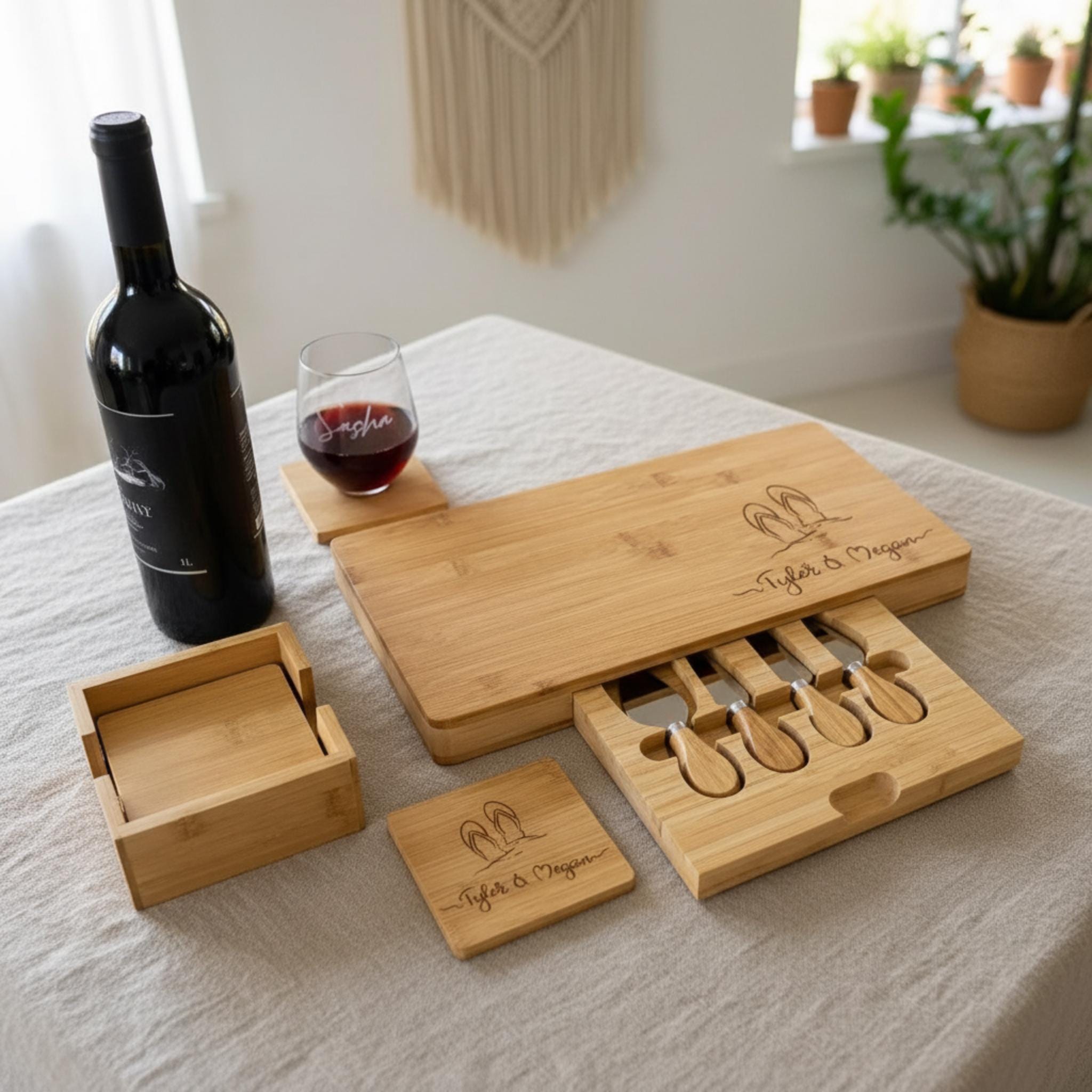 These personalized charcuterie boards are a perfect fusion of creativity and practicality, designed to elevate every celebration. Unleash your creativity and celebrate life’s special moments with our custom-engraved cheese board set. Crafted from eco-friendly materials, this personalized board serves as the perfect centerpiece for weddings, bridal showers, engagements, housewarmings, and everyday entertaining.
