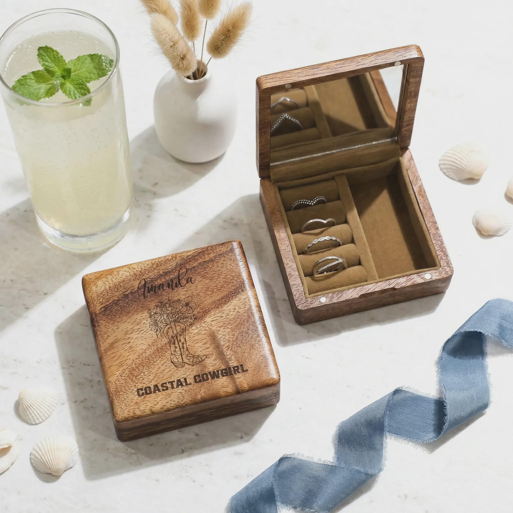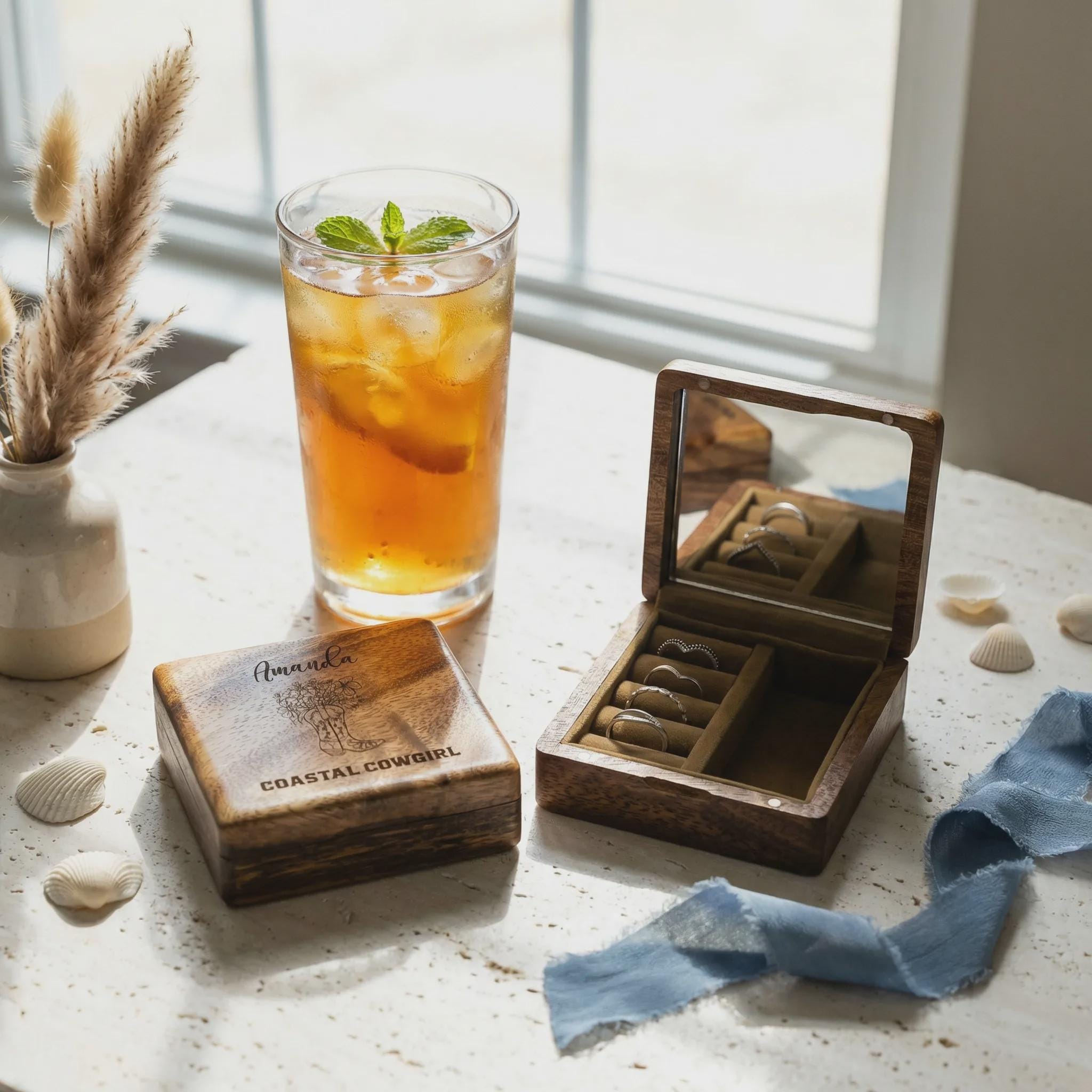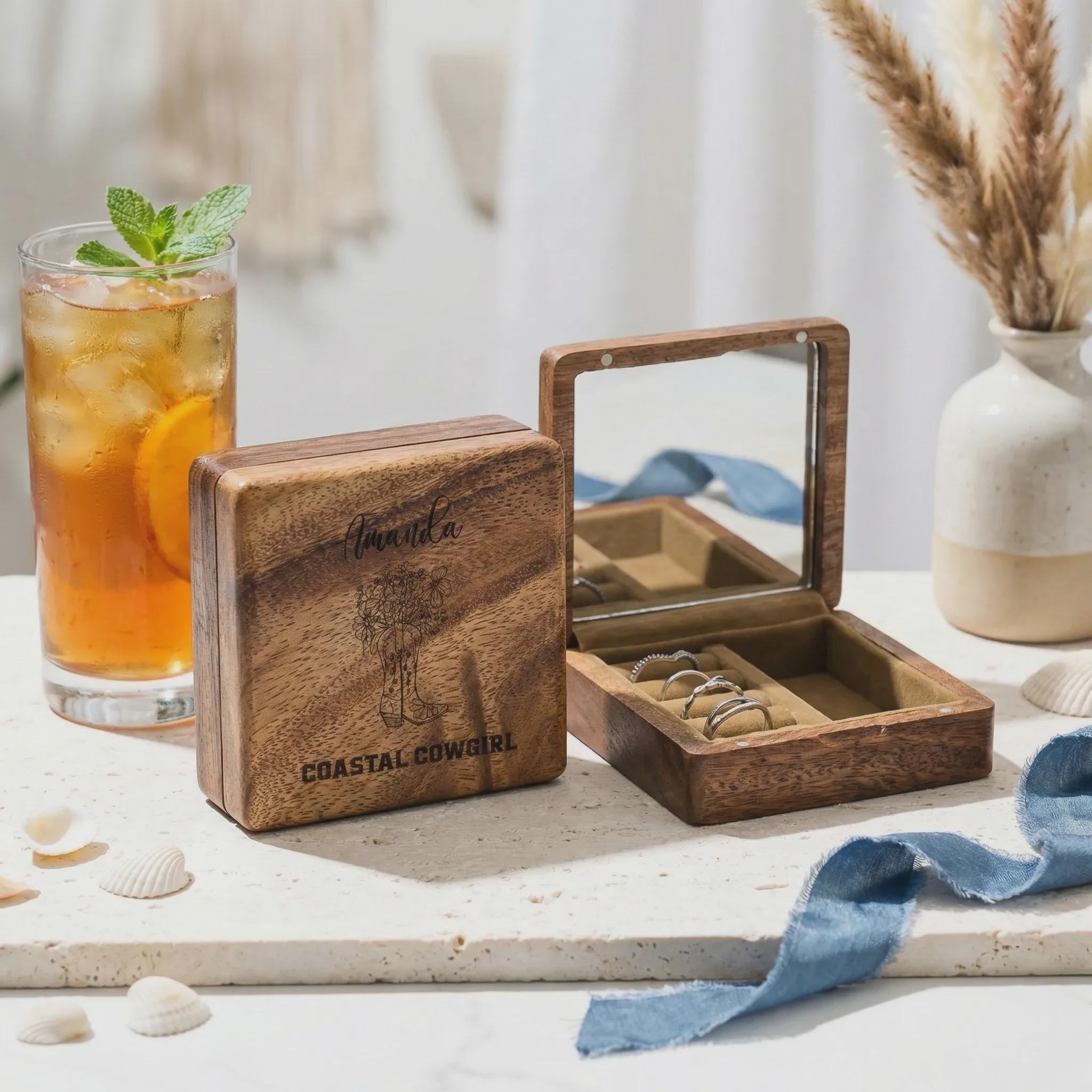 Personalized Coastal Cowgirl Wooden Jewelry Chest - Custom Engraved Travel Accessory Case with Mirror