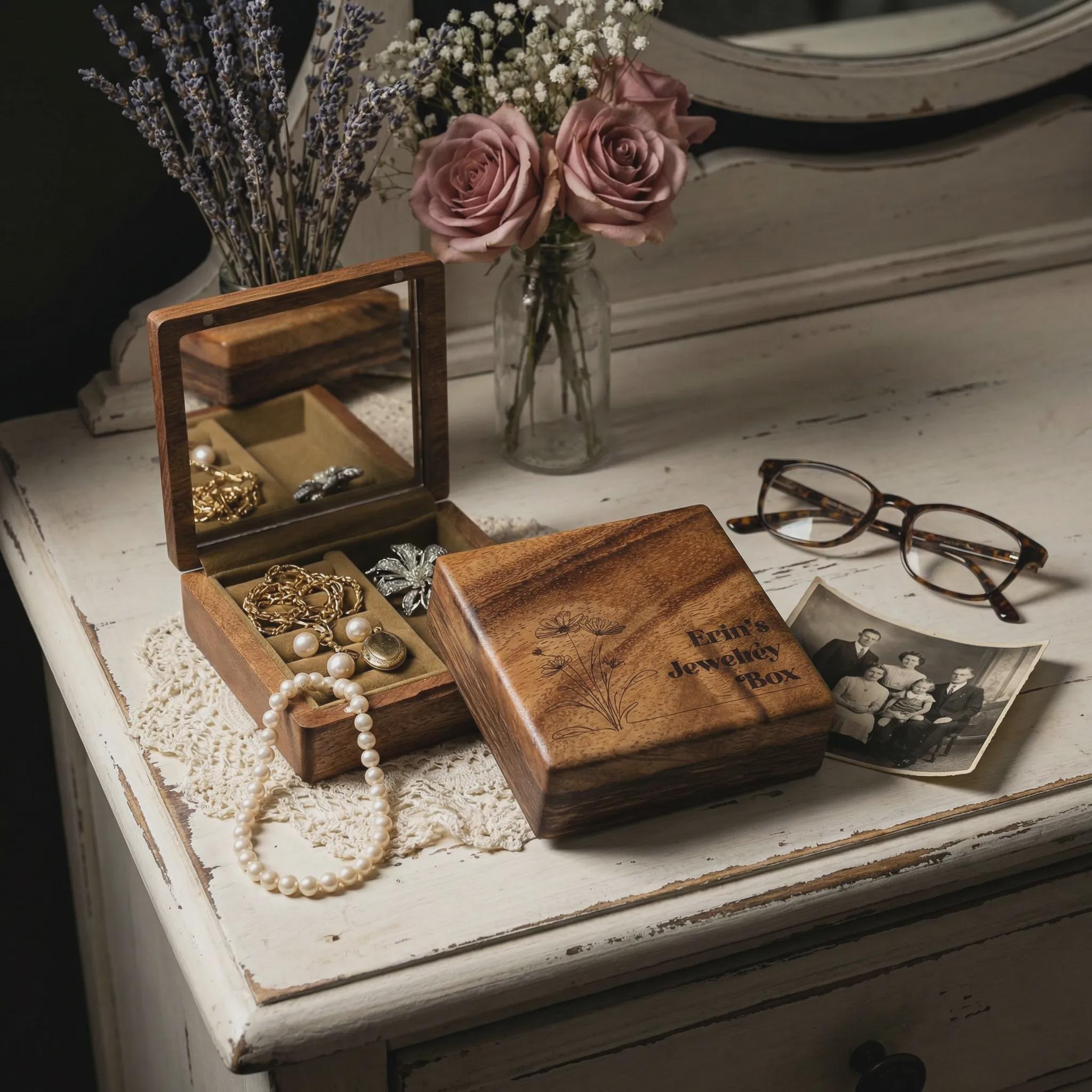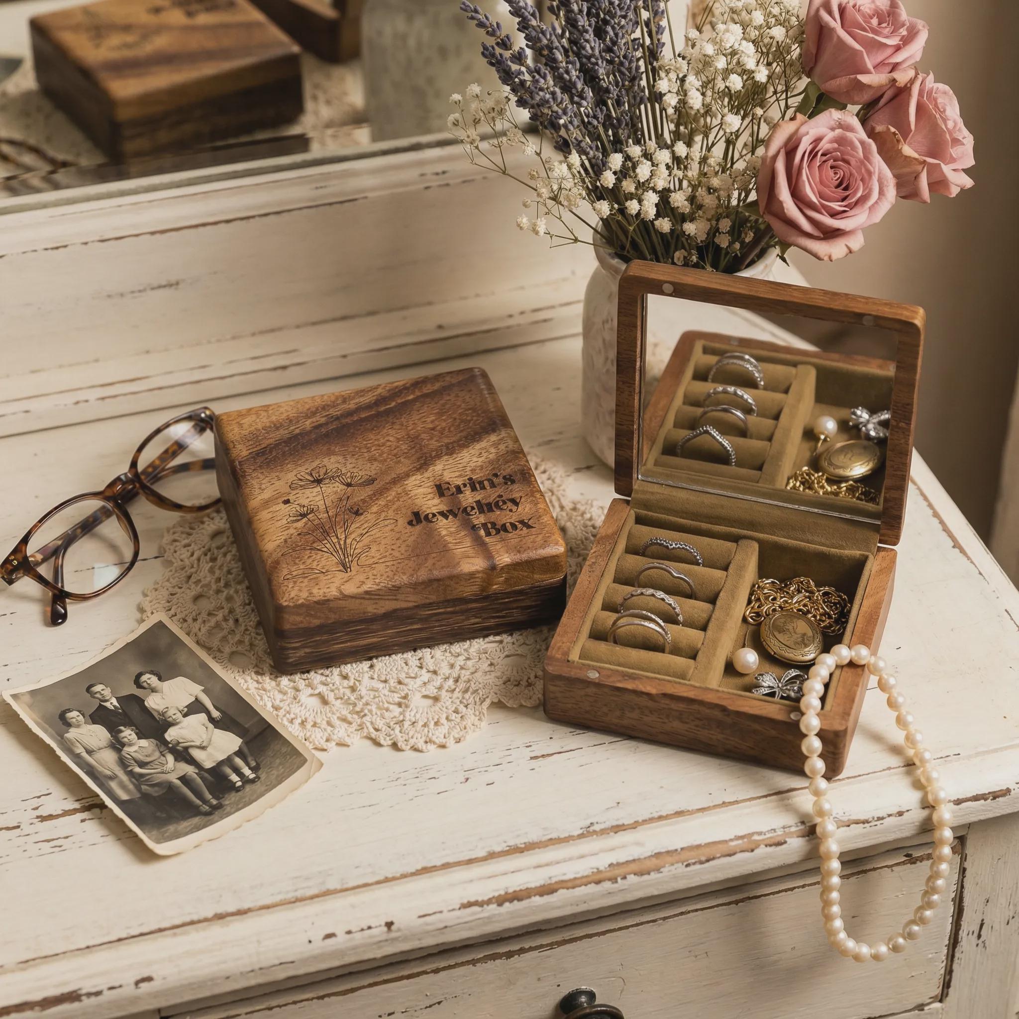 Keep your favorite accessories safe on the go with this handcrafted wood jewelry organizer. Custom-engraved with a delicate wildflower design and your chosen name, this compact case features a built-in vanity mirror and protective velvet lining. It is a thoughtful bridesmaid keepsake, a sweet birthday surprise for Grandma, or a sentimental Mother’s Day gift she will cherish forever.