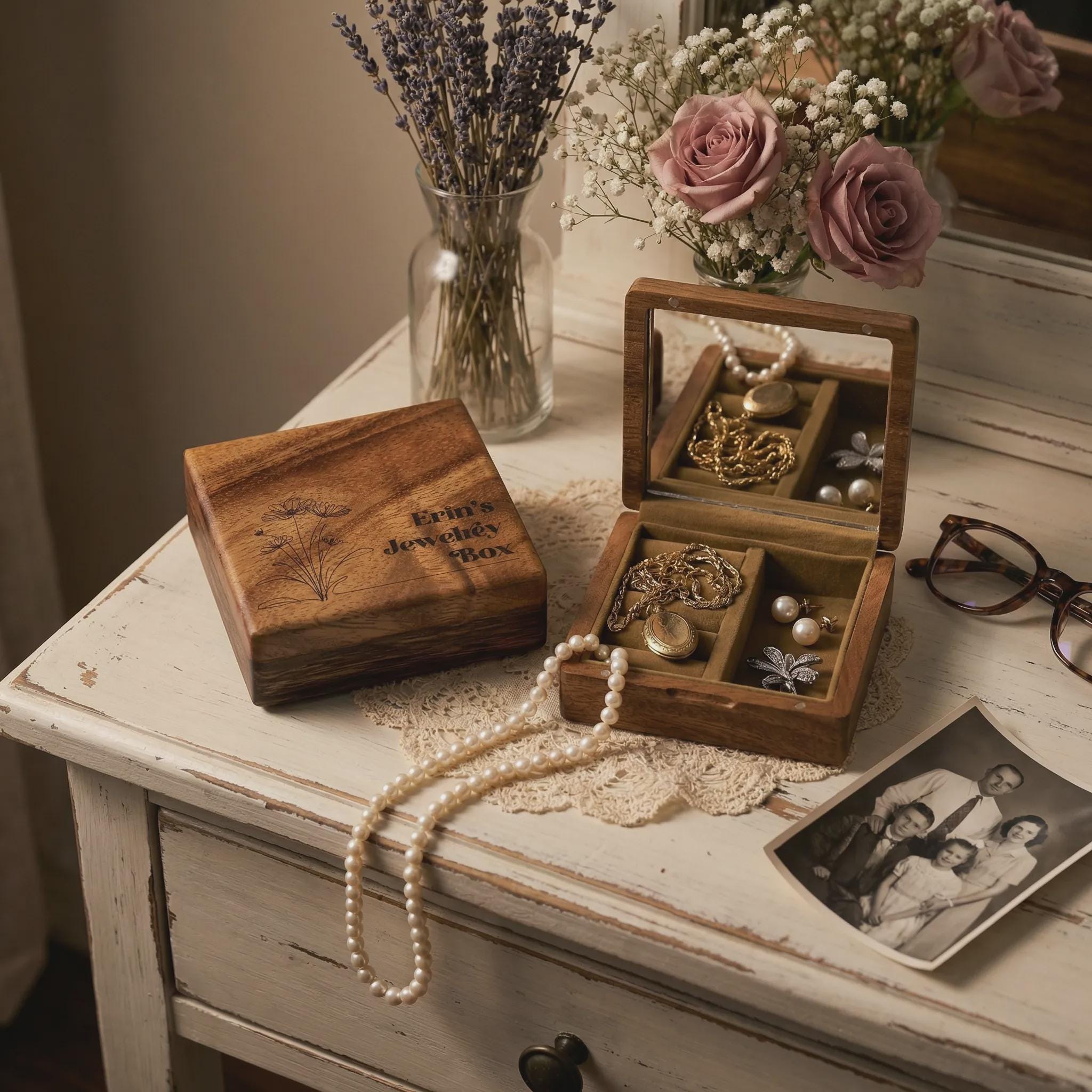 Personalized Floral Wood Jewelry Organizer - Custom Travel Mirror Case Gift For Her