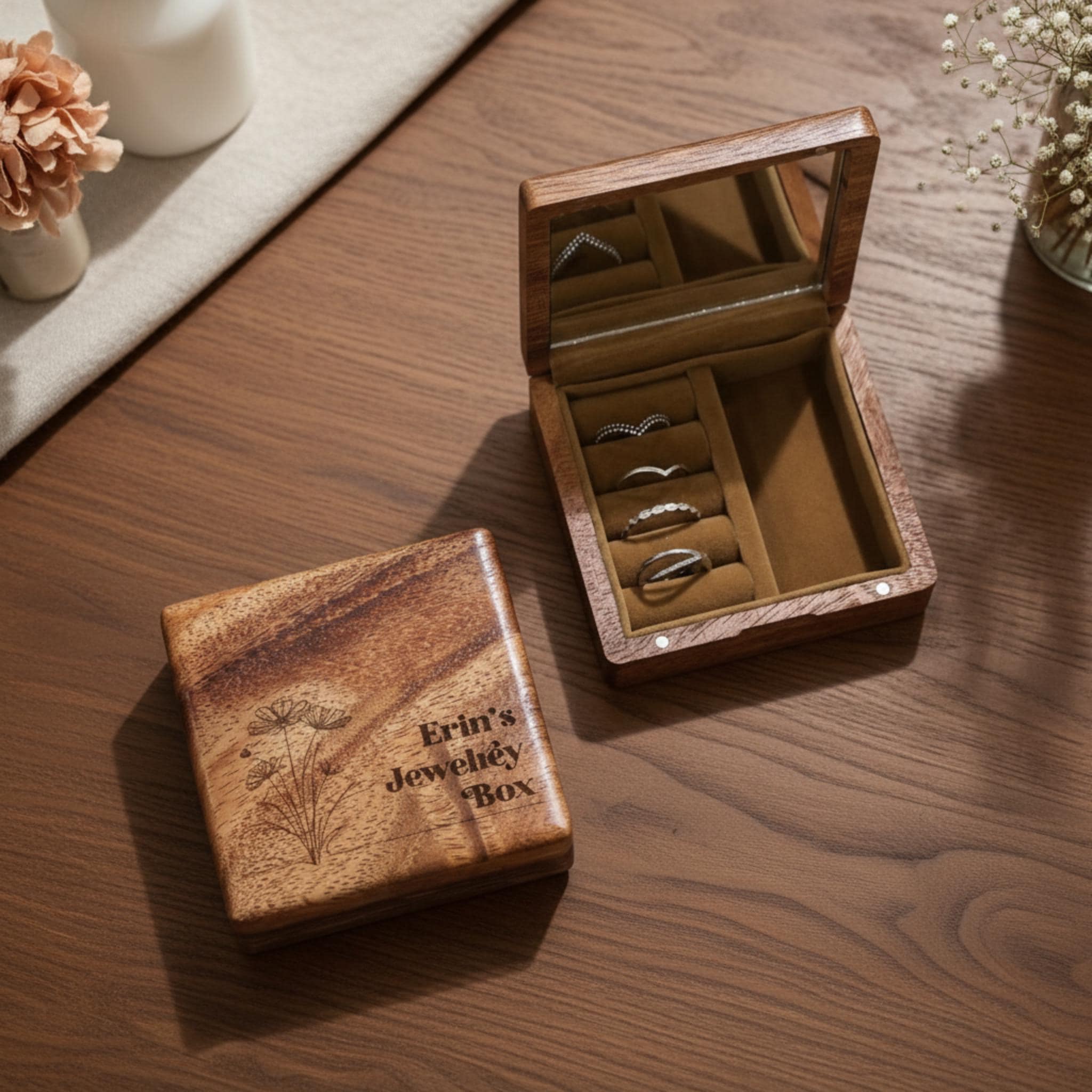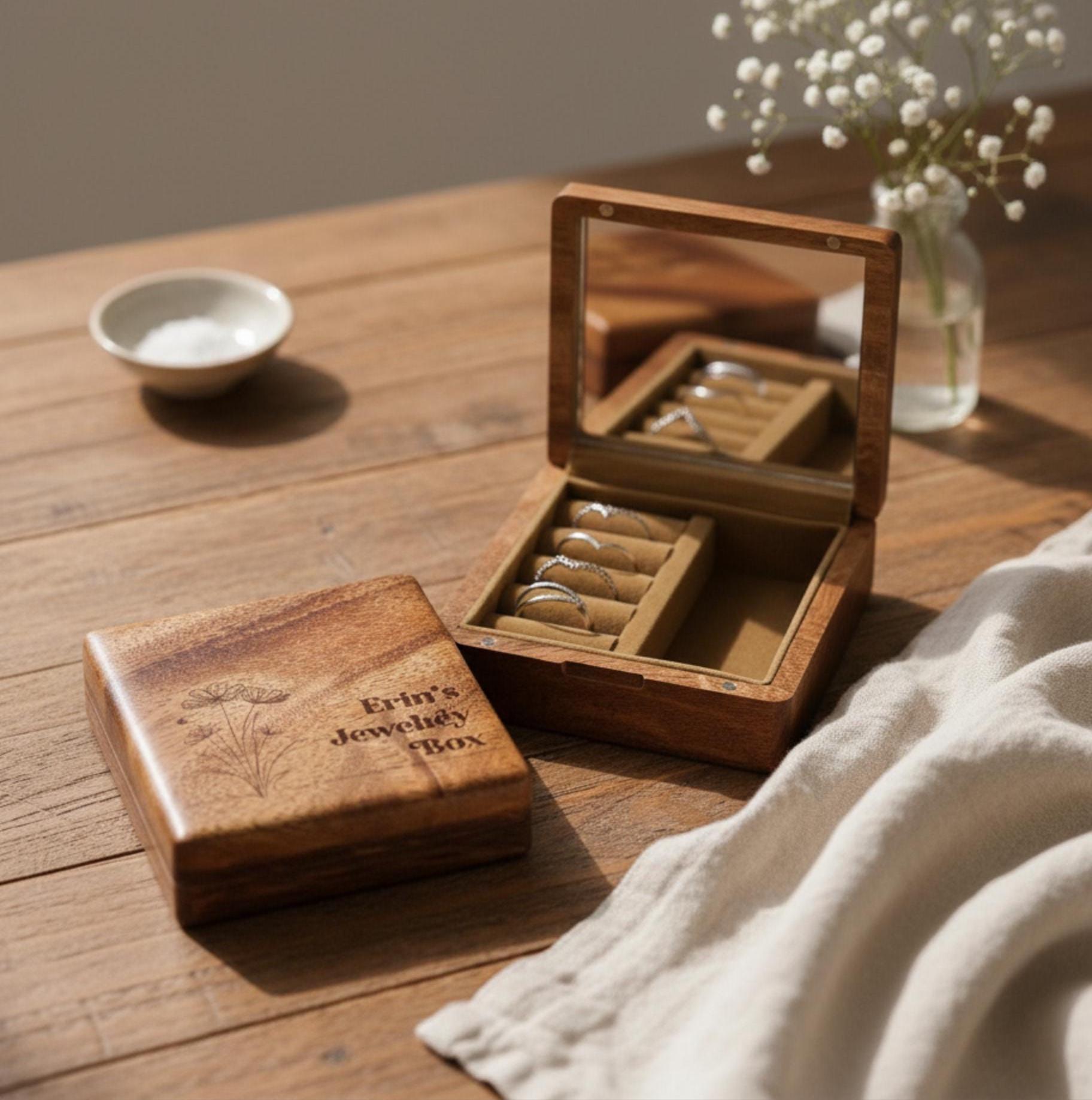 These personalized jewelry boxes are the perfect blend of elegance and sentiment, making them an ideal gift for bridesmaids, weddings, Christmas, Mother's Day, or any special occasion. Crafted from solid natural wood, each jewelry box is unique, with its beautiful grain pattern that adds a touch of timeless beauty.