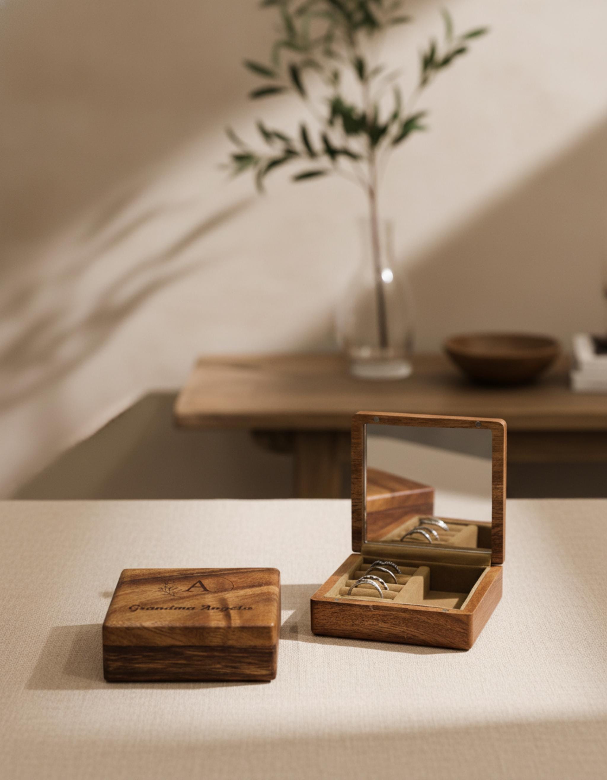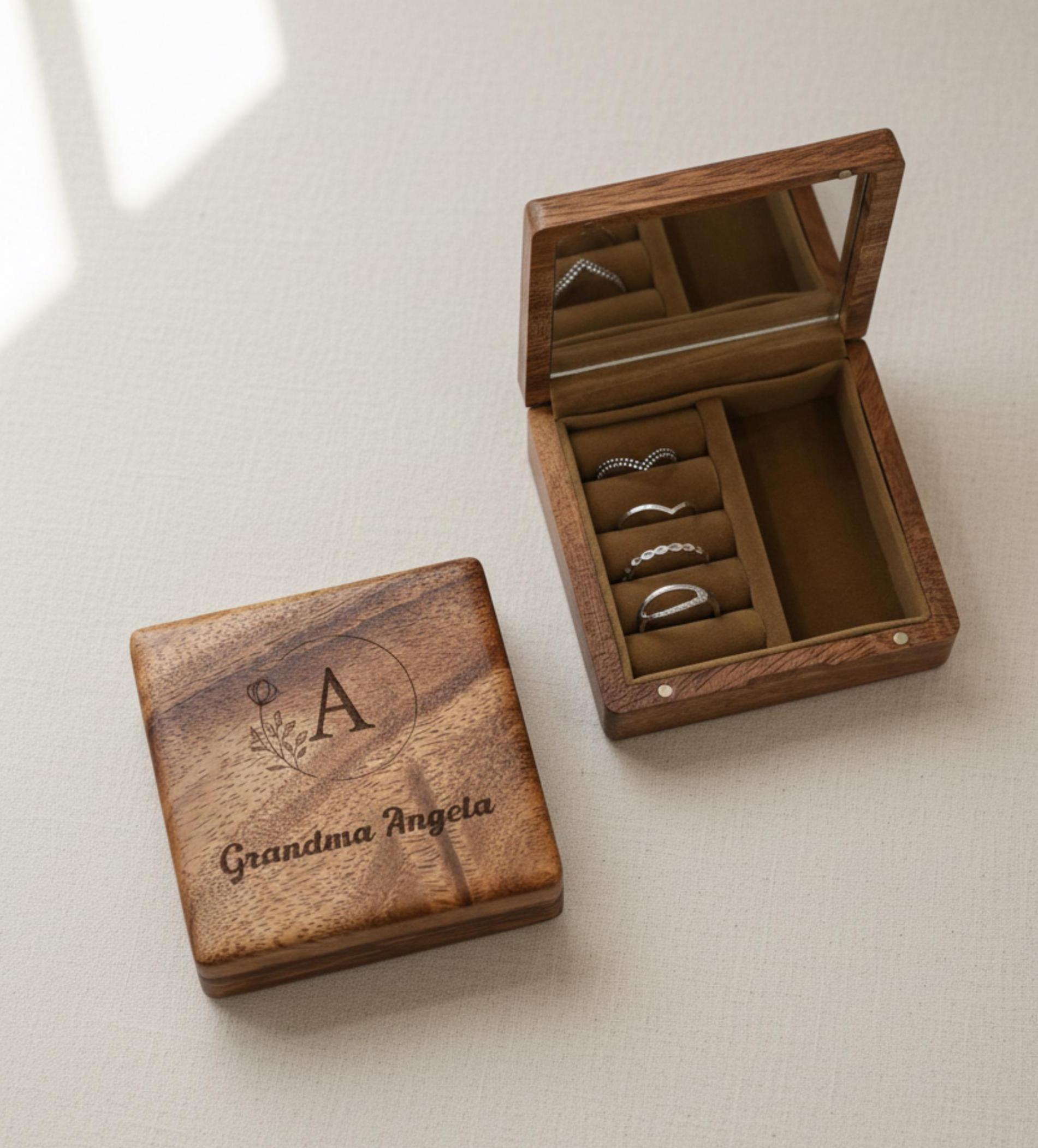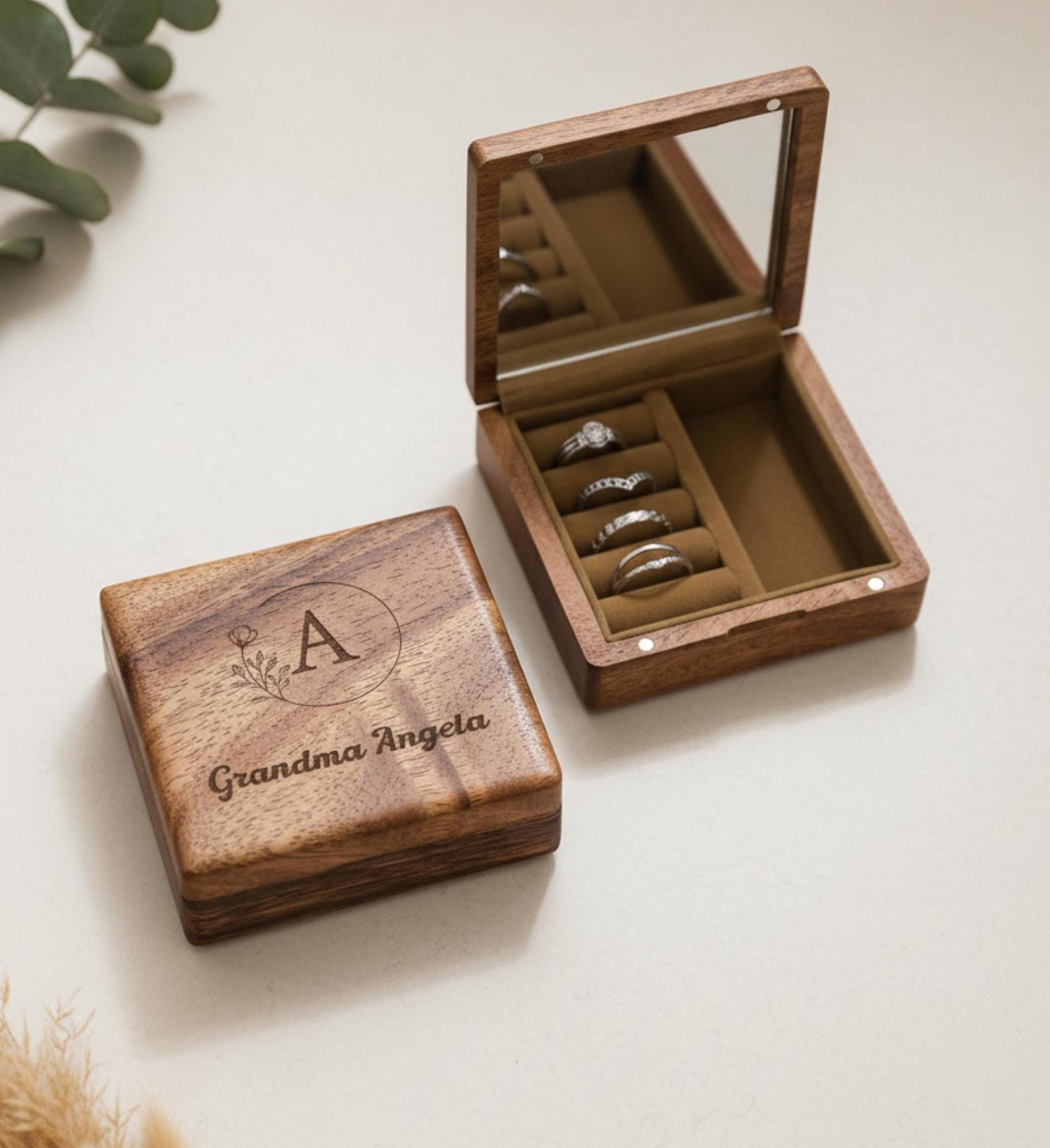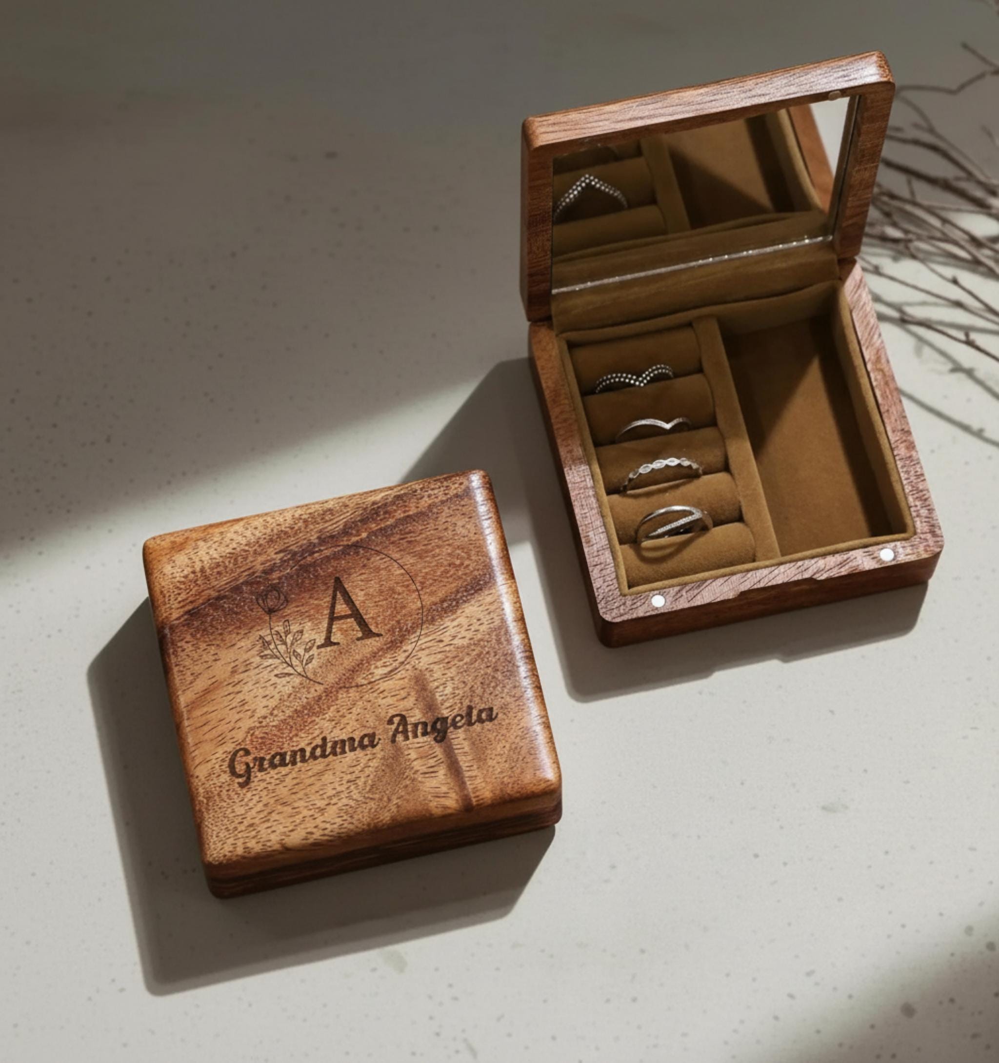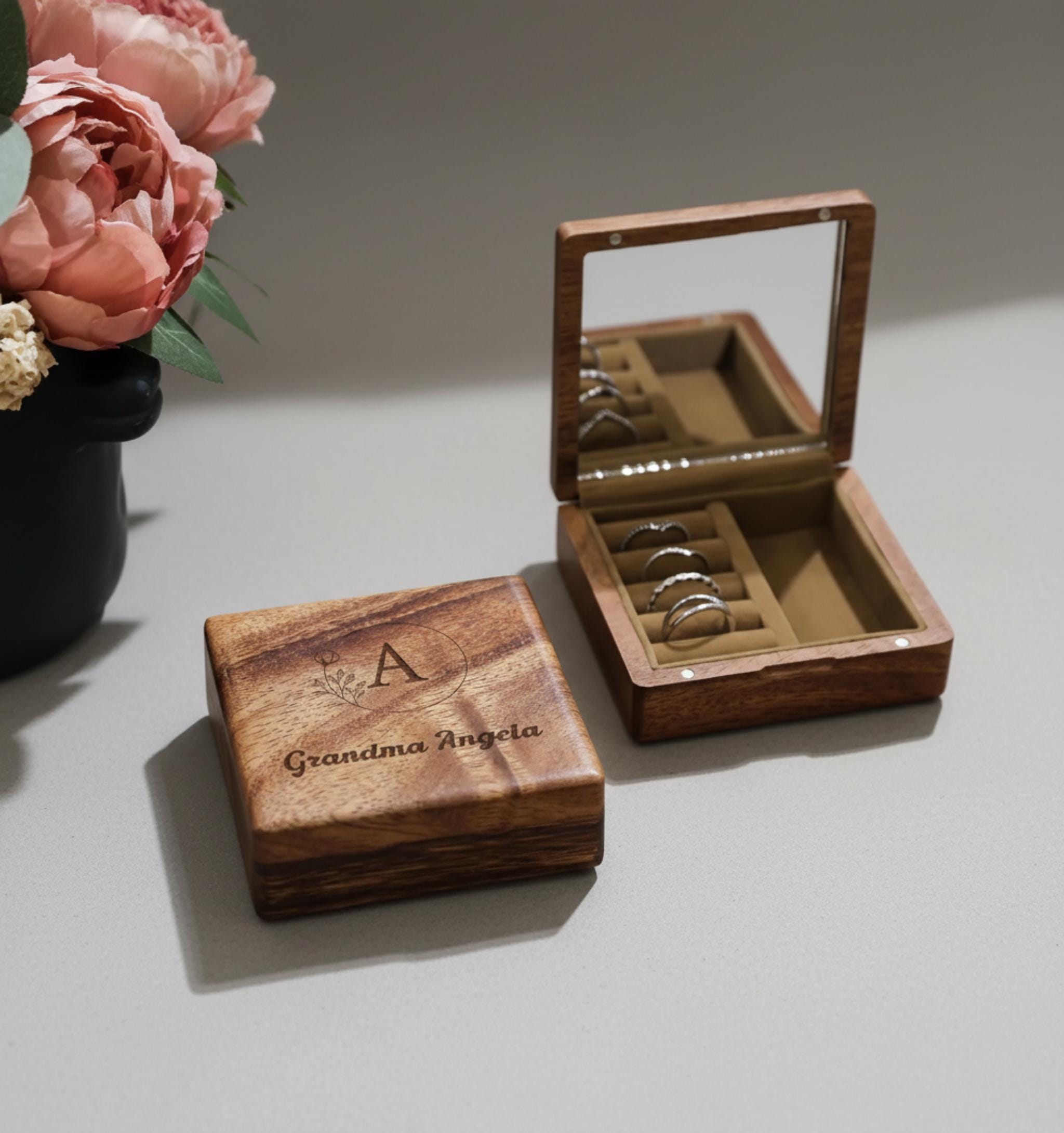 These personalized jewelry boxes are the perfect blend of elegance and sentiment, making them an ideal gift for bridesmaids, weddings, Christmas, Mother's Day, or any special occasion. Crafted from solid natural wood, each jewelry box is unique, with its beautiful grain pattern that adds a touch of timeless beauty.