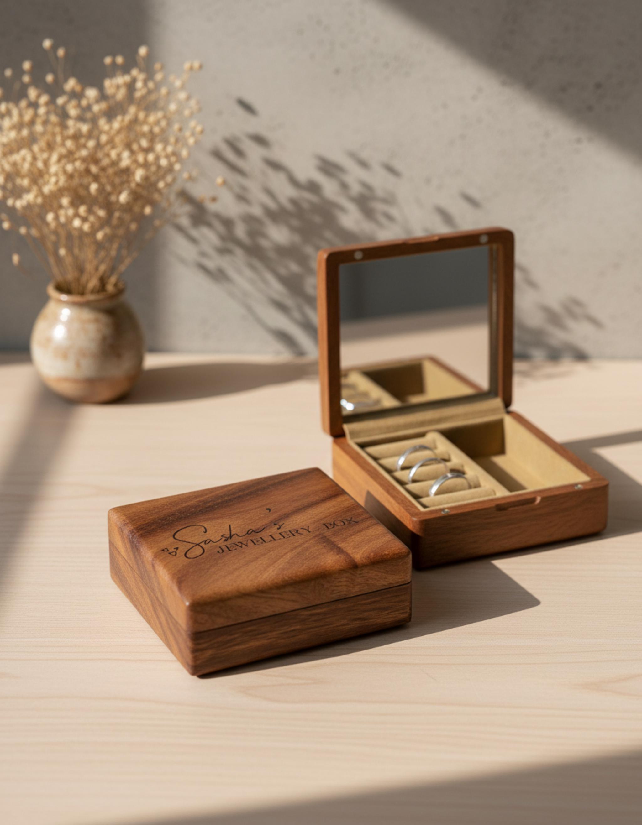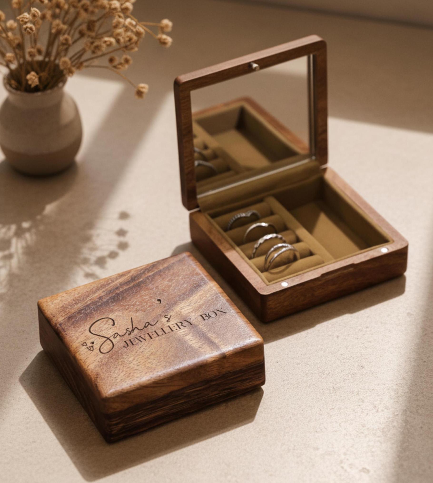 These personalized jewelry boxes are the perfect blend of elegance and sentiment, making them an ideal gift for bridesmaids, weddings, Christmas, Mother's Day, or any special occasion. Crafted from solid natural wood, each jewelry box is unique, with its beautiful grain pattern that adds a touch of timeless beauty.