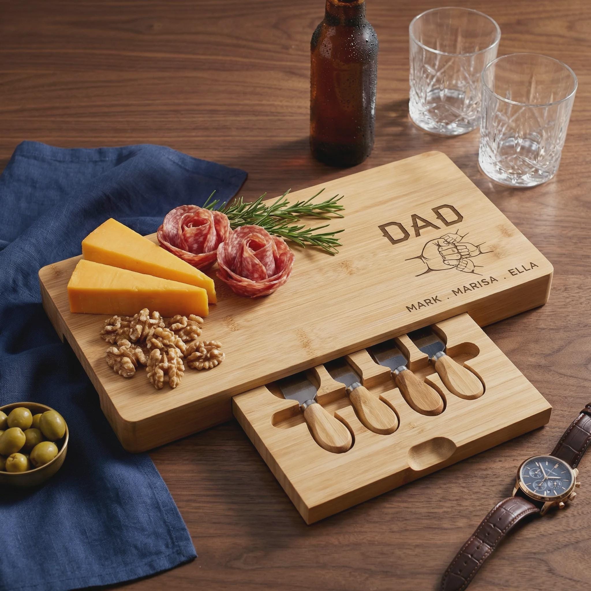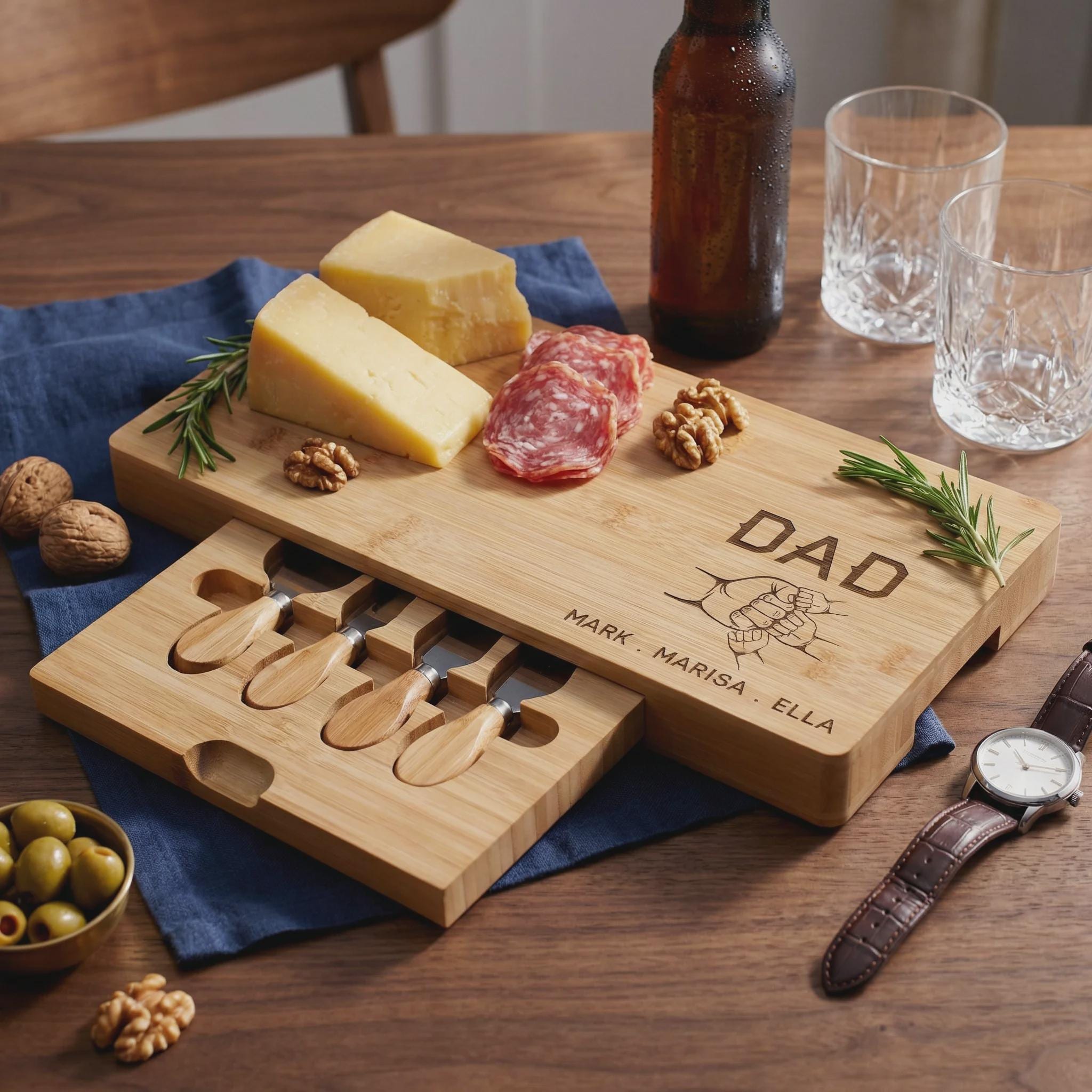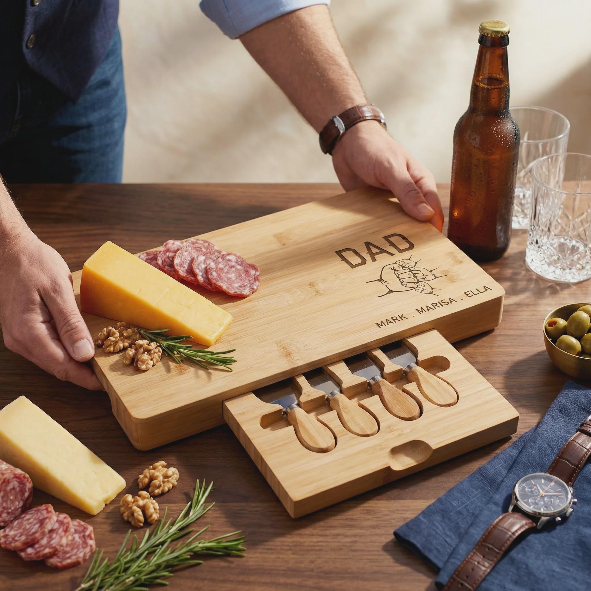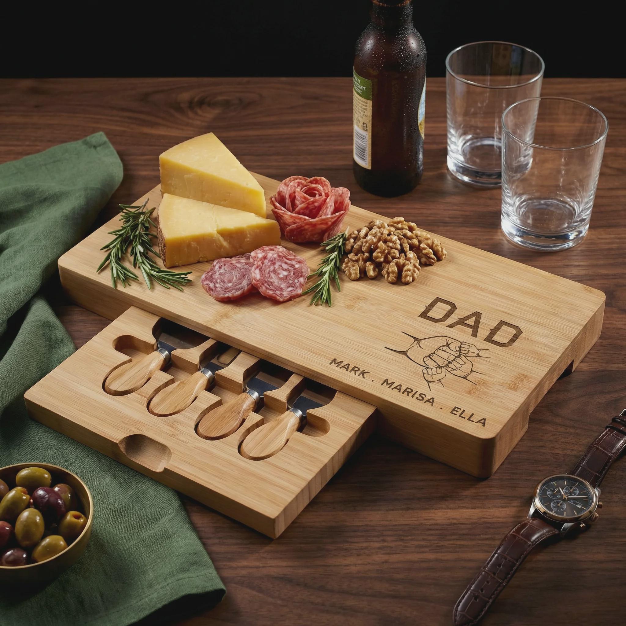 Celebrate the bond between father and children with this handcrafted bamboo charcuterie board, featuring a unique fist bump design personalized with your chosen names. This premium serving set includes a hidden slide-out drawer with four professional stainless steel cheese tools, making it a sentimental and functional keepsake for any home chef. It is a high-quality, sustainable wood centerpiece designed for family gatherings, birthdays, or a thoughtful Father’s Day surprise.