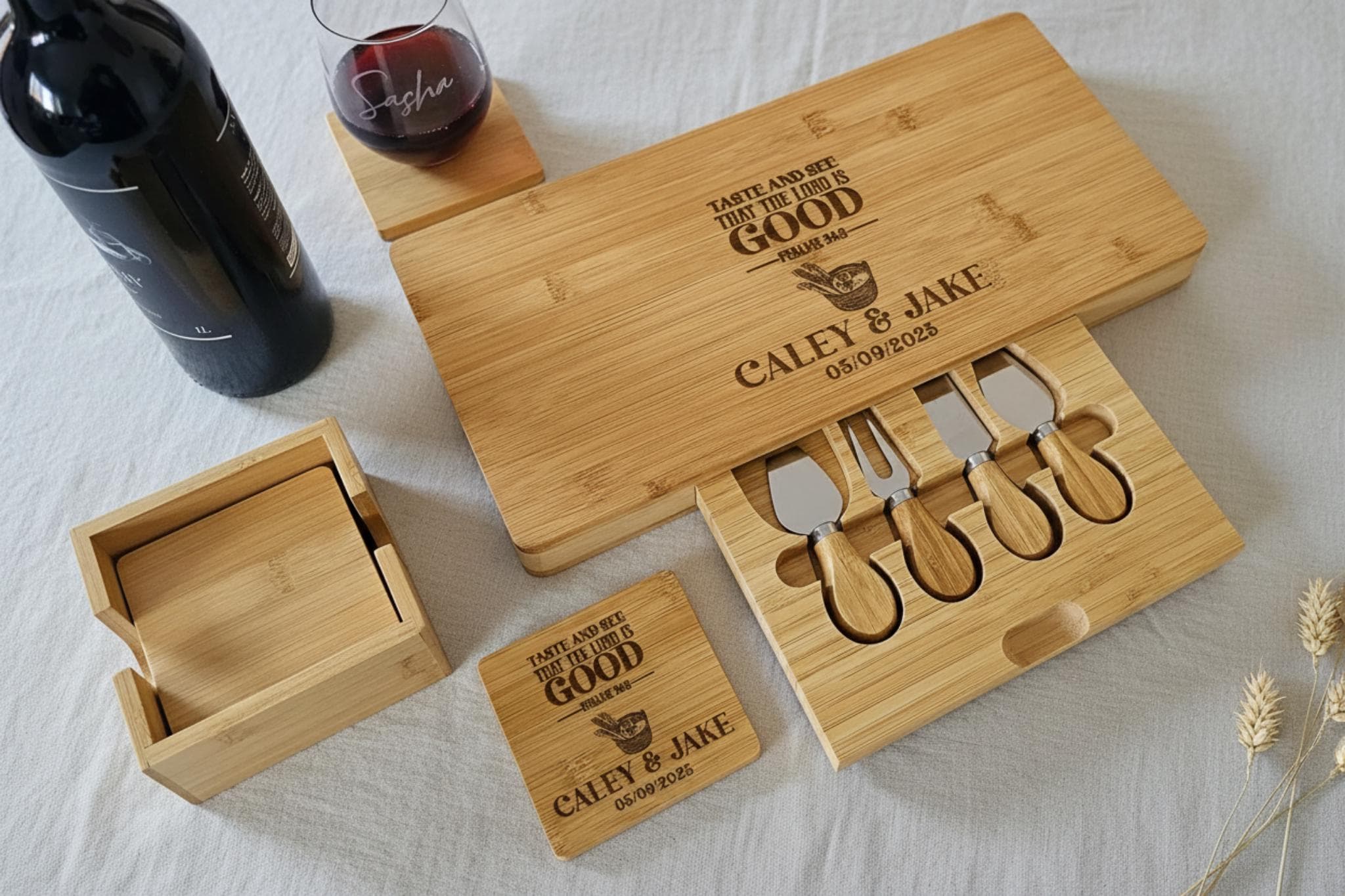 These personalized charcuterie boards are a perfect fusion of creativity and practicality, designed to elevate every celebration. Unleash your creativity and celebrate life’s special moments with our custom-engraved cheese board set. Crafted from eco-friendly materials, this personalized board serves as the perfect centerpiece for weddings, bridal showers, engagements, housewarmings, and everyday entertaining.