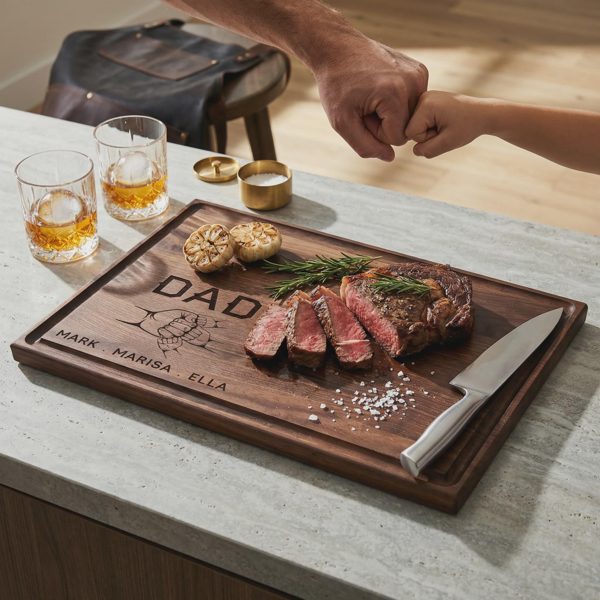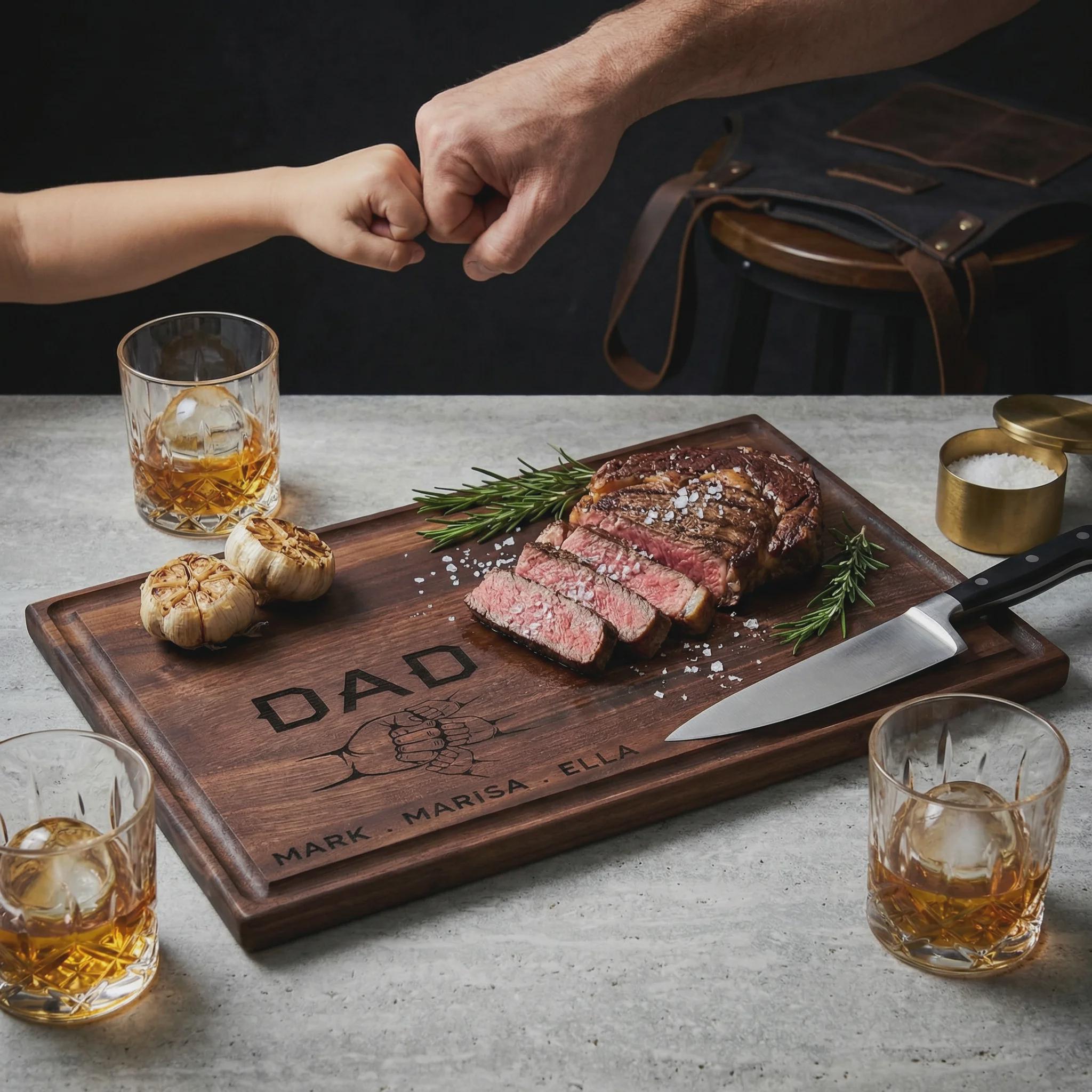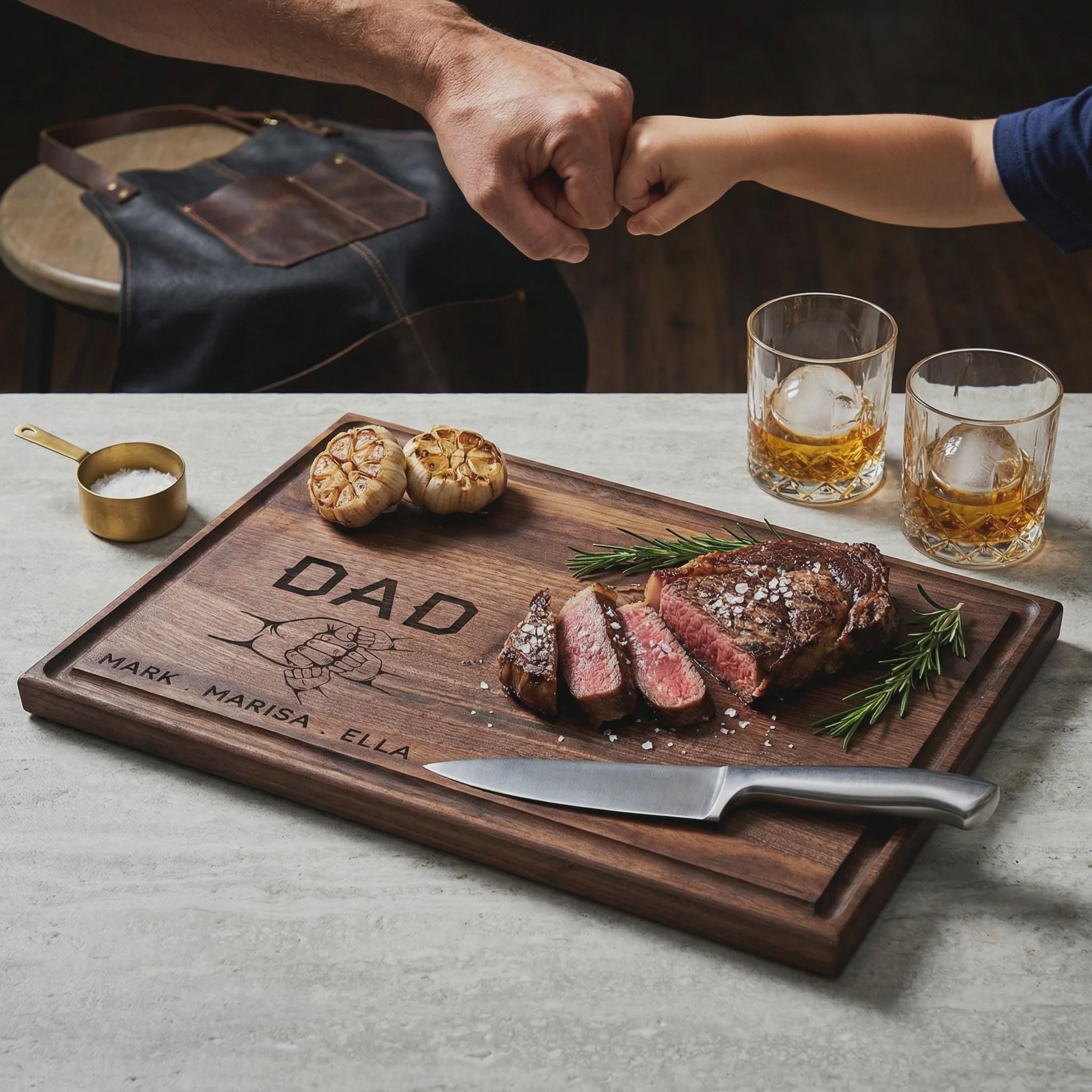 Celebrate your favorite hero with this personalized cutting board for dad, featuring a sentimental family fist-bump design. This custom engraved wood platter is professionally etched with children's names, making it a cherished Father’s Day keepsake or a unique retirement surprise. Whether he is a seasoned chef or a weekend grill master, this high-quality walnut serving tray adds professional-grade style to every backyard BBQ and home kitchen celebration.