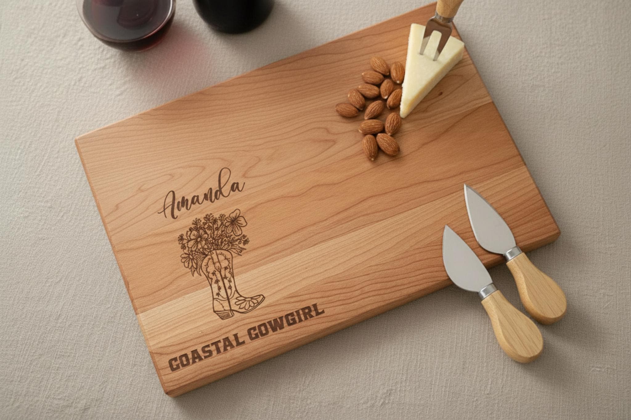 Personalized Charcuterie Board – Coastal Cowgirl: Custom Cutting Board, Cowgirl Boots, Wife, Mom, Daughter, Kitchen Decor, Birthday Gift