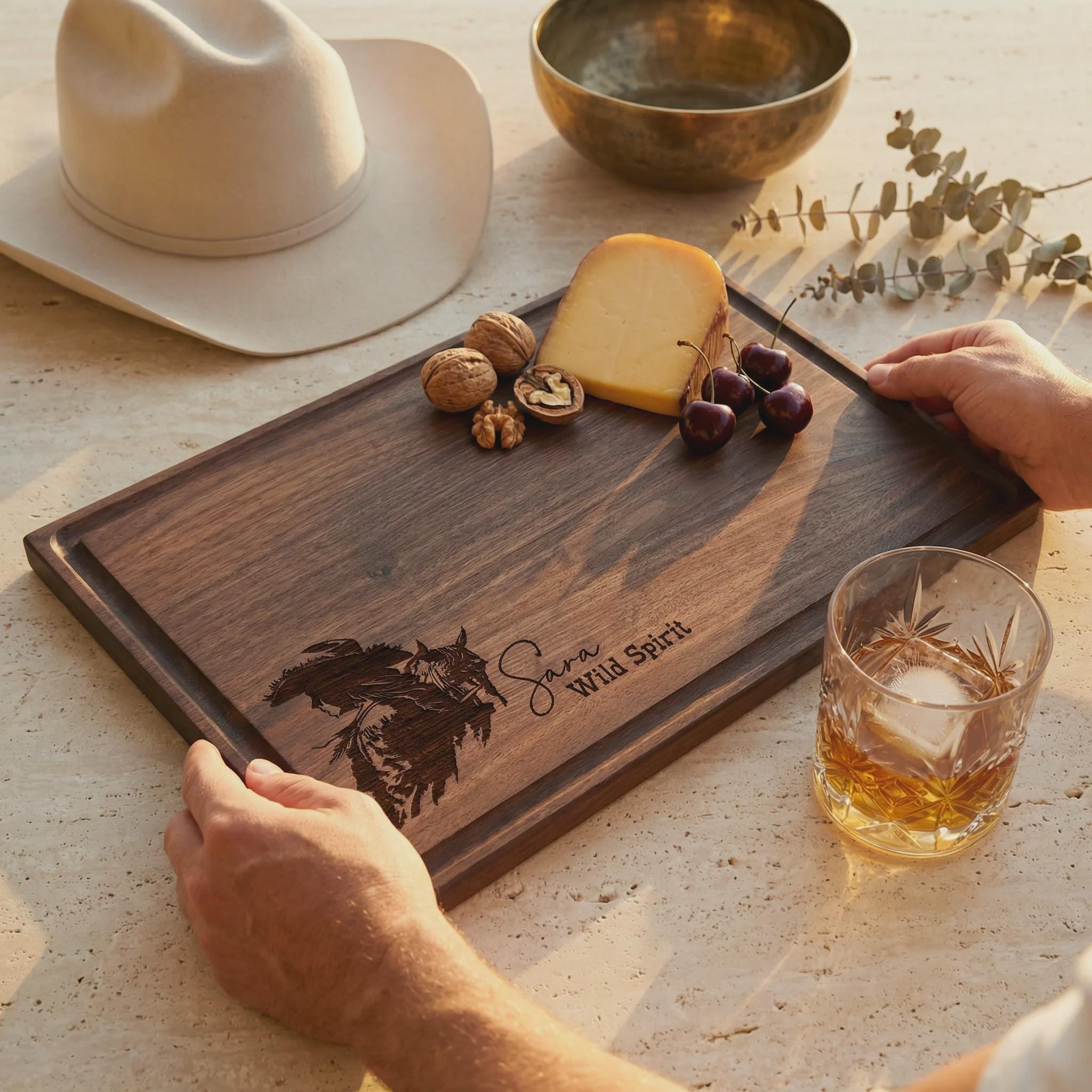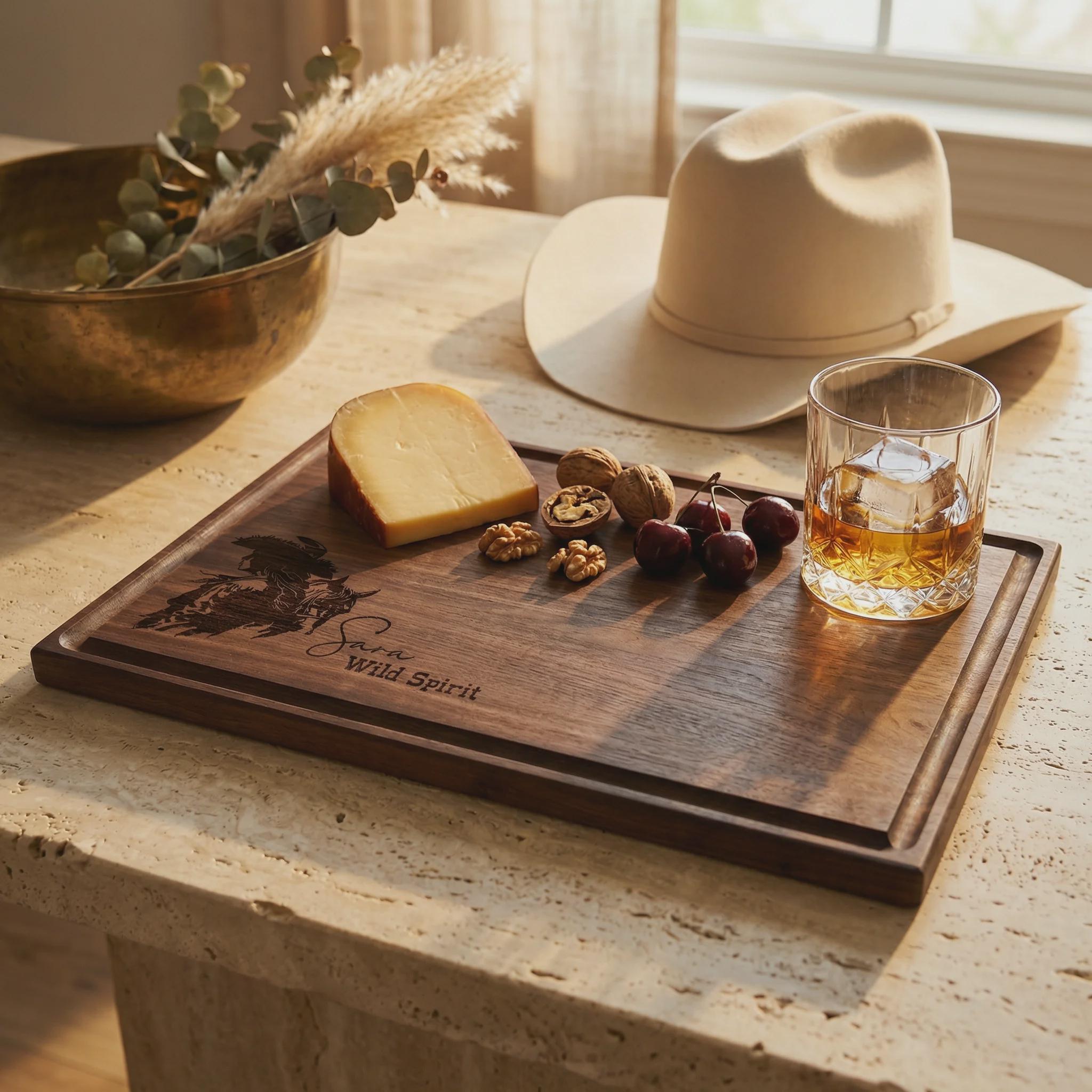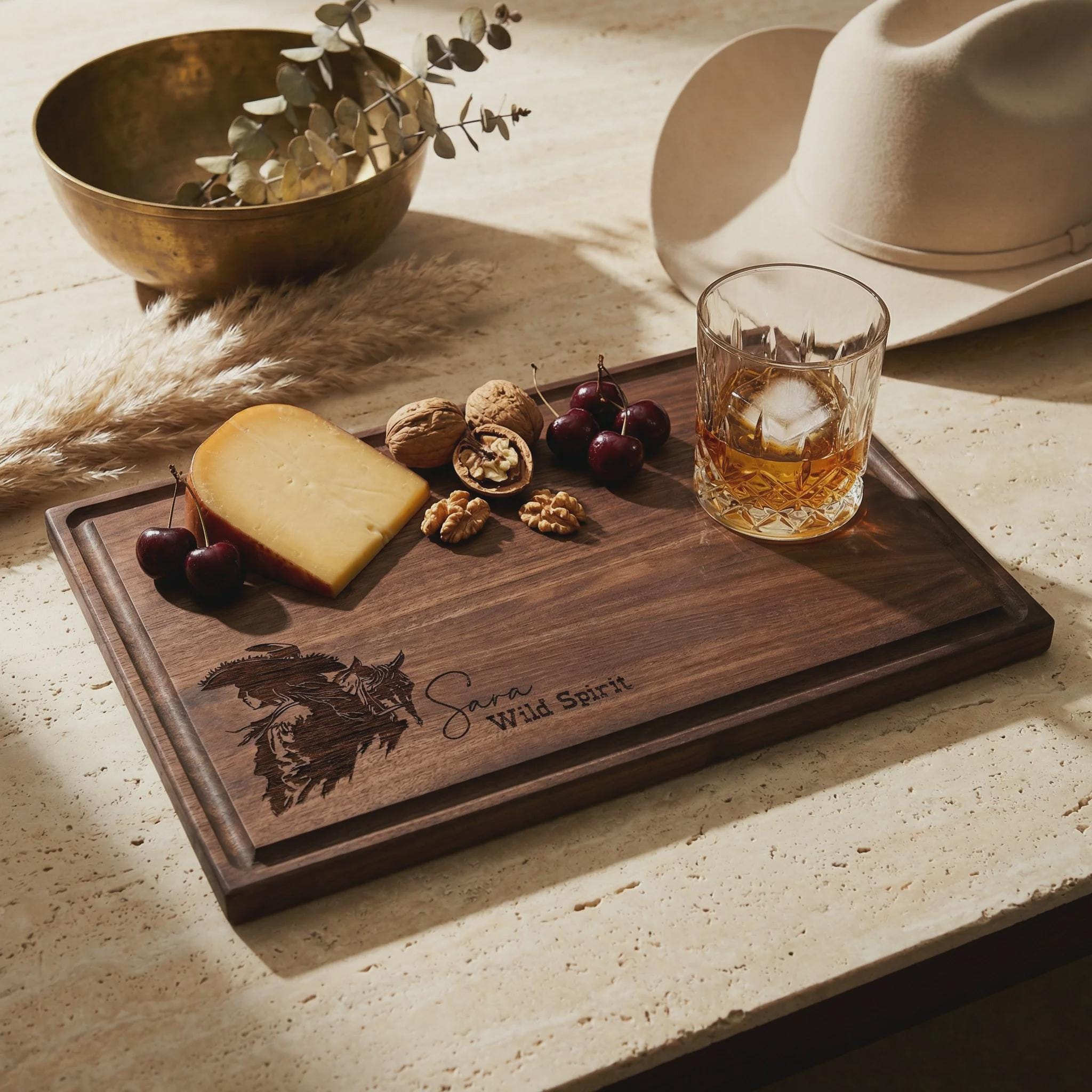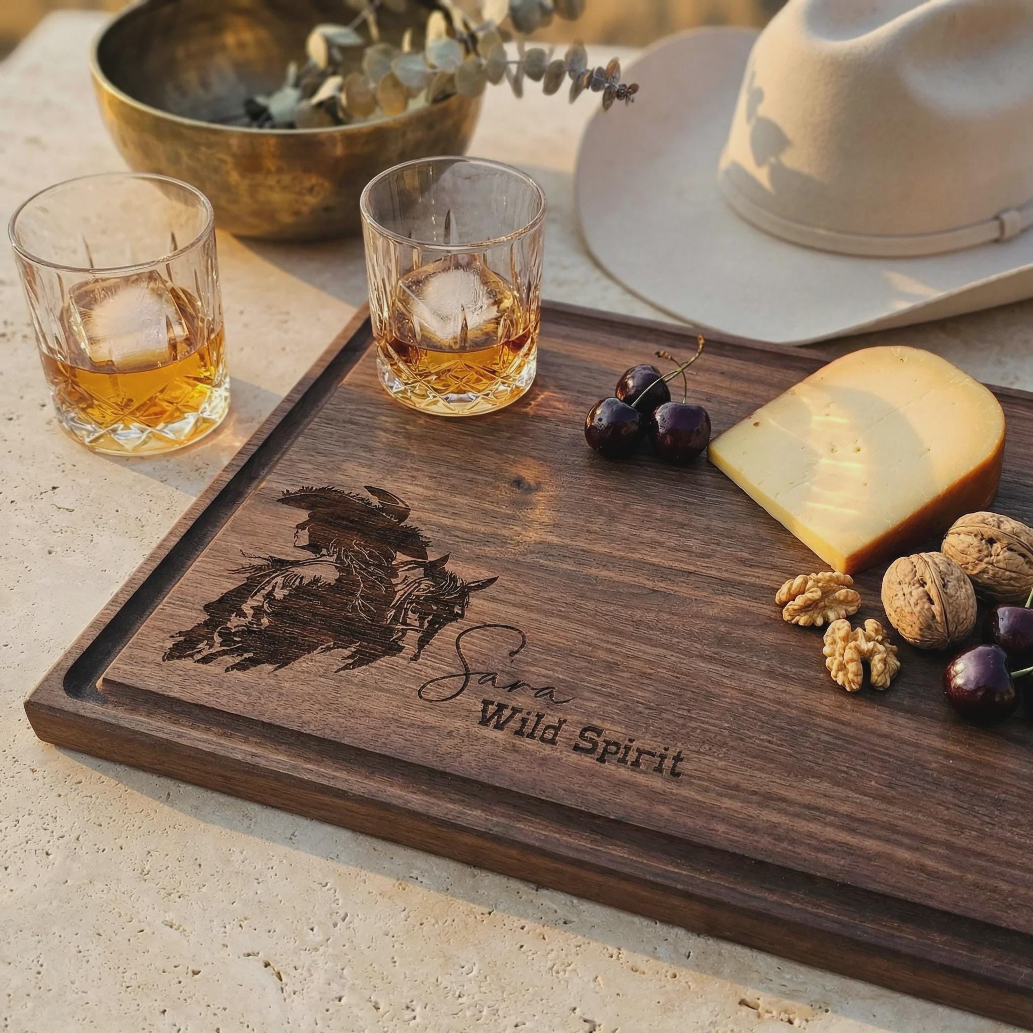Personalized Cowgirl Cutting Board, Custom Engraved Western Platter, Horse Spirit Wood Server