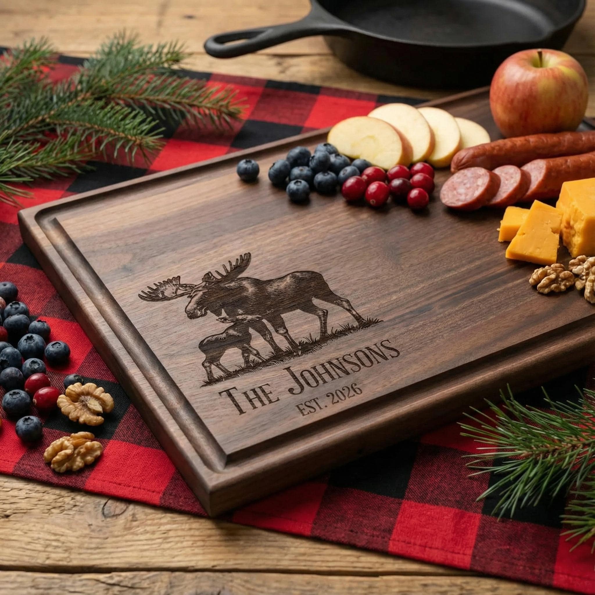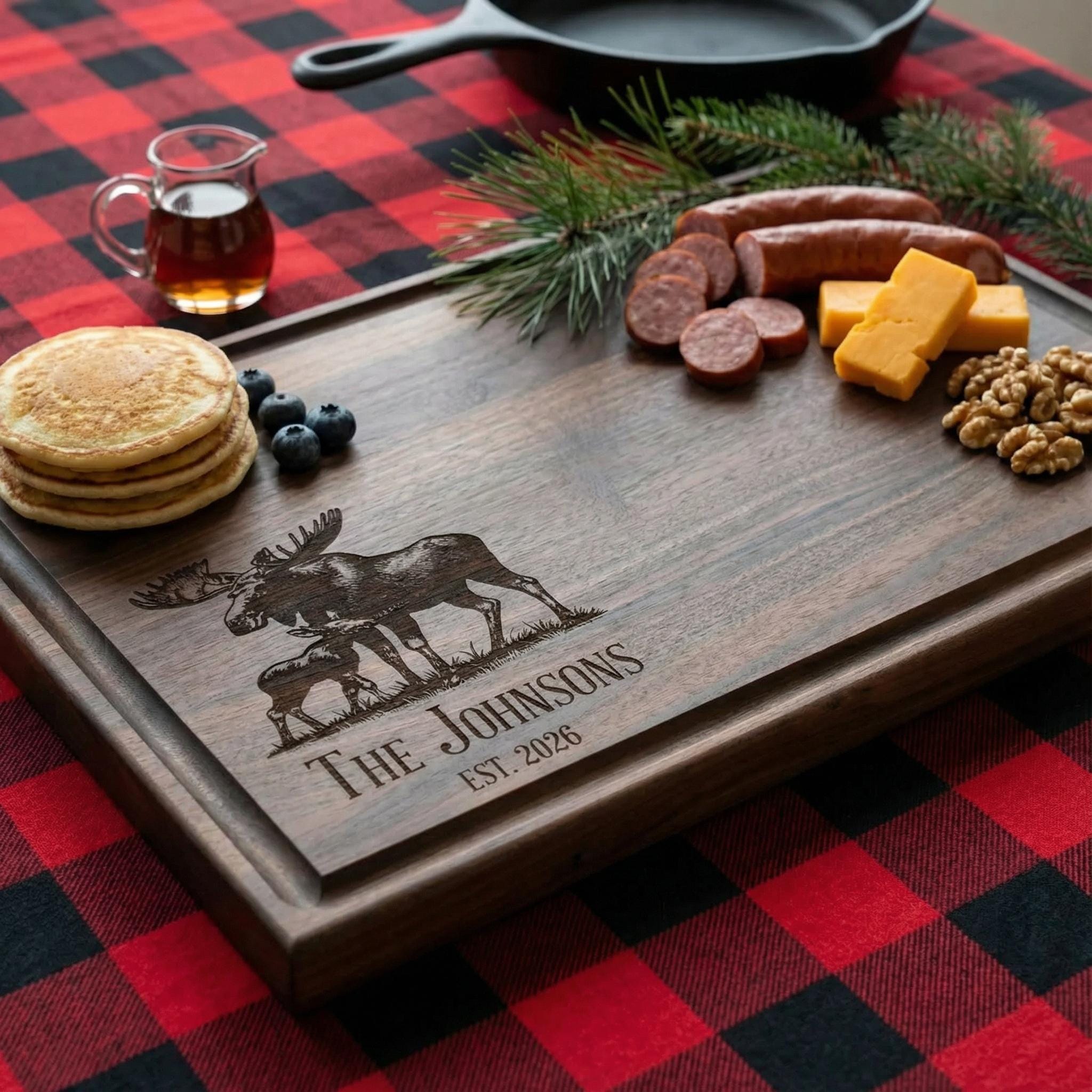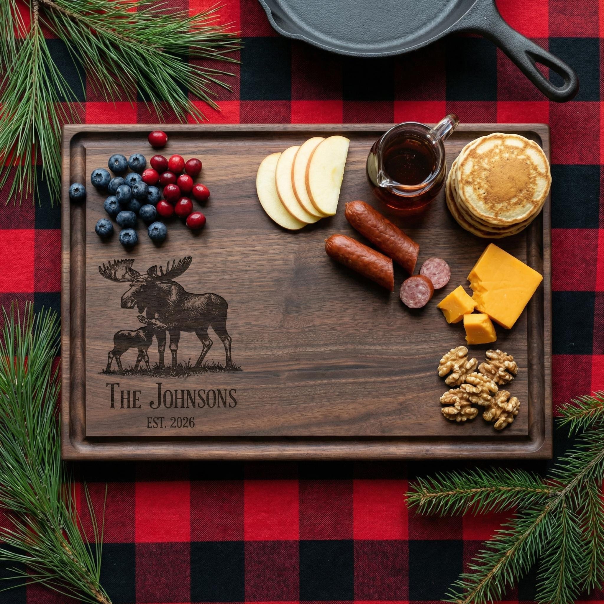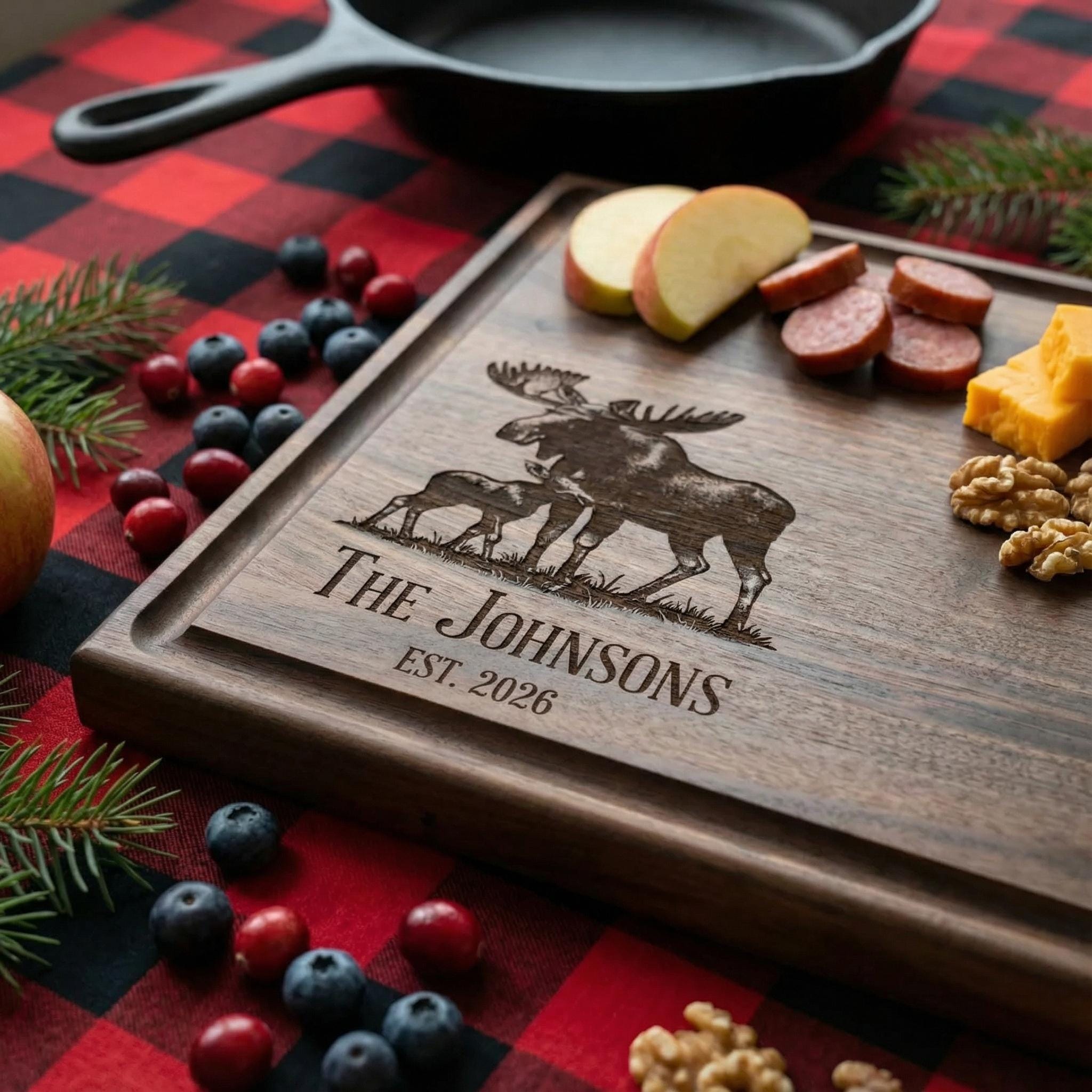 Bring the majesty of the north woods into your kitchen with this personalized moose cutting board. Professionally custom-engraved on premium dark walnut wood, this rustic charcuterie platter features a detailed bull moose and calf silhouette alongside your family name and established year. It serves as a meaningful cabin decor keepsake for lodge owners, a unique wedding memento for nature lovers, or a high-quality cottage-warming gift designed to last through every hunt, breakfast, and forest-themed gathering