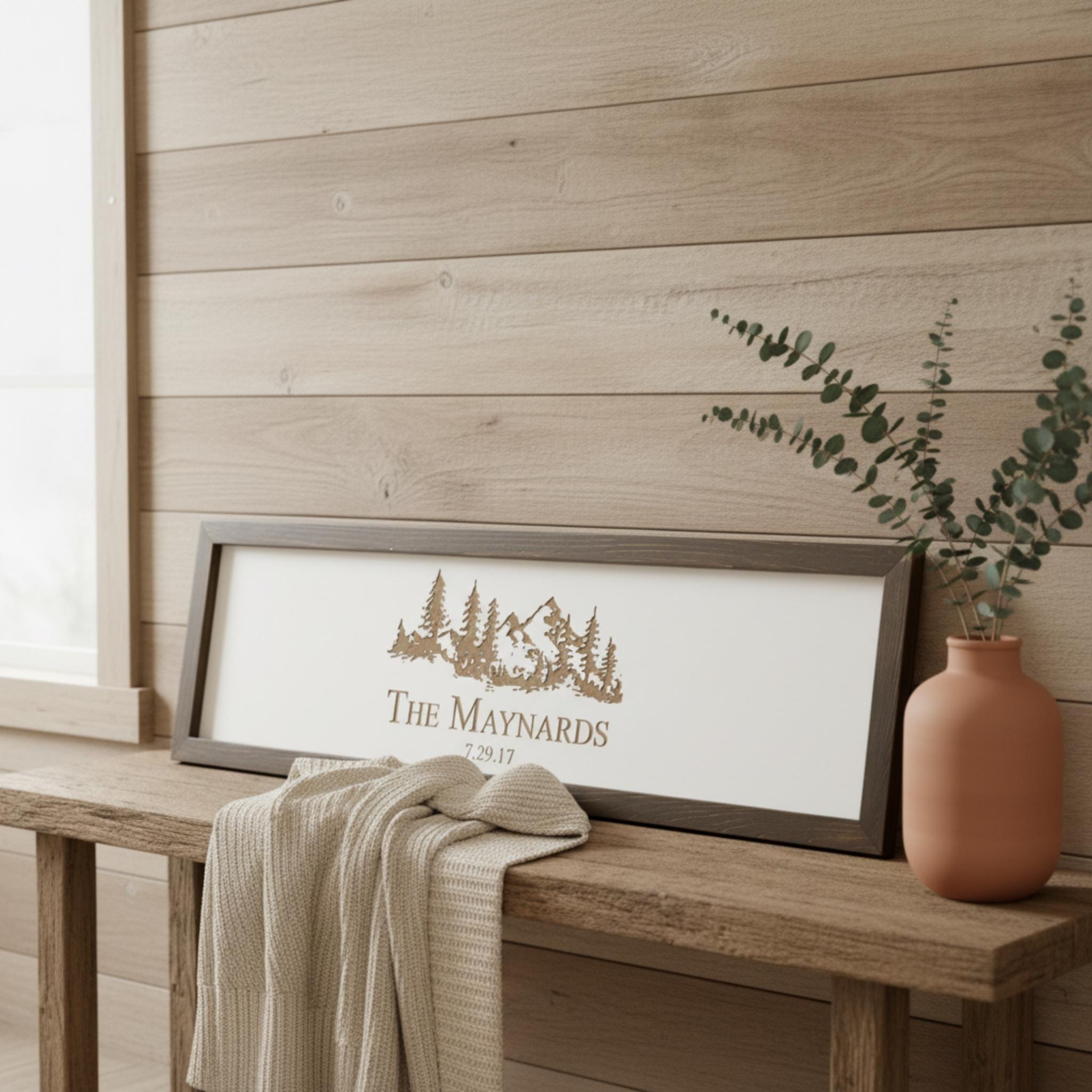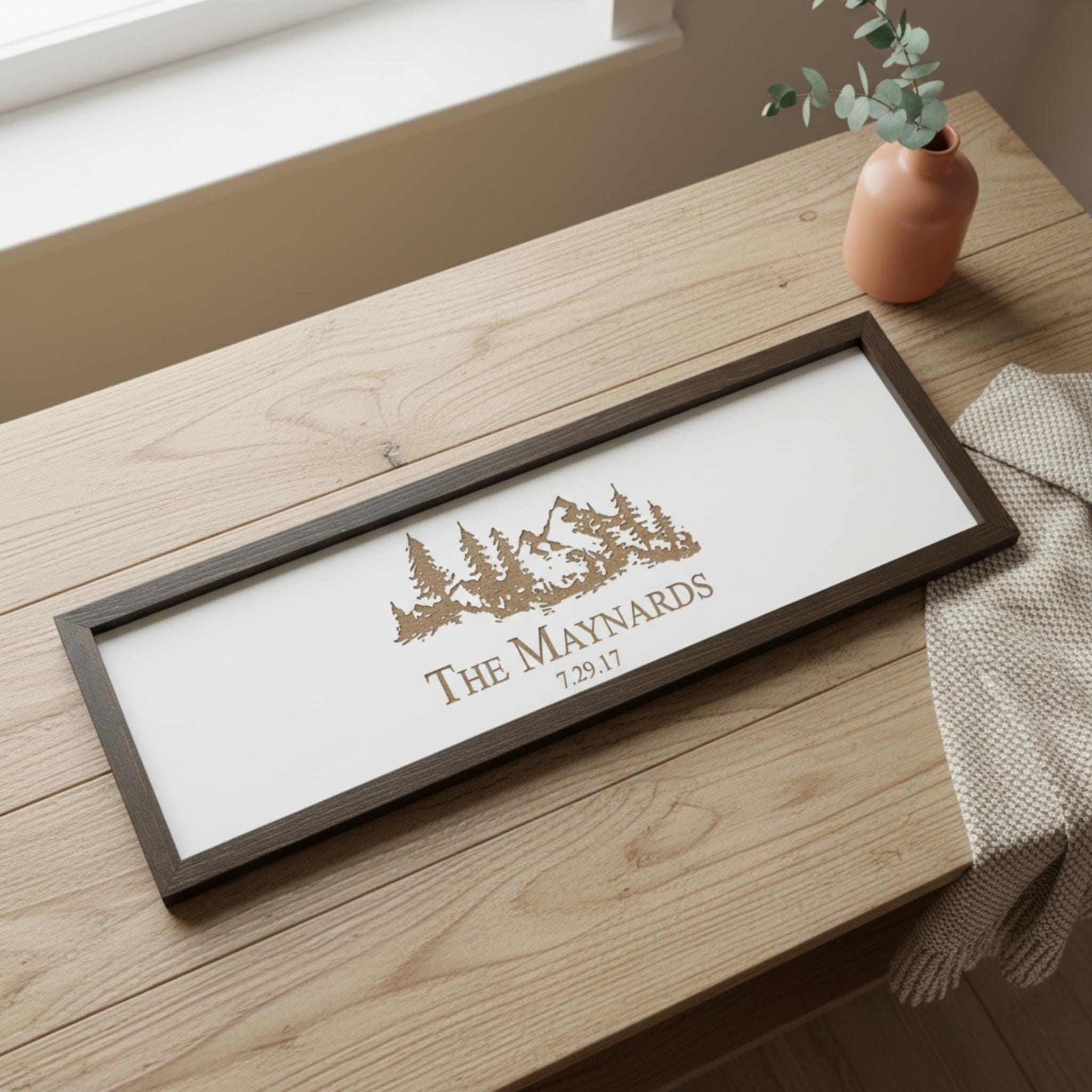 These personalized wooden signs bring the wilderness indoors with a majestic mountain range and serene pine forest laser-engraved onto a 28″×8″ solid wood canvas. Crafted for chalet retreats and lake houses, each sign features: