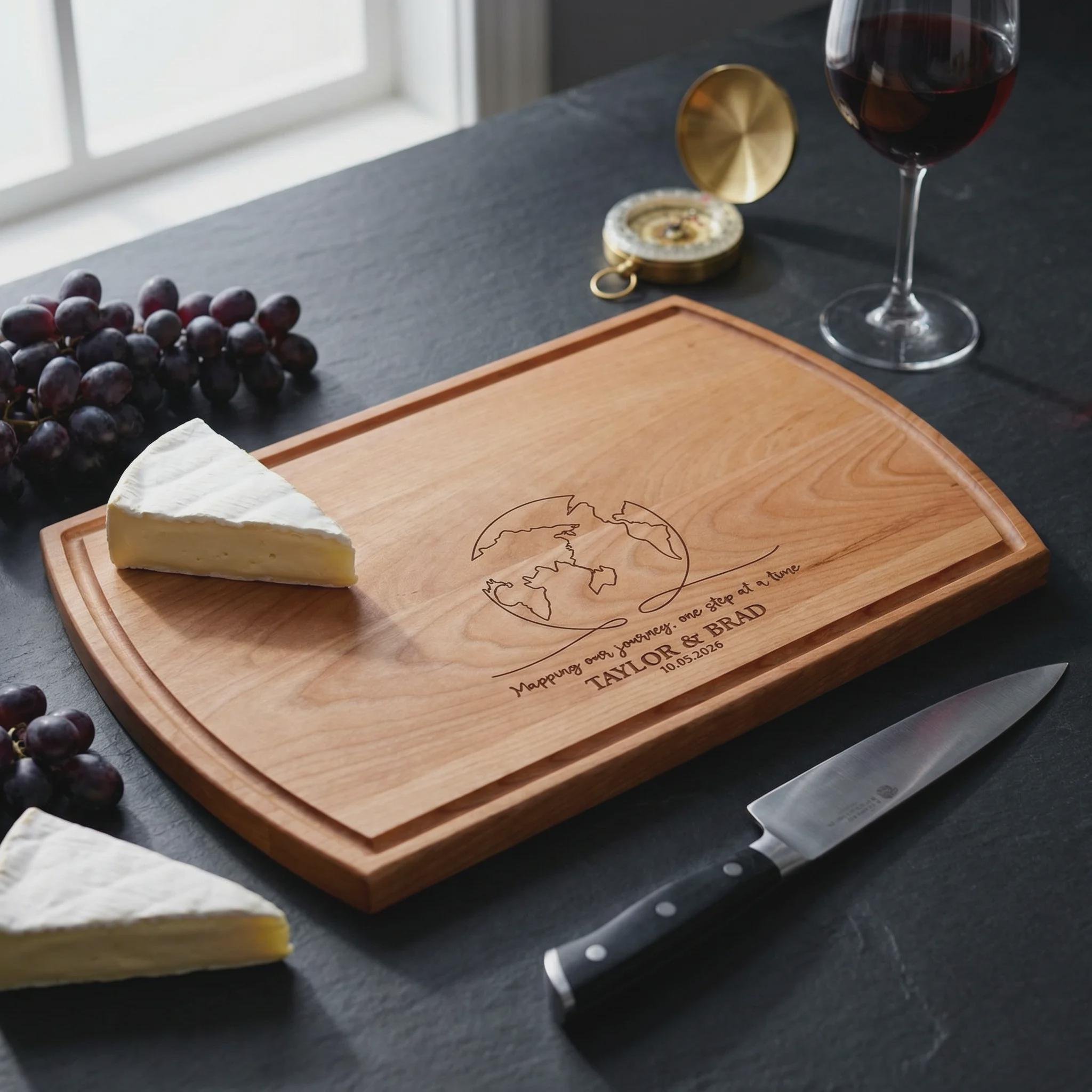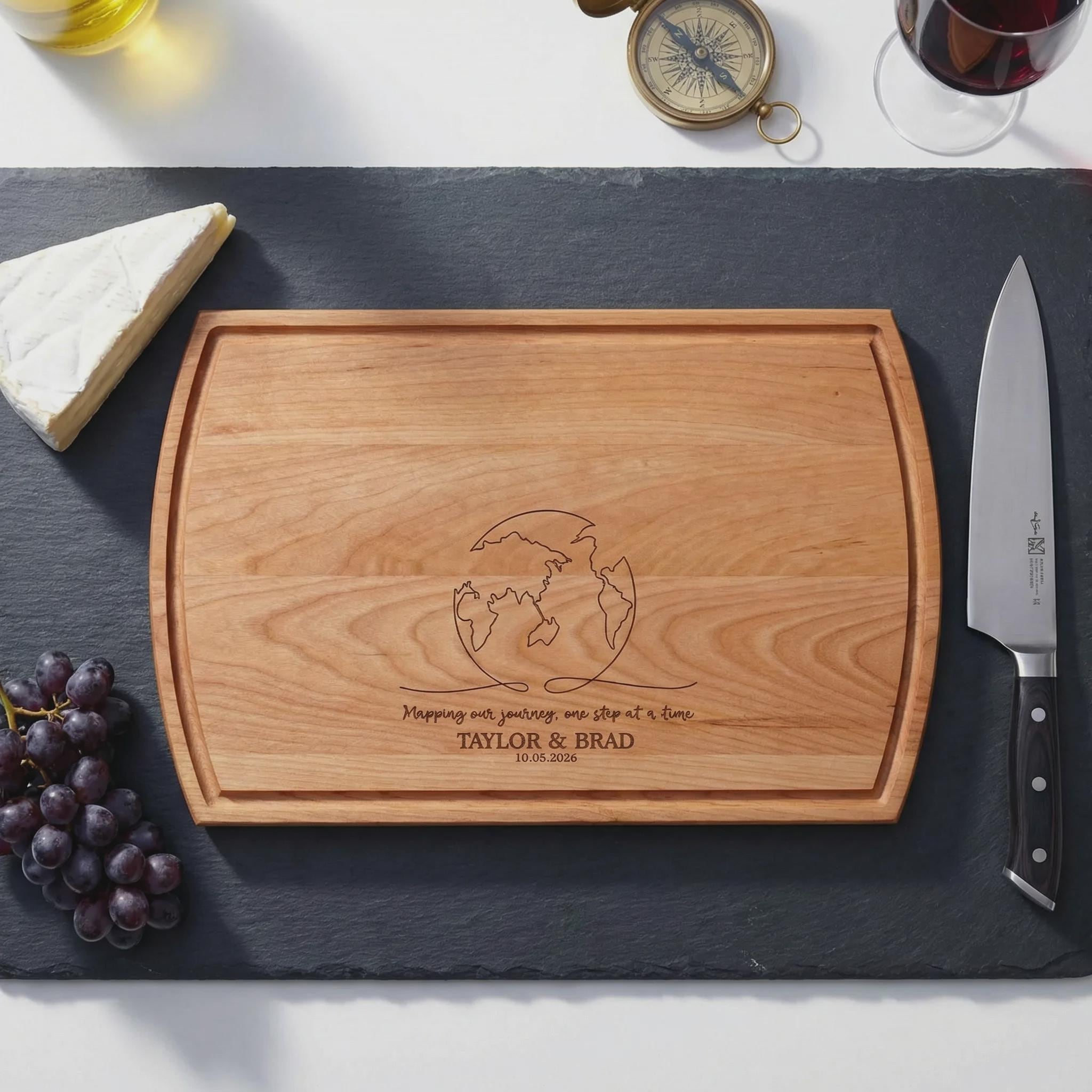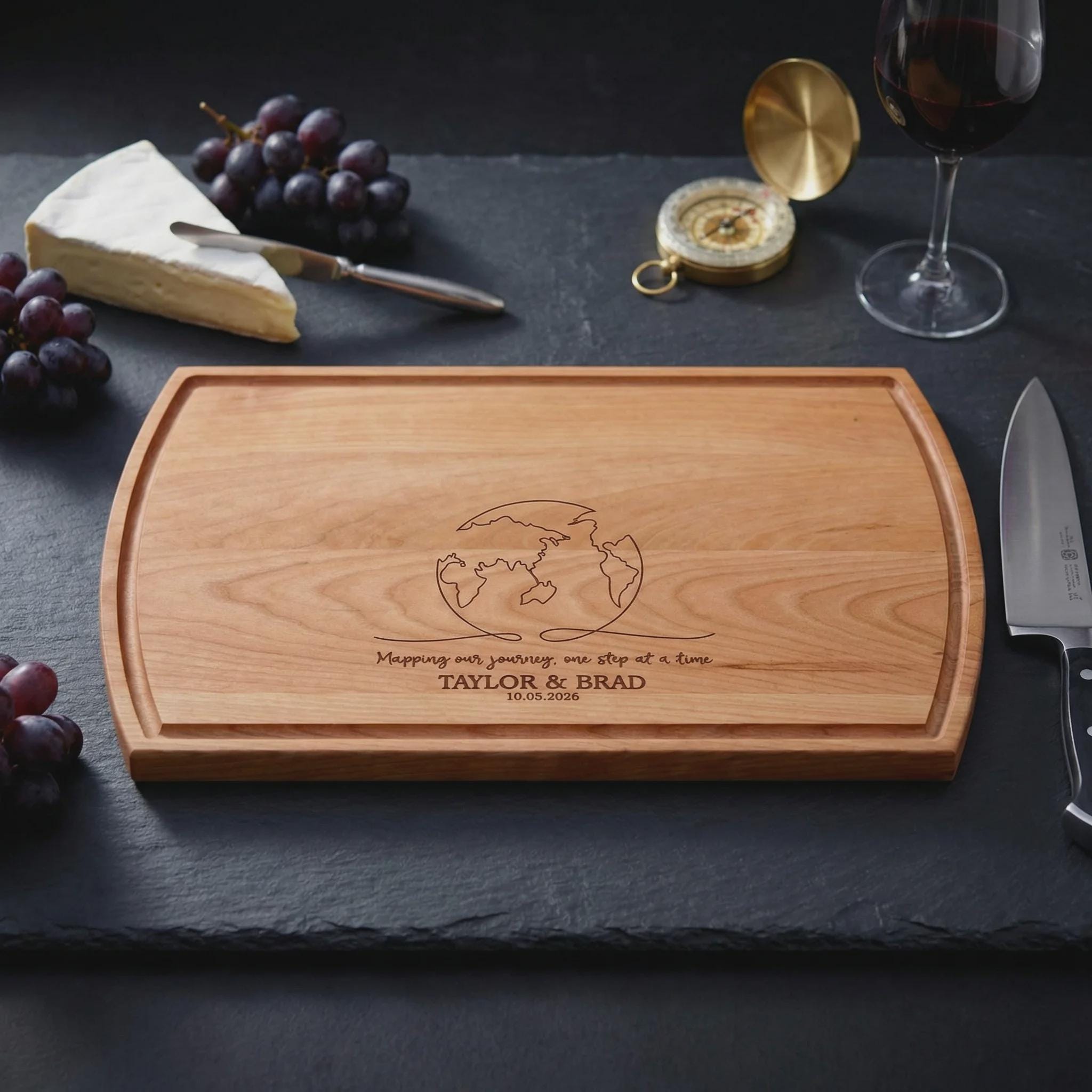Celebrate your story with this Personalized World Map Charcuterie Board. Engraved with the touching quote "Mapping our journey, one step at a time," this custom wood cutting board is the ultimate wedding gift, adventure-themed anniversary keepsake, or housewarming surprise. Featuring a premium finish and a functional juice groove, it serves as both a beautiful kitchen centerpiece and a lasting tribute to your travels together.