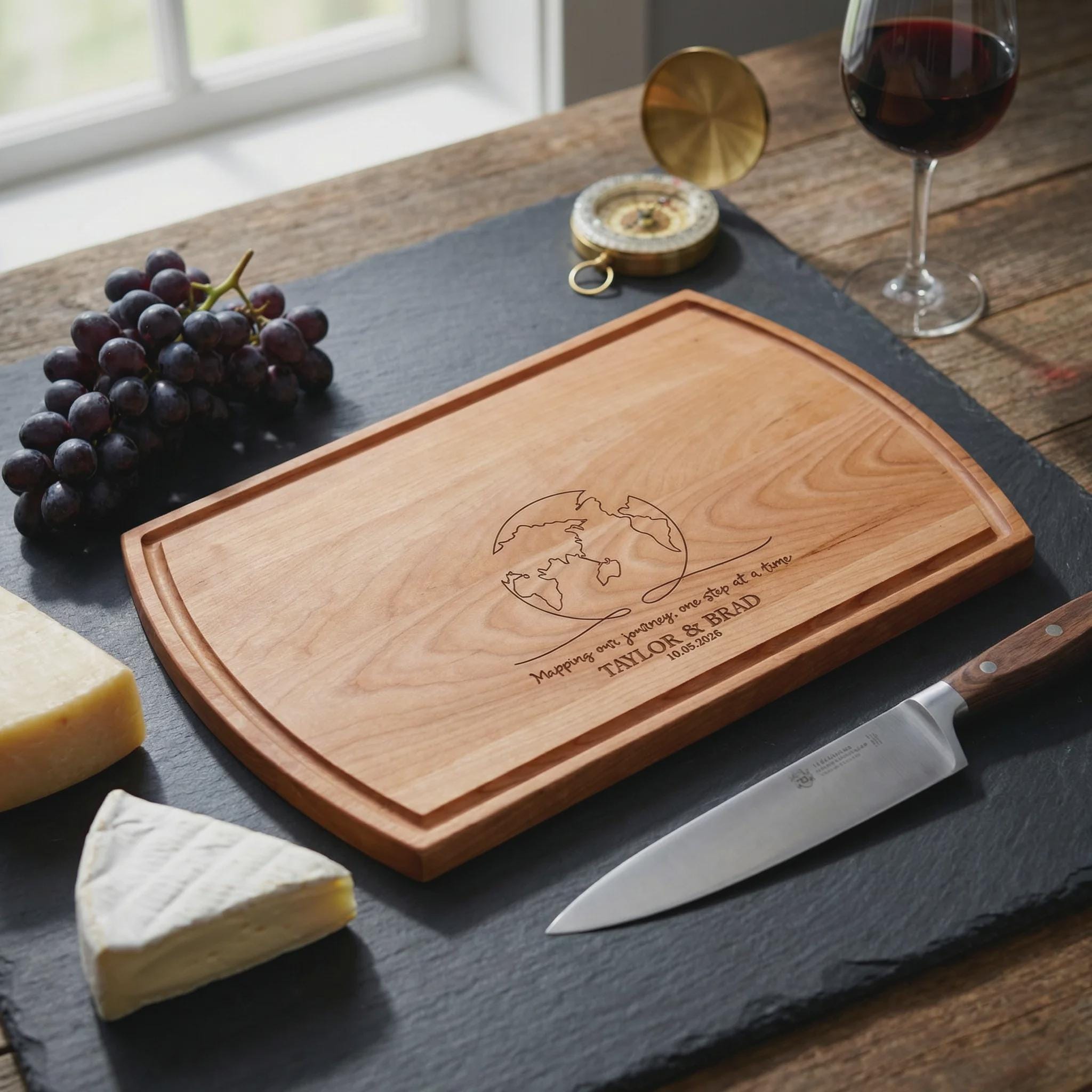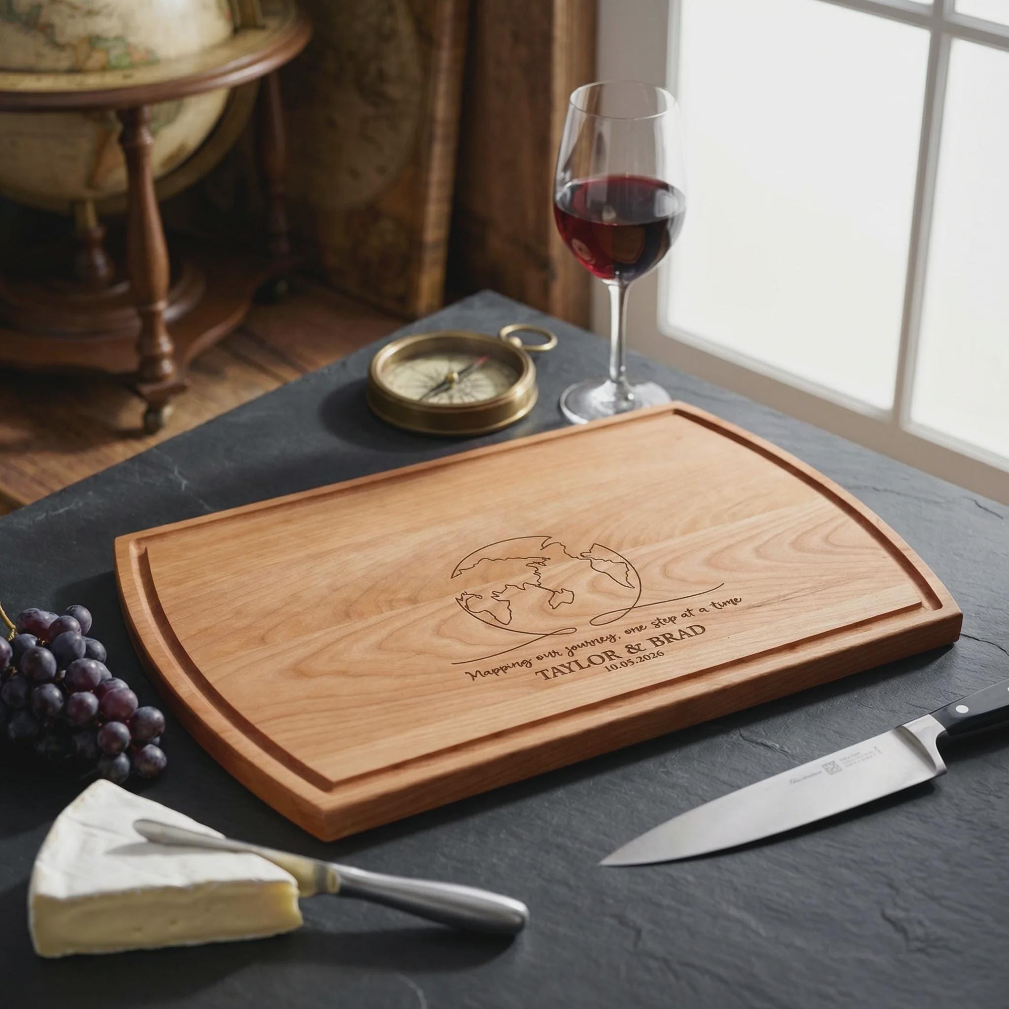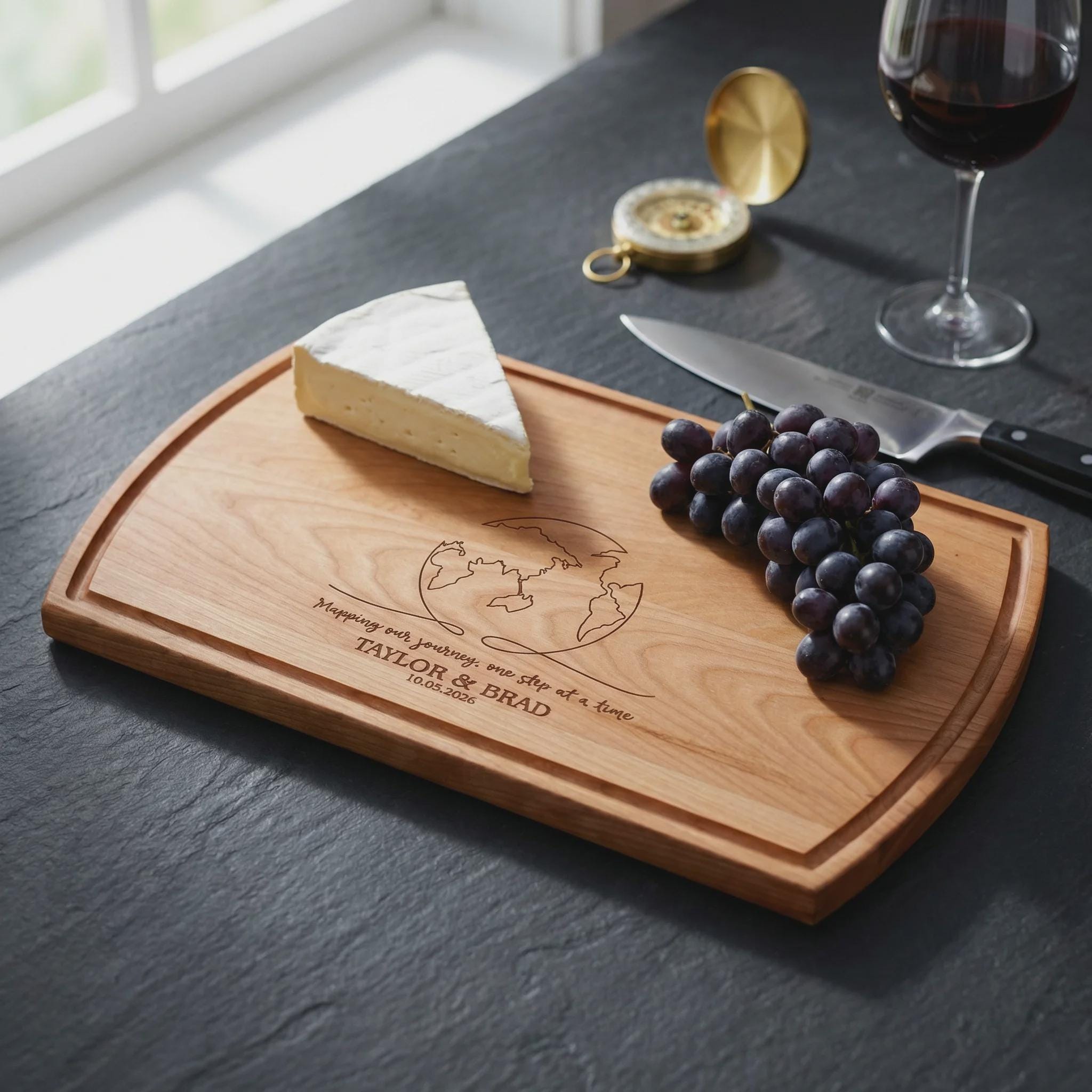 Celebrate your story with this Personalized World Map Charcuterie Board. Engraved with the touching quote "Mapping our journey, one step at a time," this custom wood cutting board is the ultimate wedding gift, adventure-themed anniversary keepsake, or housewarming surprise. Featuring a premium finish and a functional juice groove, it serves as both a beautiful kitchen centerpiece and a lasting tribute to your travels together.