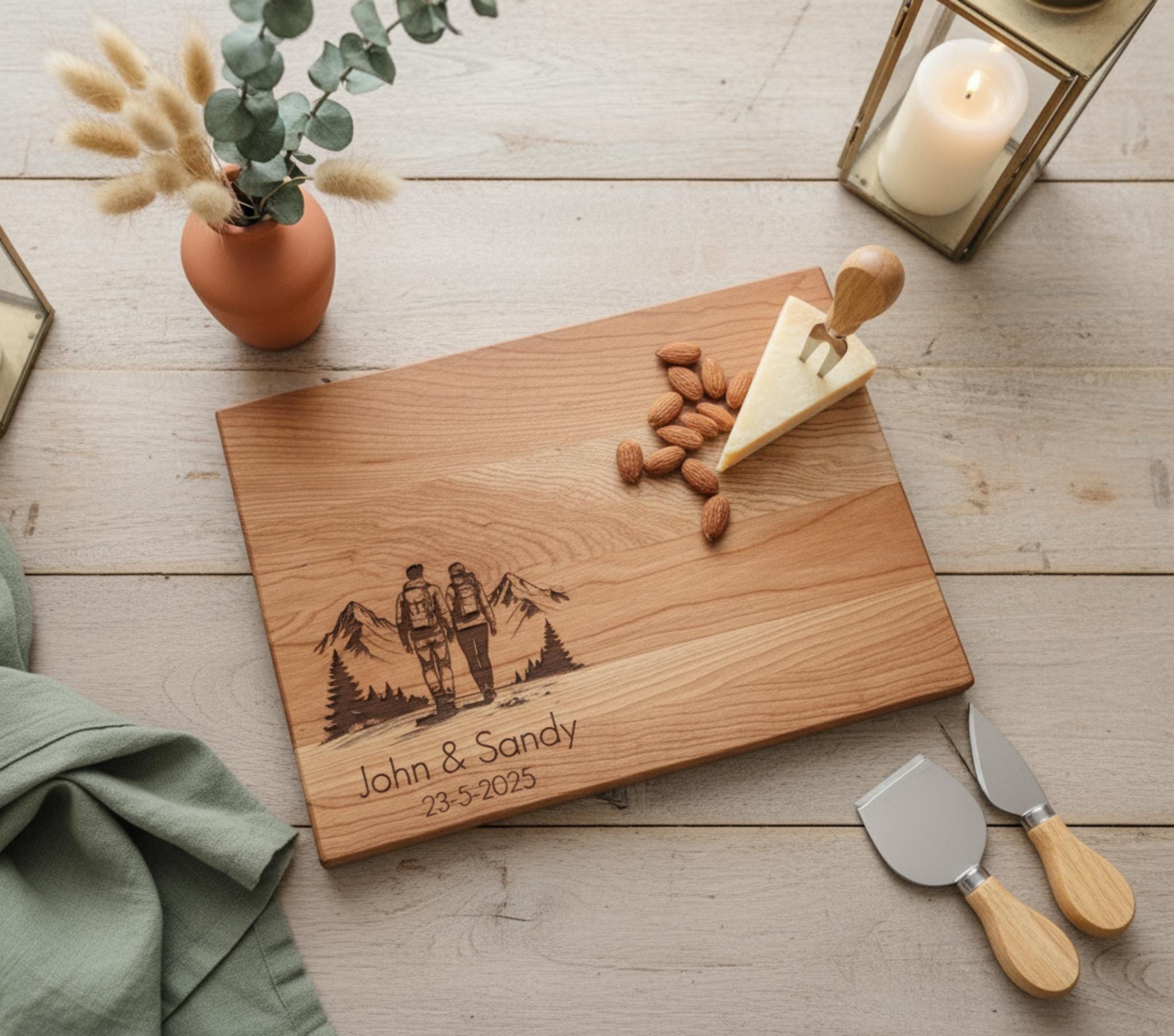 Custom Engraving: Personalize your board with your names alongside a refined outdoor design that speaks to your love for adventure.