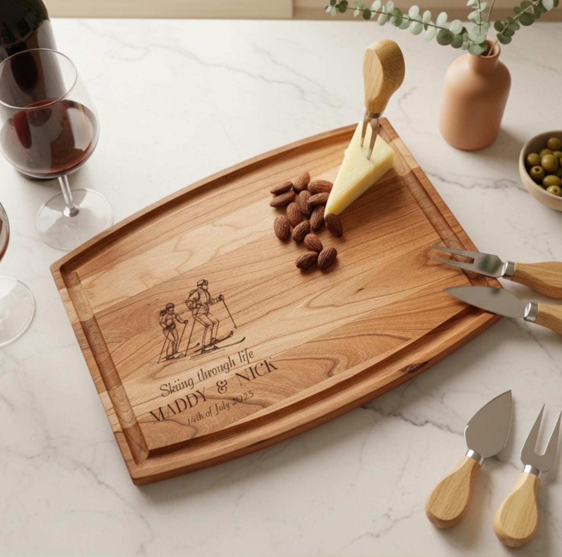 Elevate your culinary space with our Personalized Cutting Board, featuring a captivating engraving of a couple skiing. Expertly crafted from premium wood, this board is the perfect blend of art and functionality—ideal for winter sports enthusiasts and nature lovers alike.