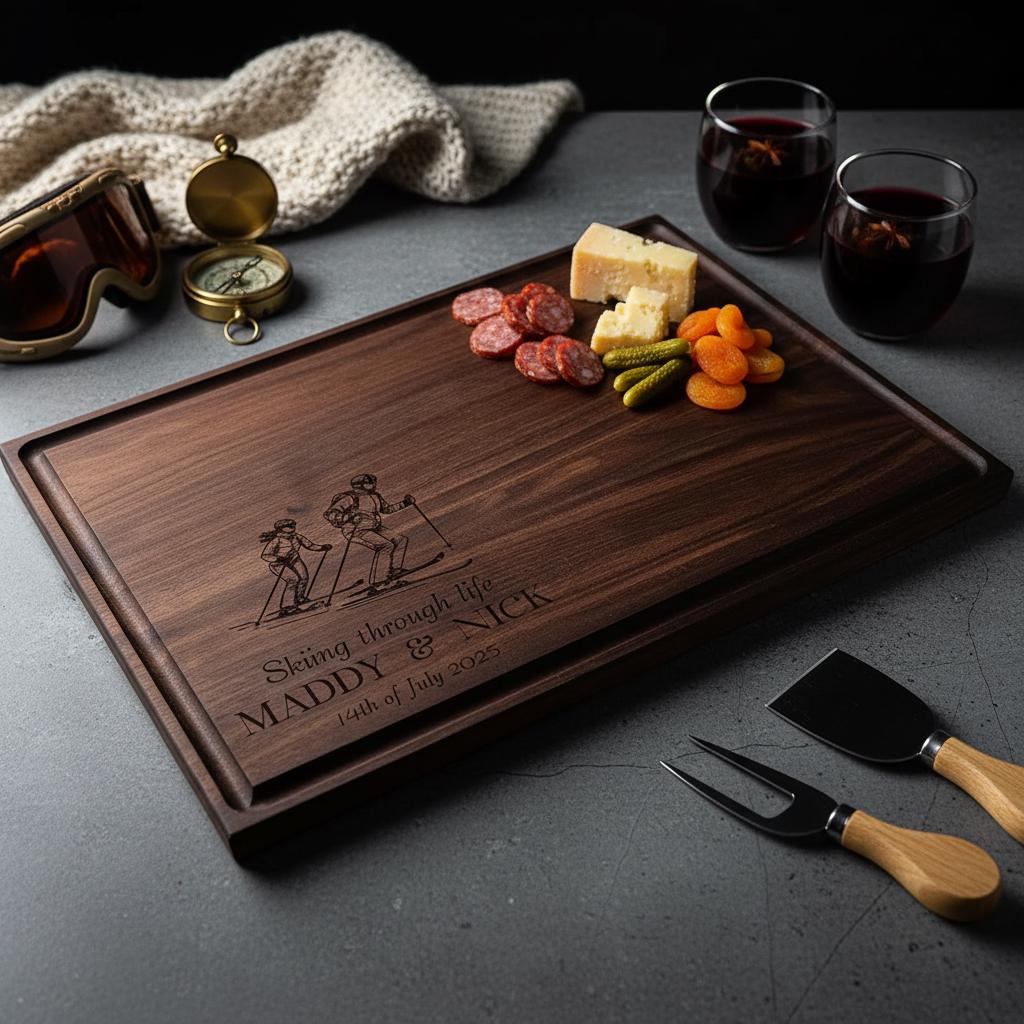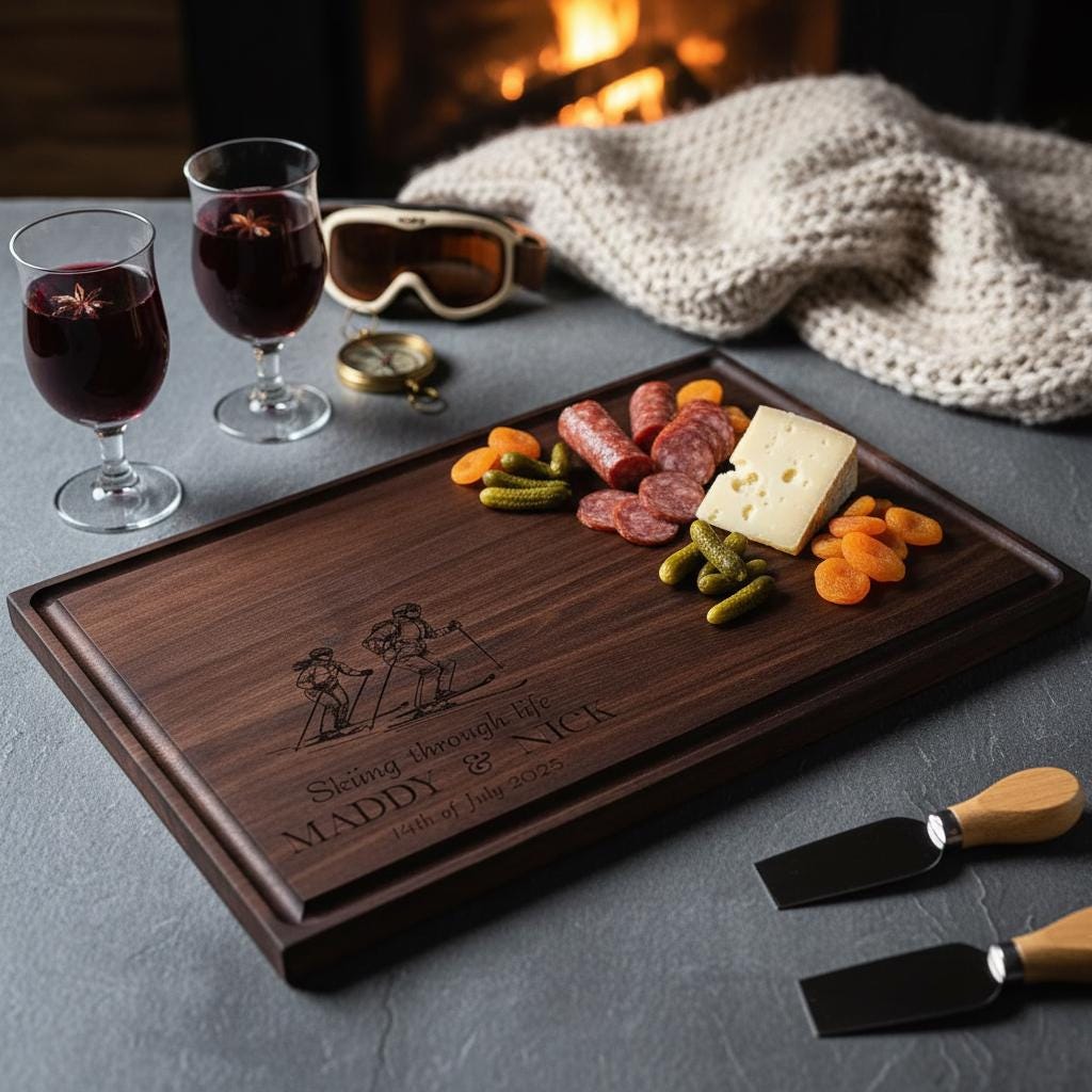 Personalized Cutting Board – Skiing Couple: Custom Engraved Charcuterie Board, Housewarming, Winter Kitchen Decor, Gift for The Couple