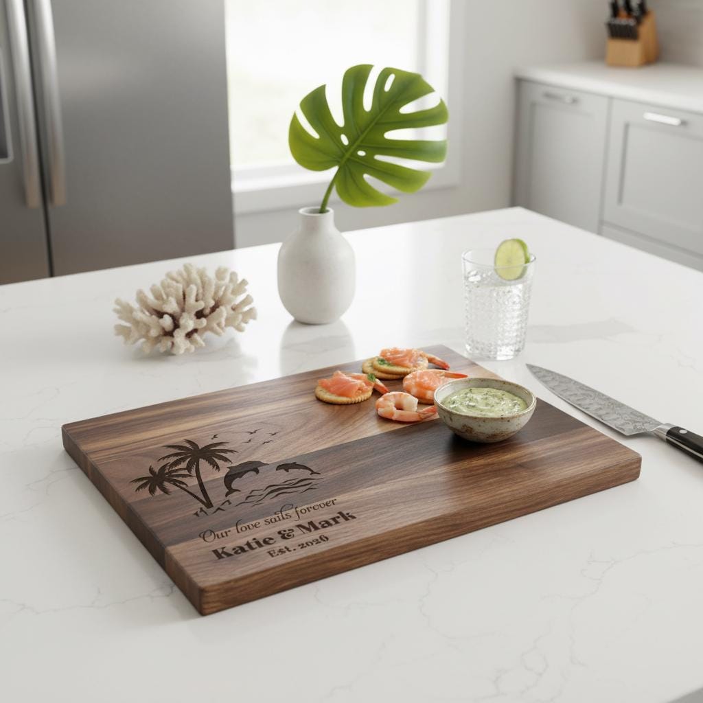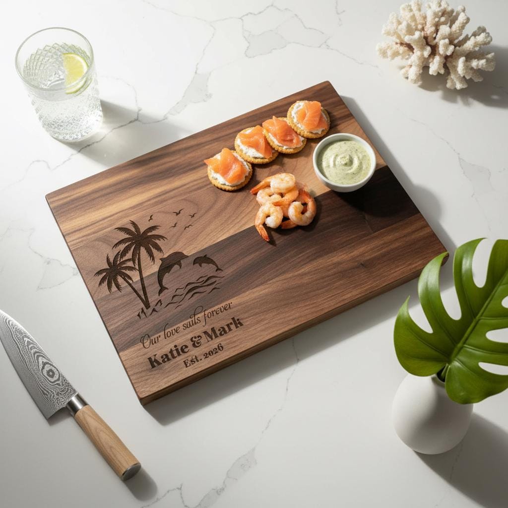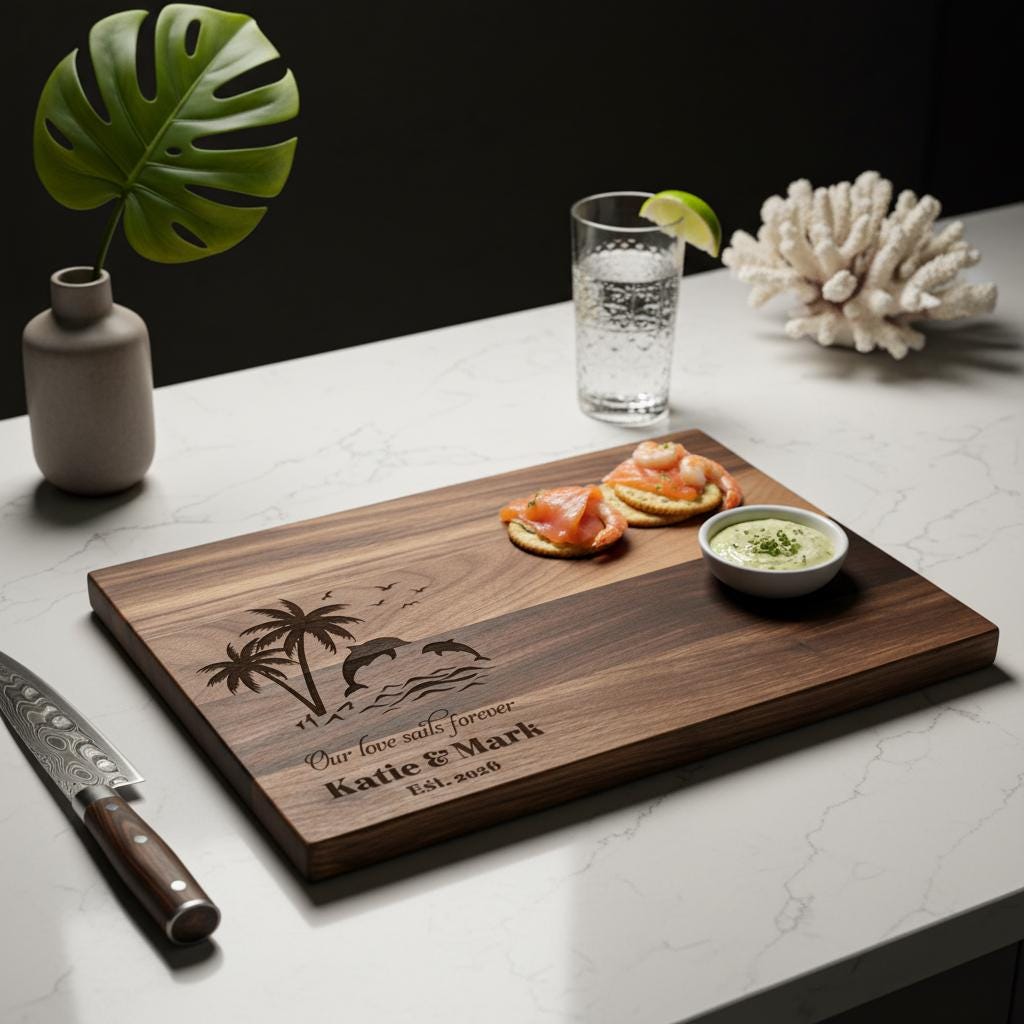 A solid wooden board engraved with palm trees, dolphins, and gentle waves, plus your chosen names and date. Its ocean‑theme makes it a conversation piece for serving cheese and appetizers, and a thoughtful gift for beach‑house owners, weddings, anniversaries, or housewarmings. Each board is hand‑finished and ready to be cherished for years.