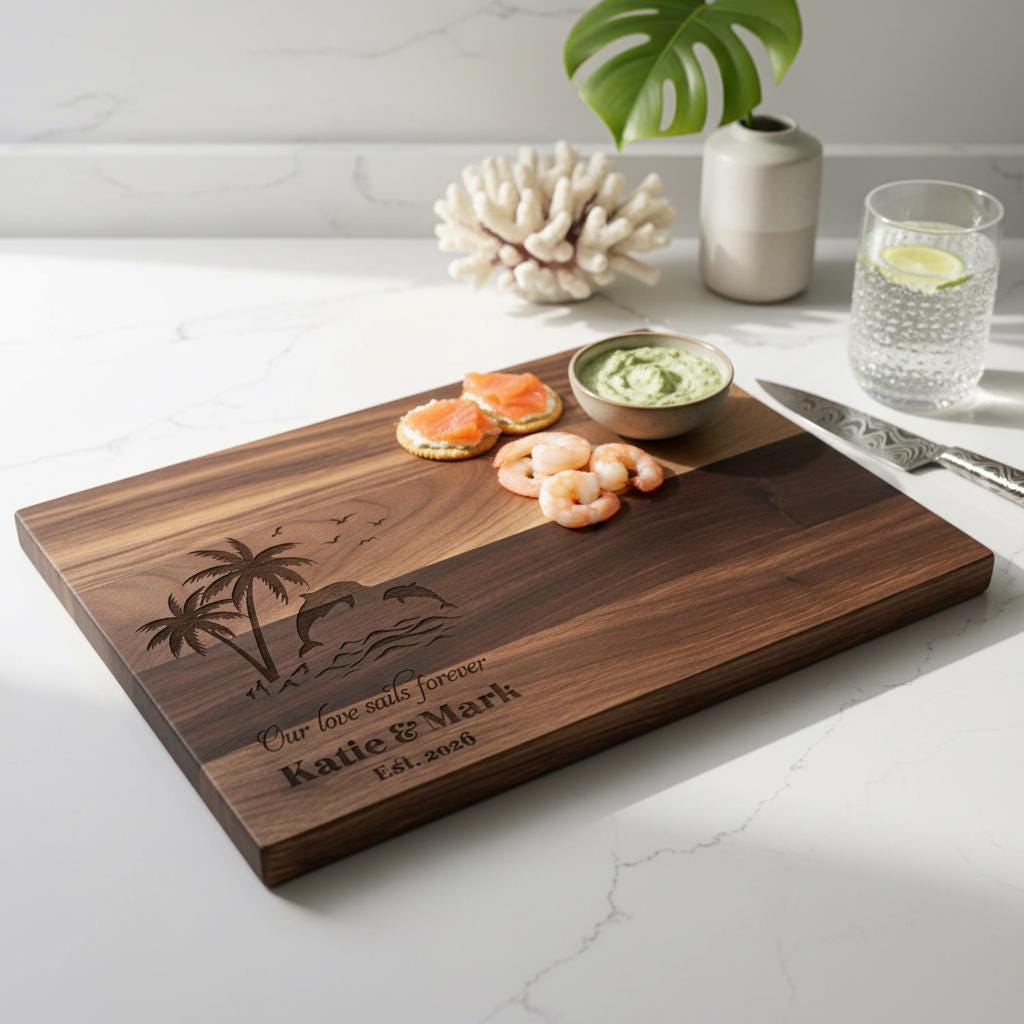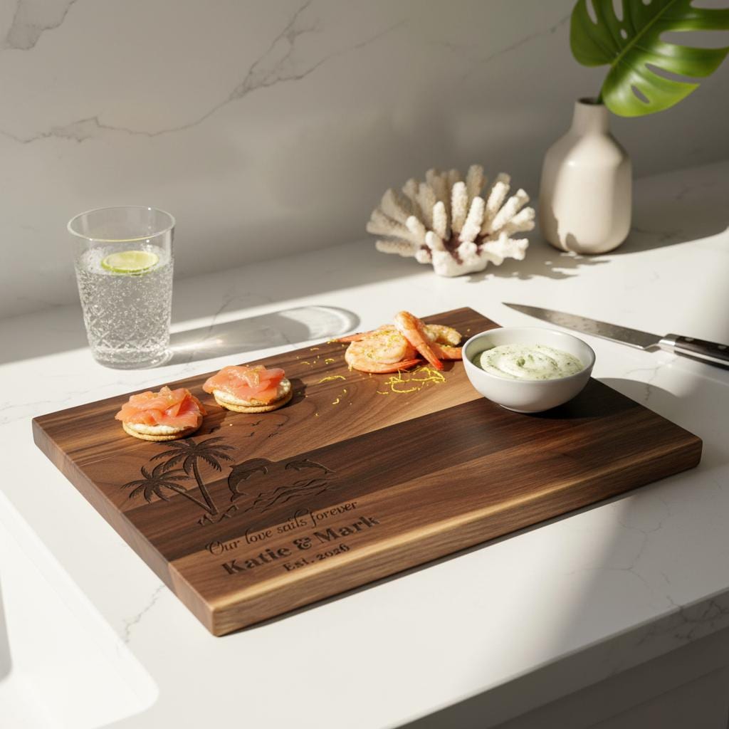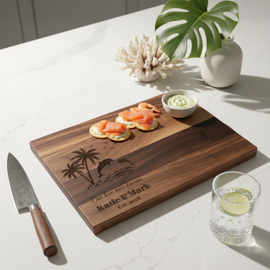 A solid wooden board engraved with palm trees, dolphins, and gentle waves, plus your chosen names and date. Its ocean‑theme makes it a conversation piece for serving cheese and appetizers, and a thoughtful gift for beach‑house owners, weddings, anniversaries, or housewarmings. Each board is hand‑finished and ready to be cherished for years.