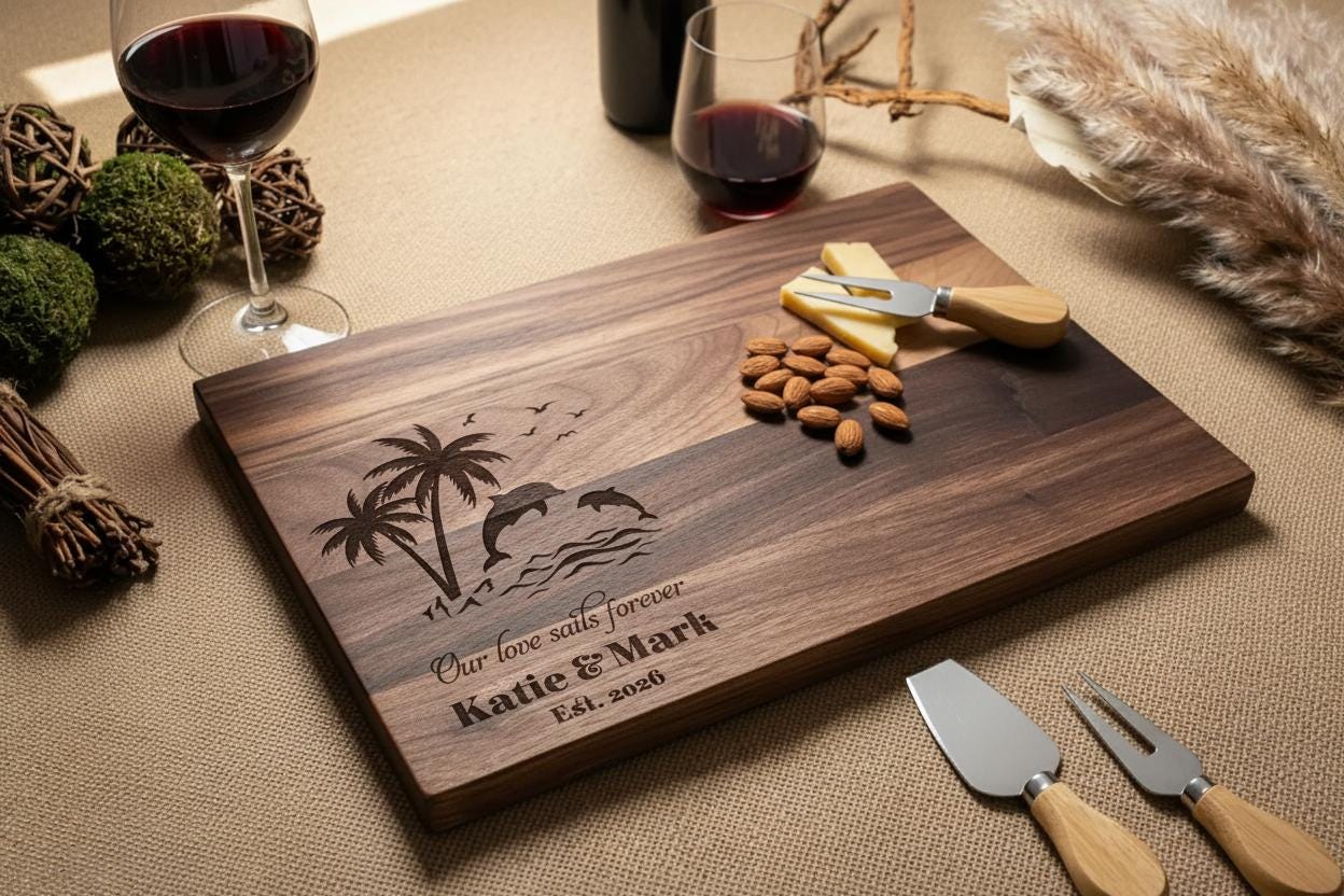 Personalized Cutting Board – Beach Themed: Custom Engraved Charcuterie Board, Ocean, Palm Trees, Dolphins Swimming, Beach House Gift