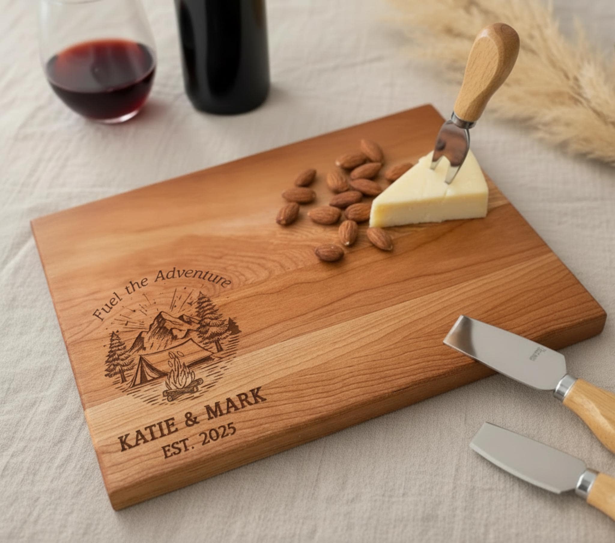 Personalized Cutting Board – Mountain Camping: Custom Engraved Charcuterie Board, Campfire, Camping Lovers, Housewarming, Wedding Gift