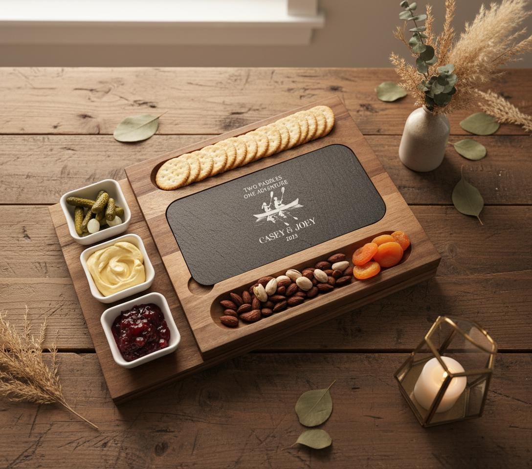 Personalized Charcuterie Set - Custom Engraved Cutting Board: Couple Canoeing, Kayak Lovers, Water Sports Enthusiasts, Wedding Gifts